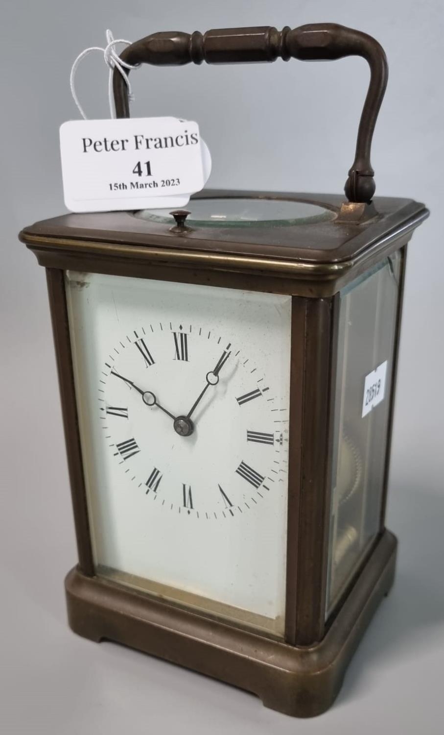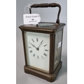 Large brass carriage clock with full depth Roman dial and repeat movement striking on one bell. 15cm high approx. (B.P. 21% + VAT)