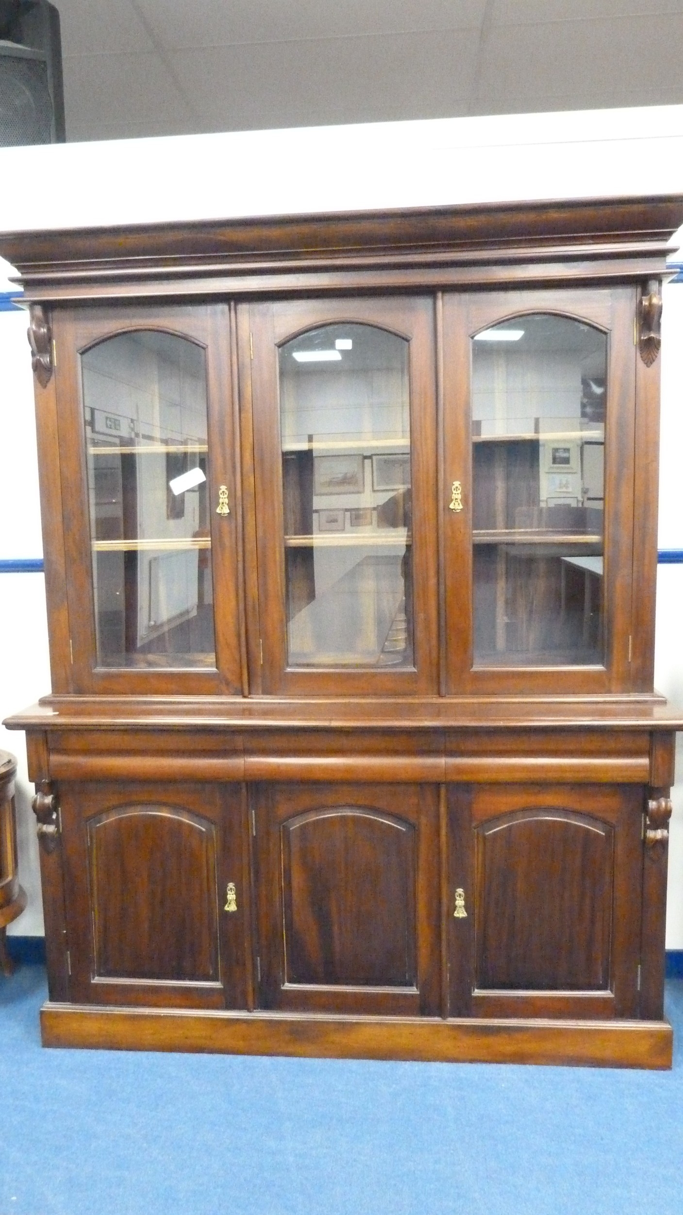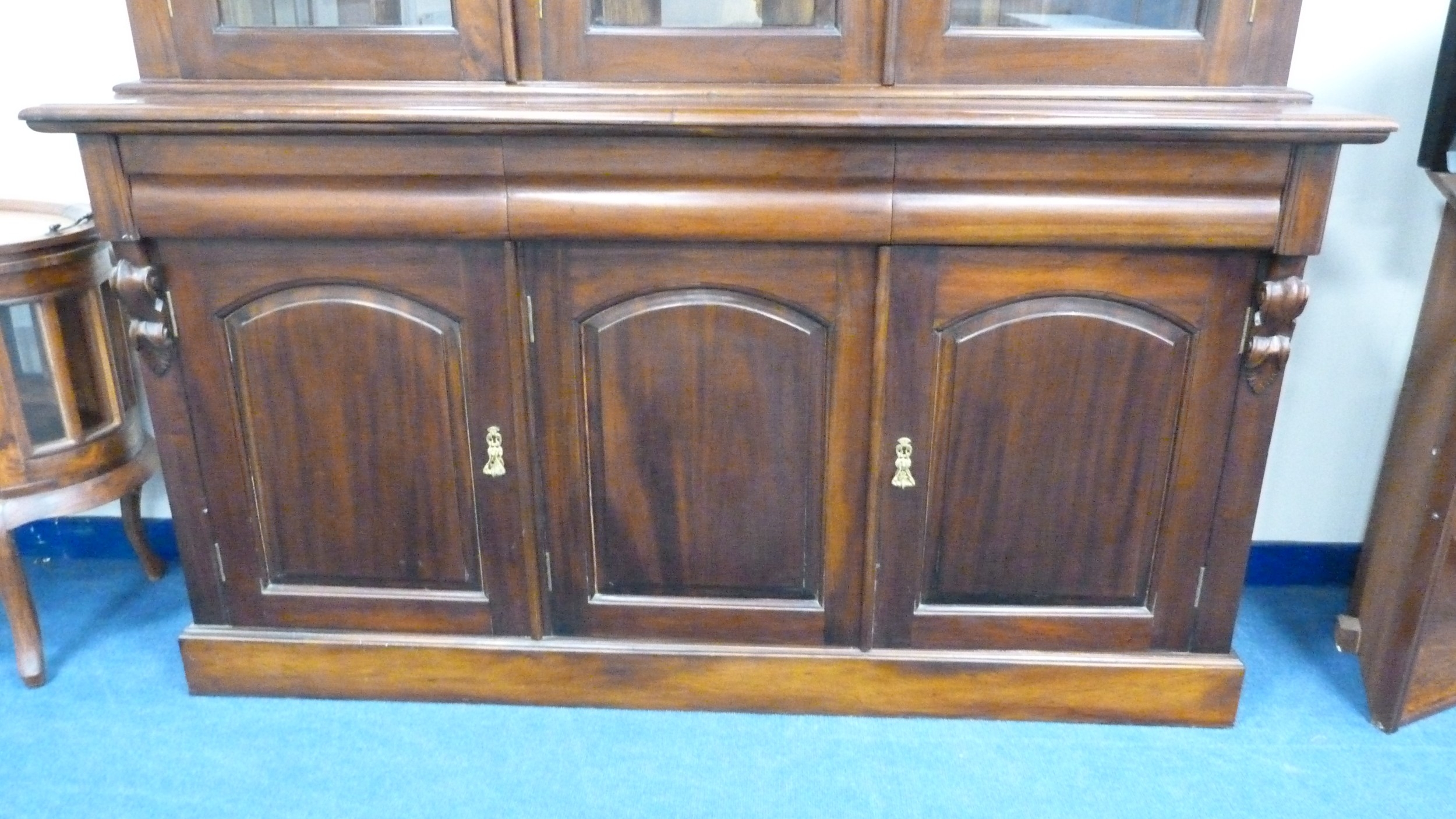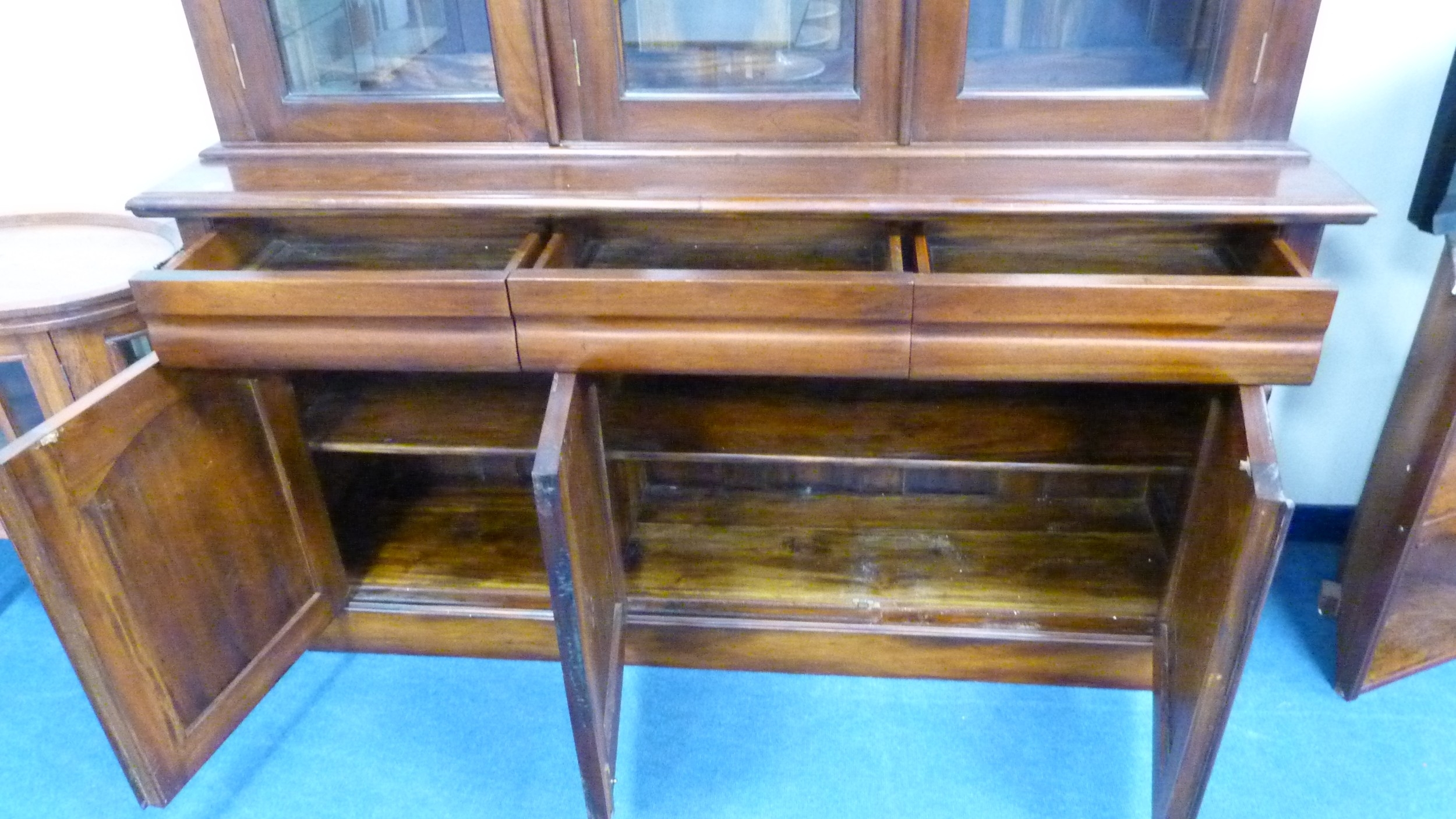Victorian-style large mahogany glazed bookcase/display cabinet on chiffonier three-drawer cupboard base.