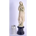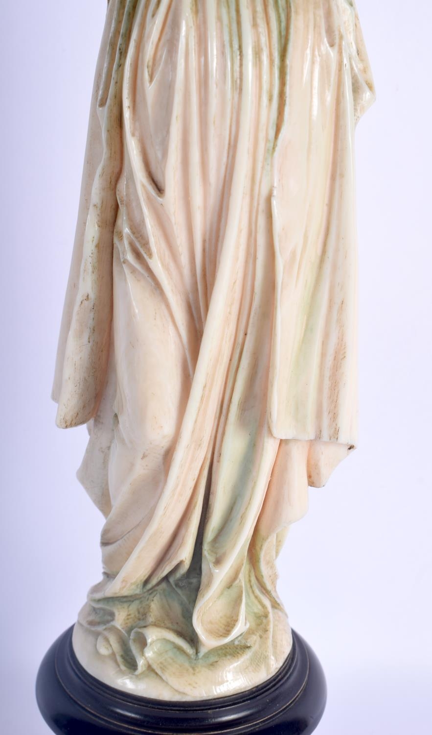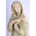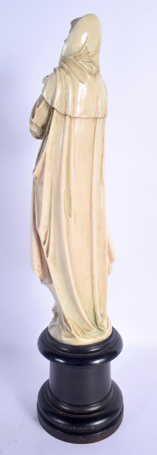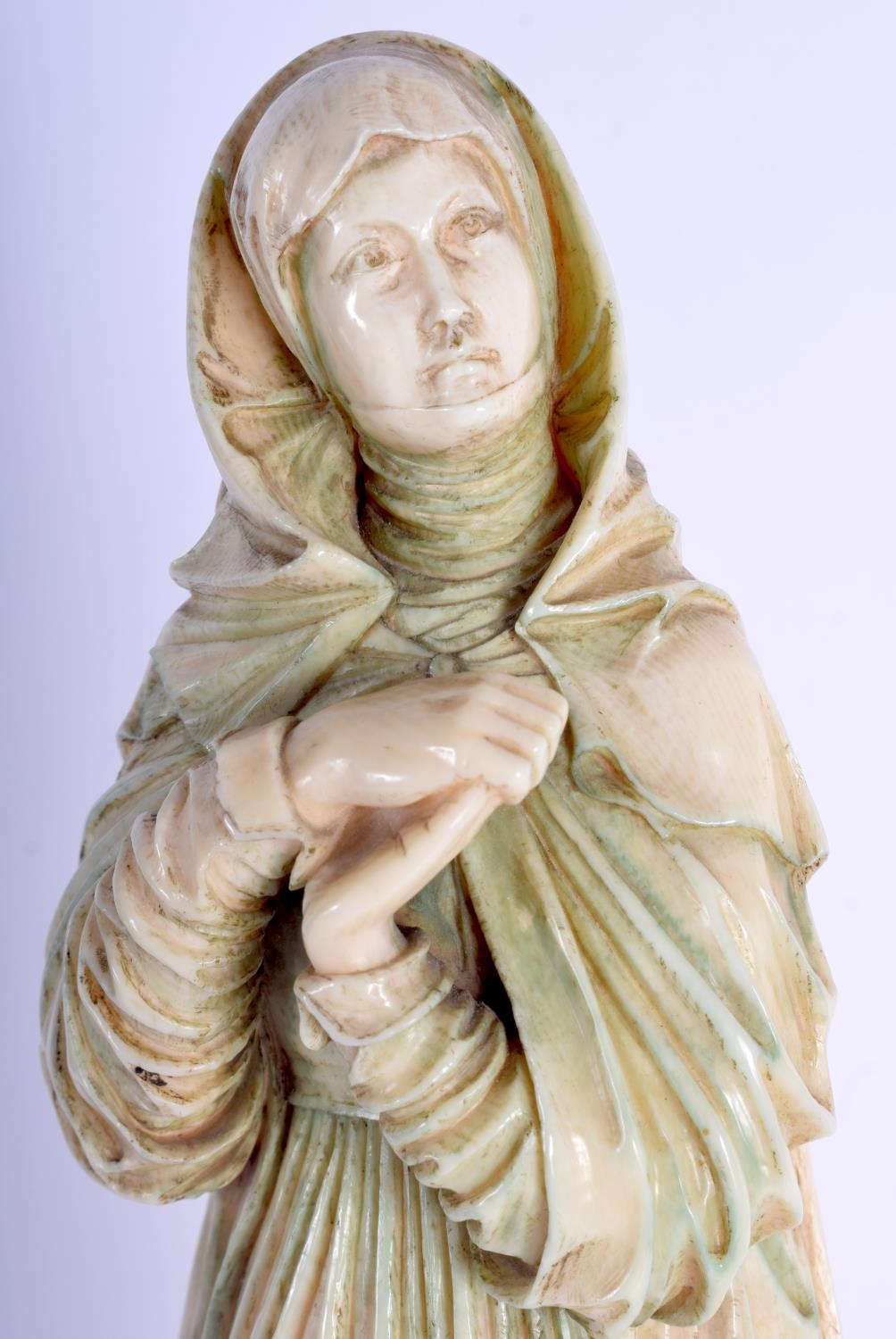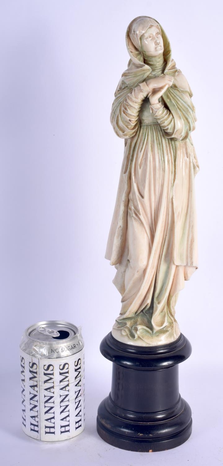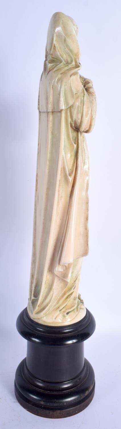 A LARGE 19TH CENTURY EUROPEAN DIEPPE POLYCHROMED IVORY FIGURE OF A SAINT modelled with hands clasped upon an ebonised base. Ivory 33 cm high.