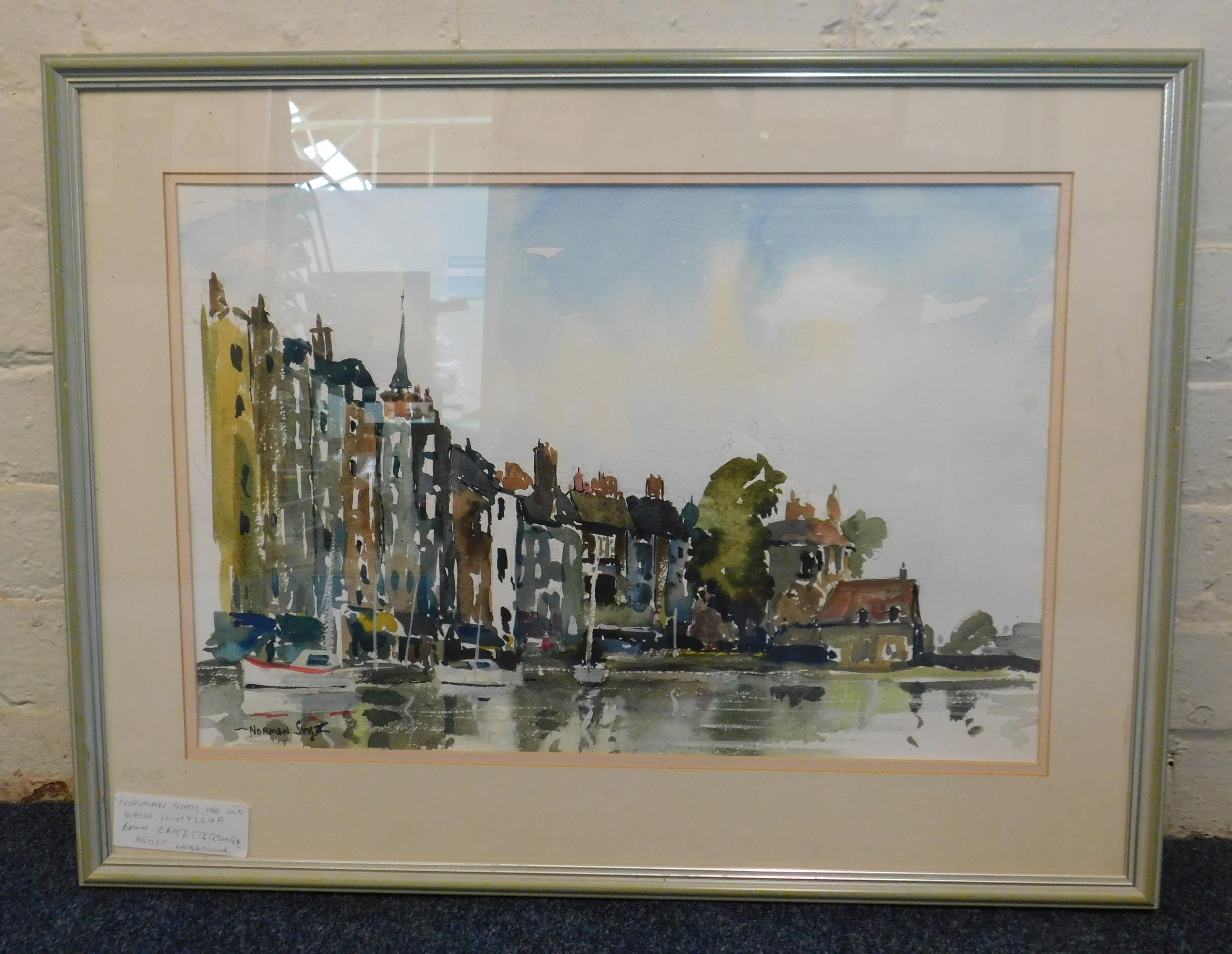 The Old Basin Honfleur watercolour by Norman Sims - details to the reverse, approximate dimensions 27x21"