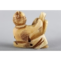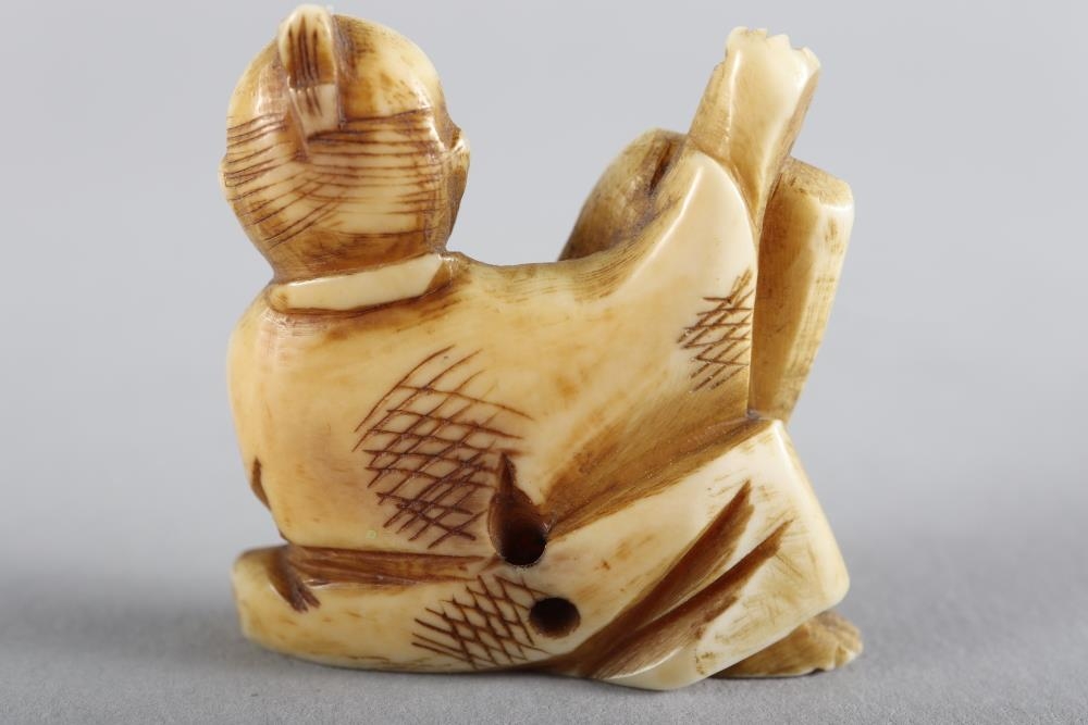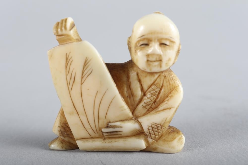 An early 20th century carved ivory netsuke, formed as a seated man with scroll, 1 1/4" high COLLECT