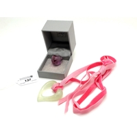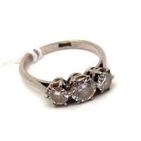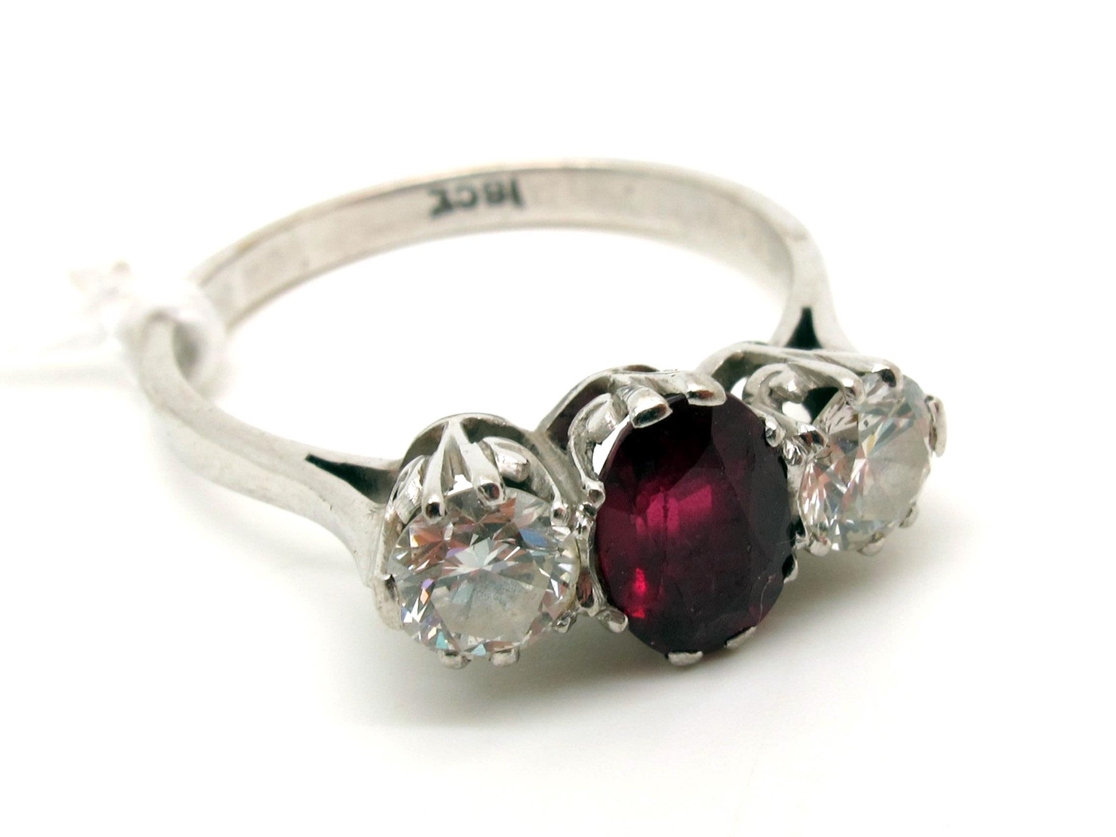 A Ruby and Diamond Three Stone Ring, claw set with brilliant cut stones, stamped “18ct” (finger size P).