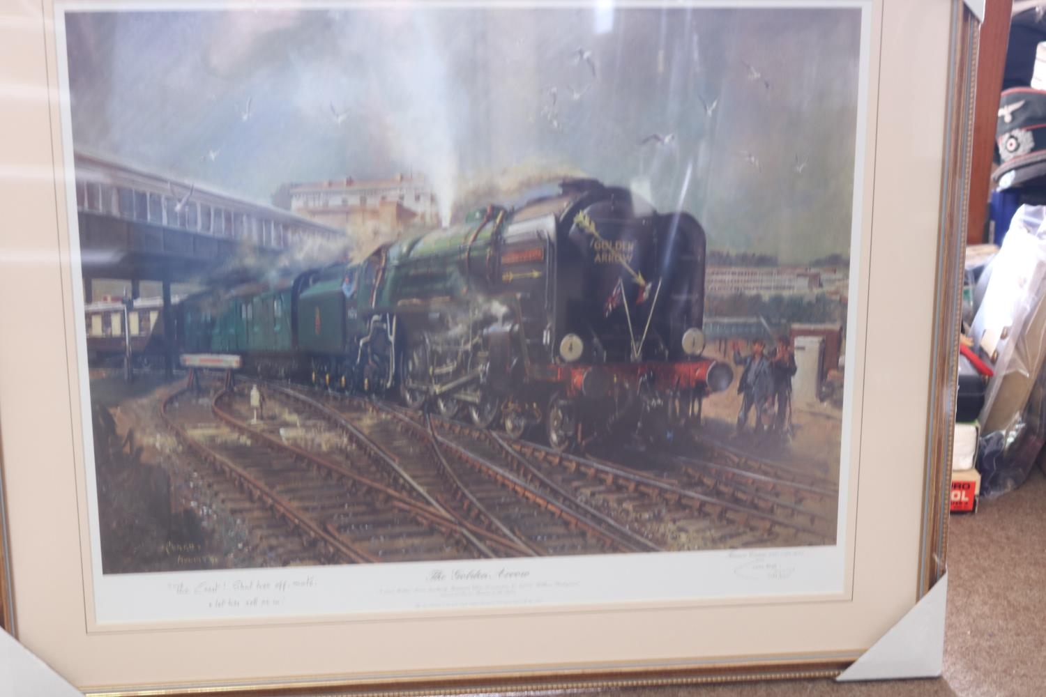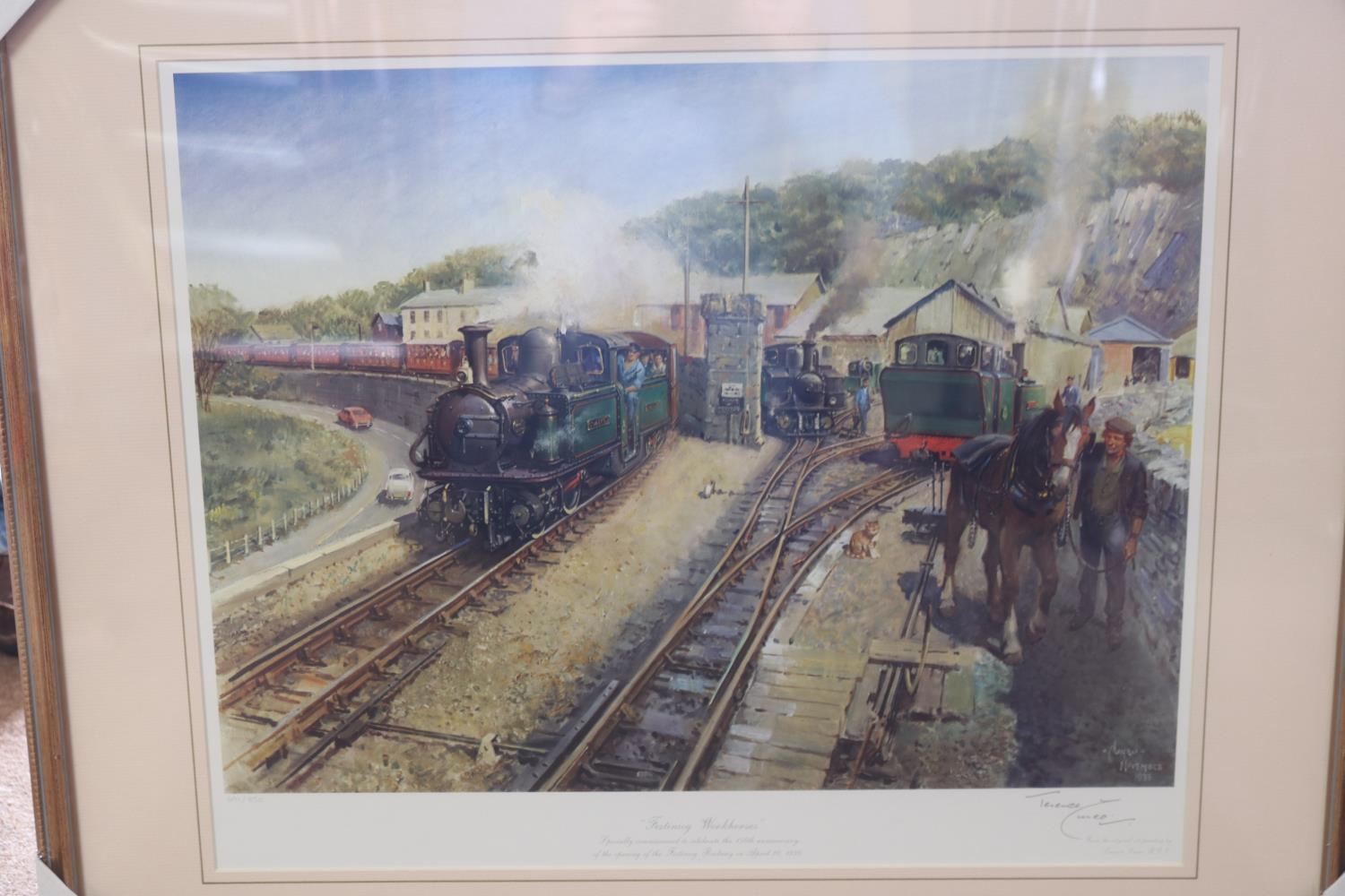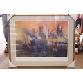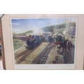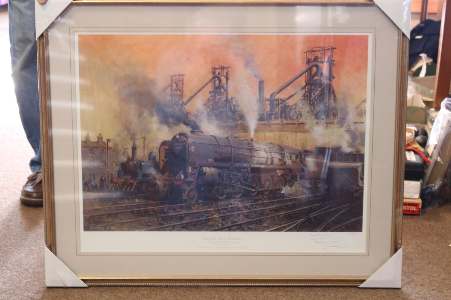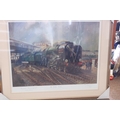 3x framed signed railway prints by Terence Cuneo. Festiniog Workhorses. The Golden Arrow, showing a BR Britainna Class 4-6-2 loco, William Shakespeare 70004. Last of the Steam Workhorses, showing a BR Class 9F in it's final days. All signed in the lower right border. All well mounted and framed with gallery certificates. Approx dimensions of each in frame, 810mm x 660mm. VGC-Mint. £40-60
