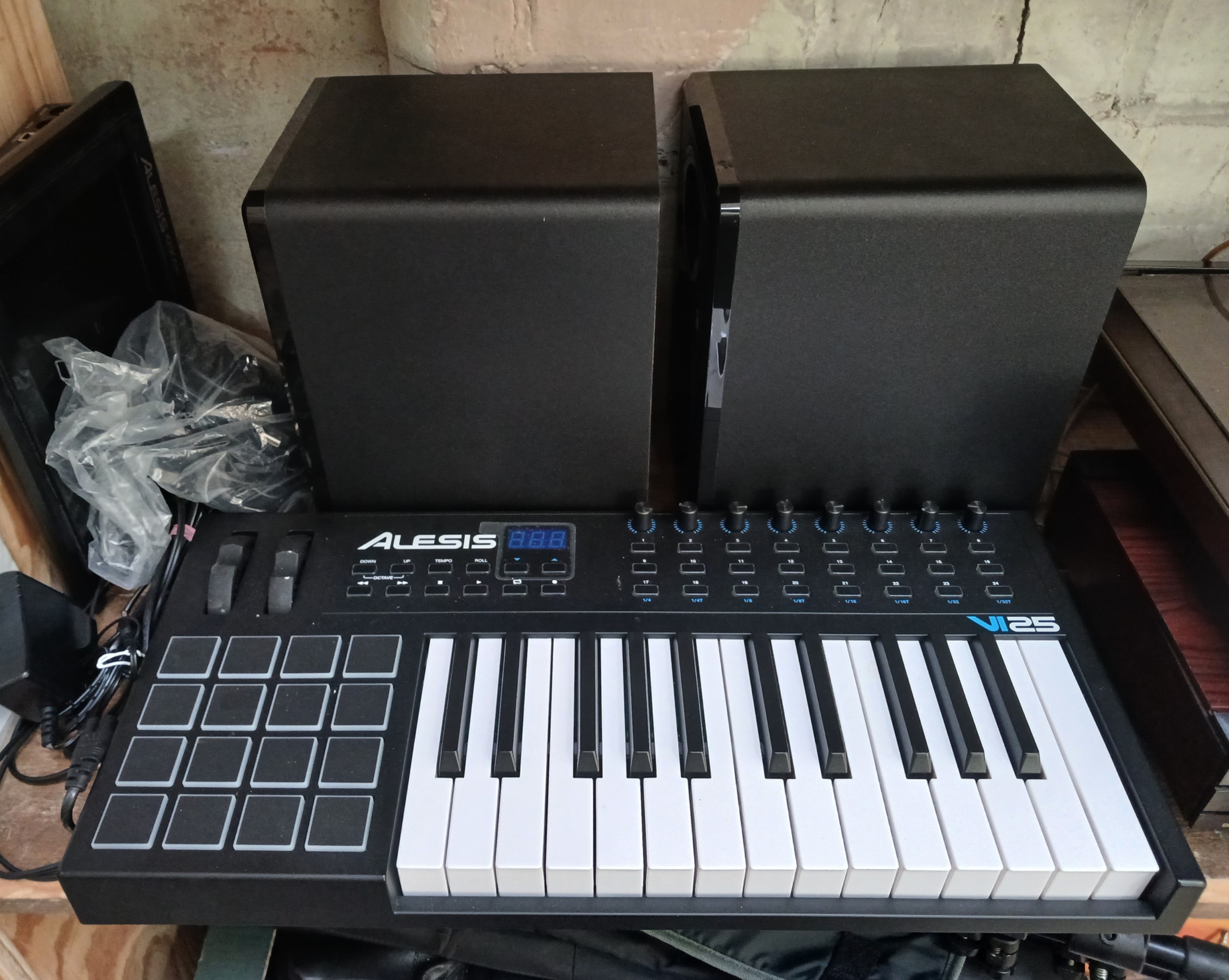 An Alesis VI25 midi keyboard/controller with a pair of Alesis Elevate 5 MKII speakers and stands and an Alesis IO dock.