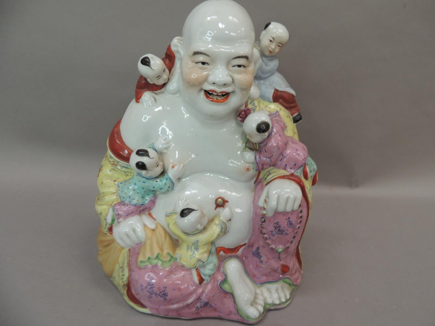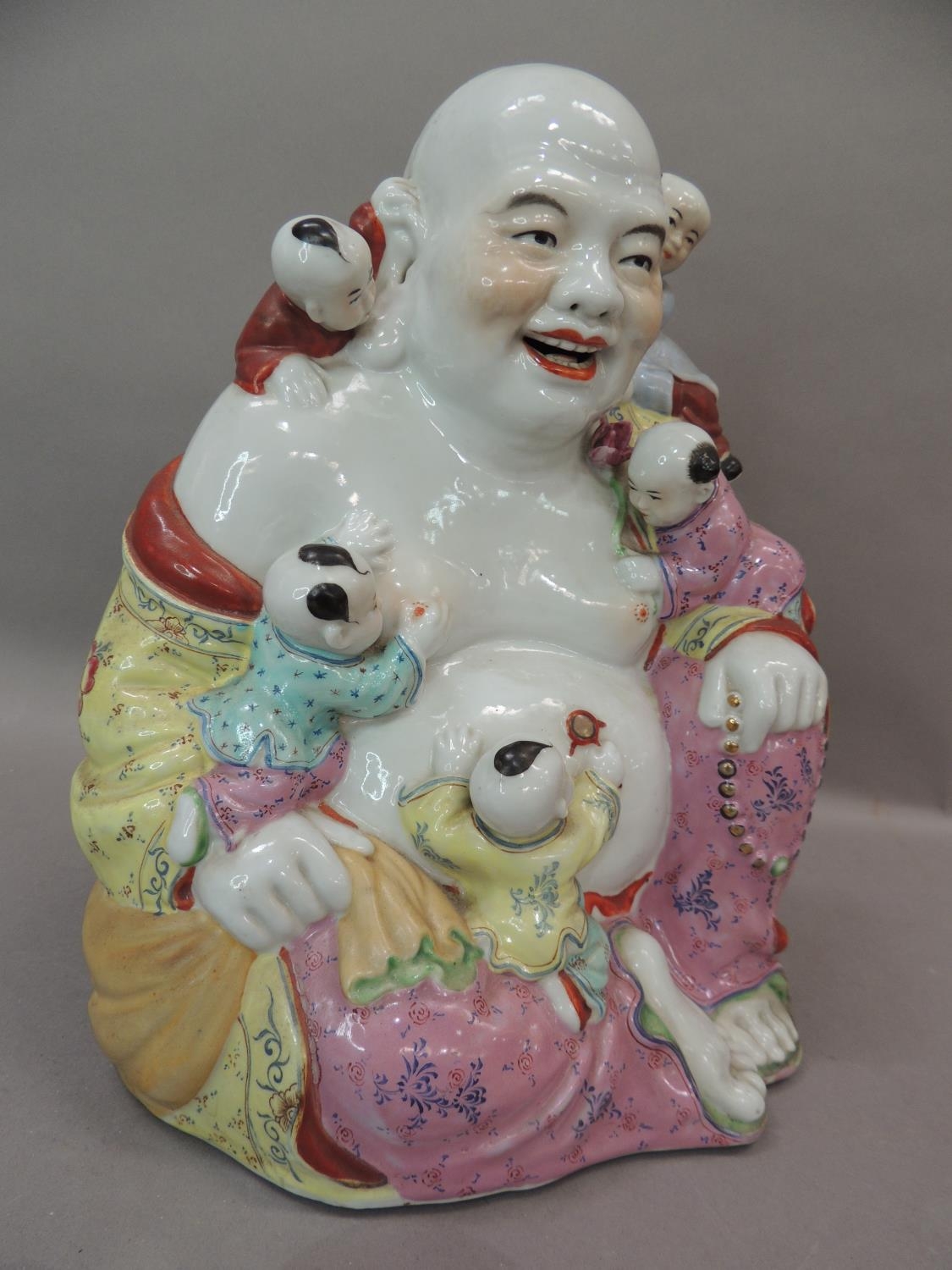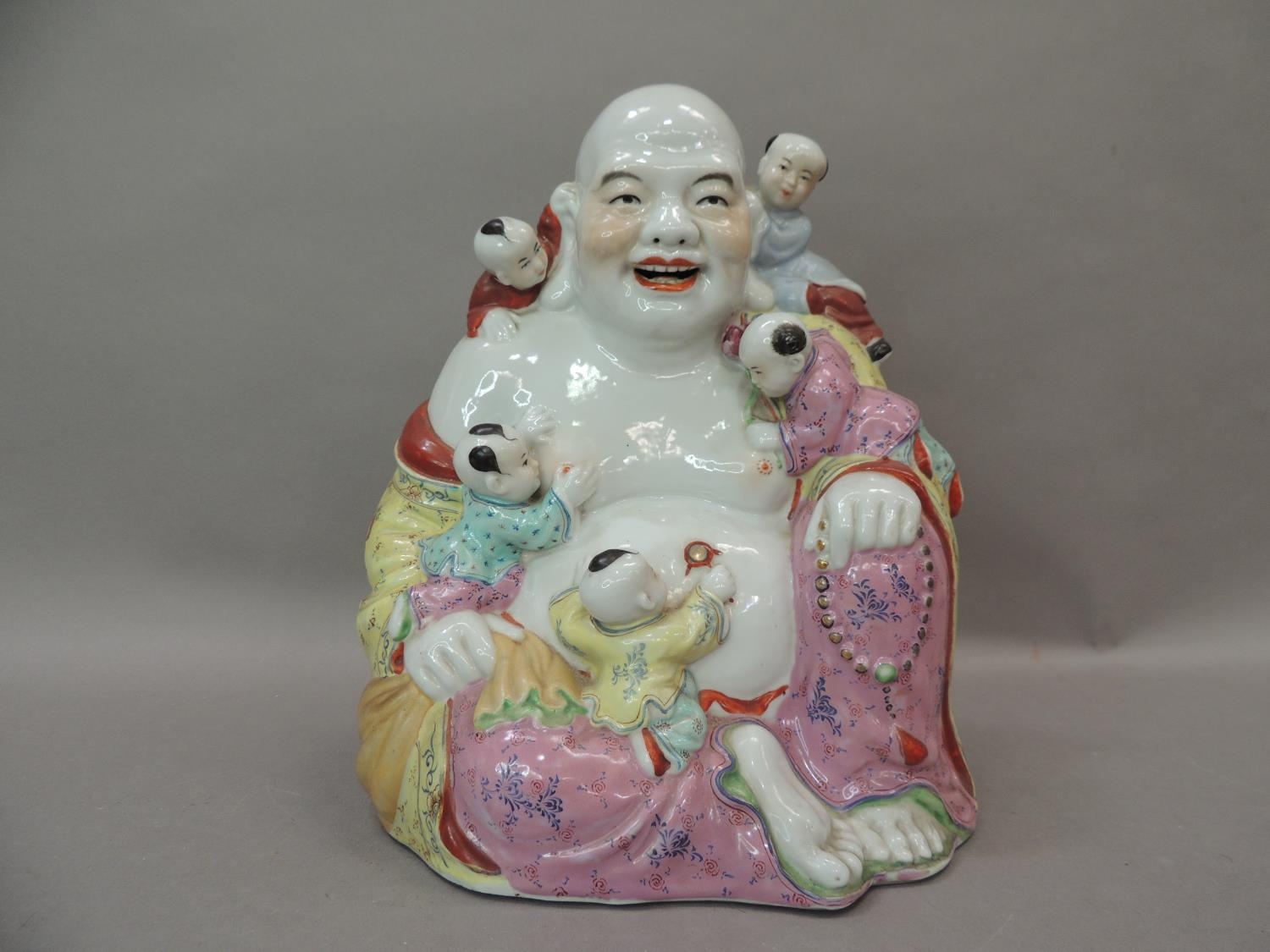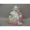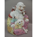 A ceramic figure of Hotei, the buddha with small children climbing over him, 25cm high