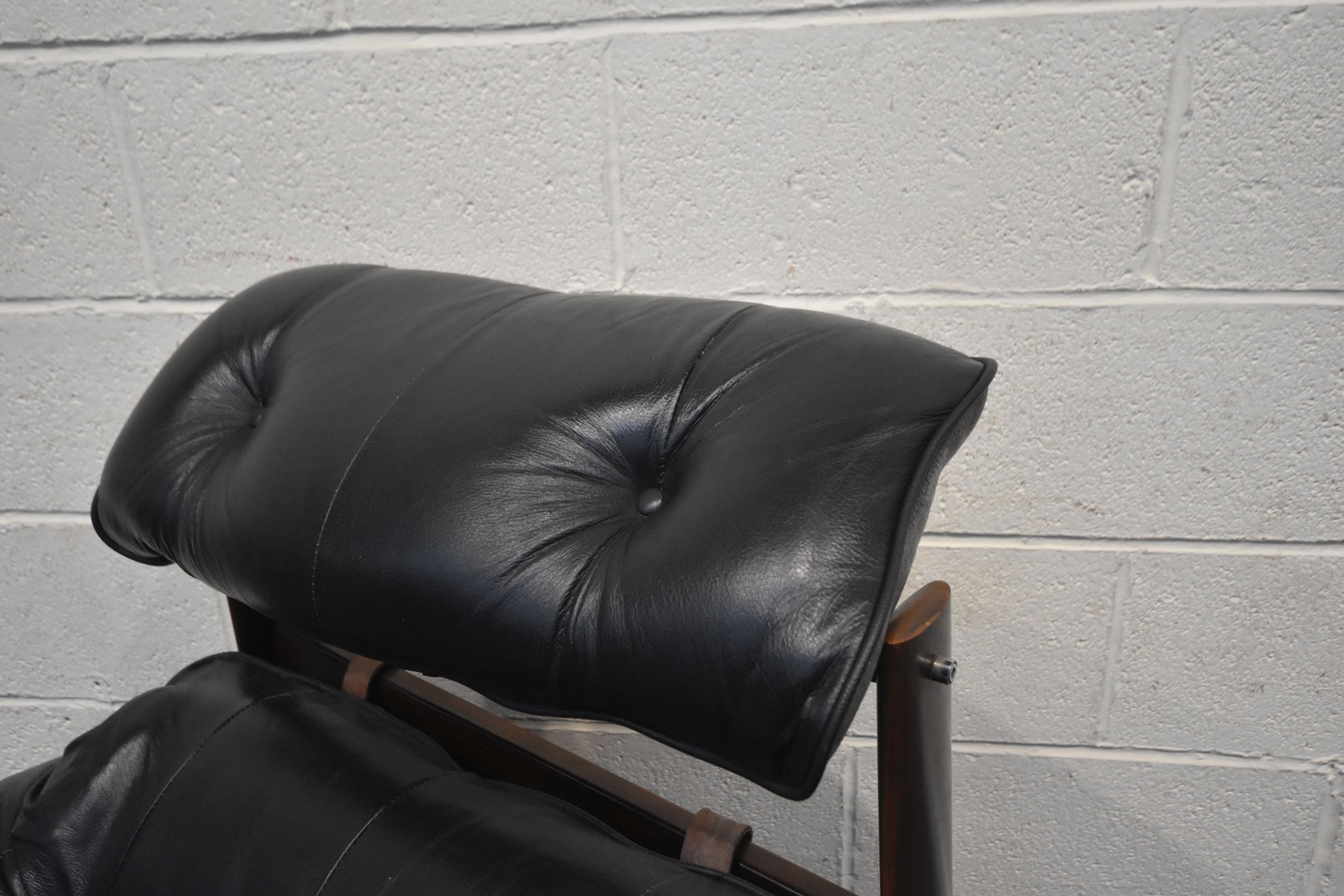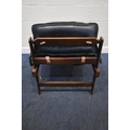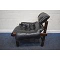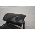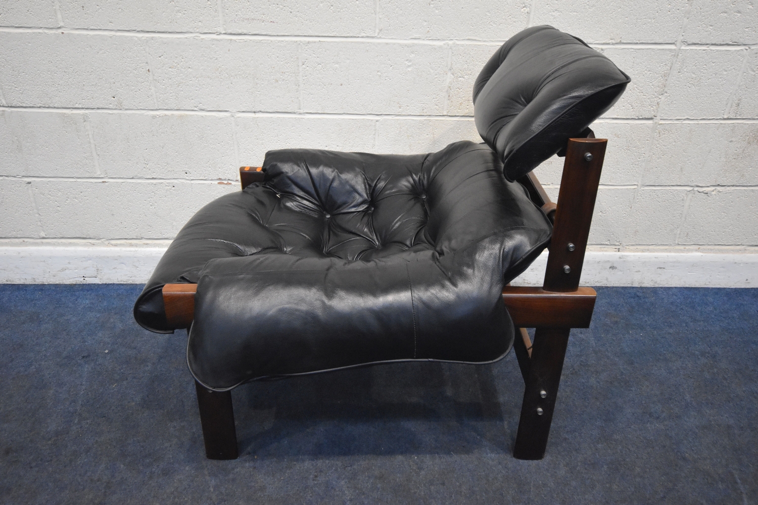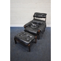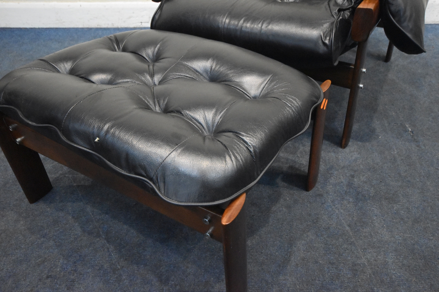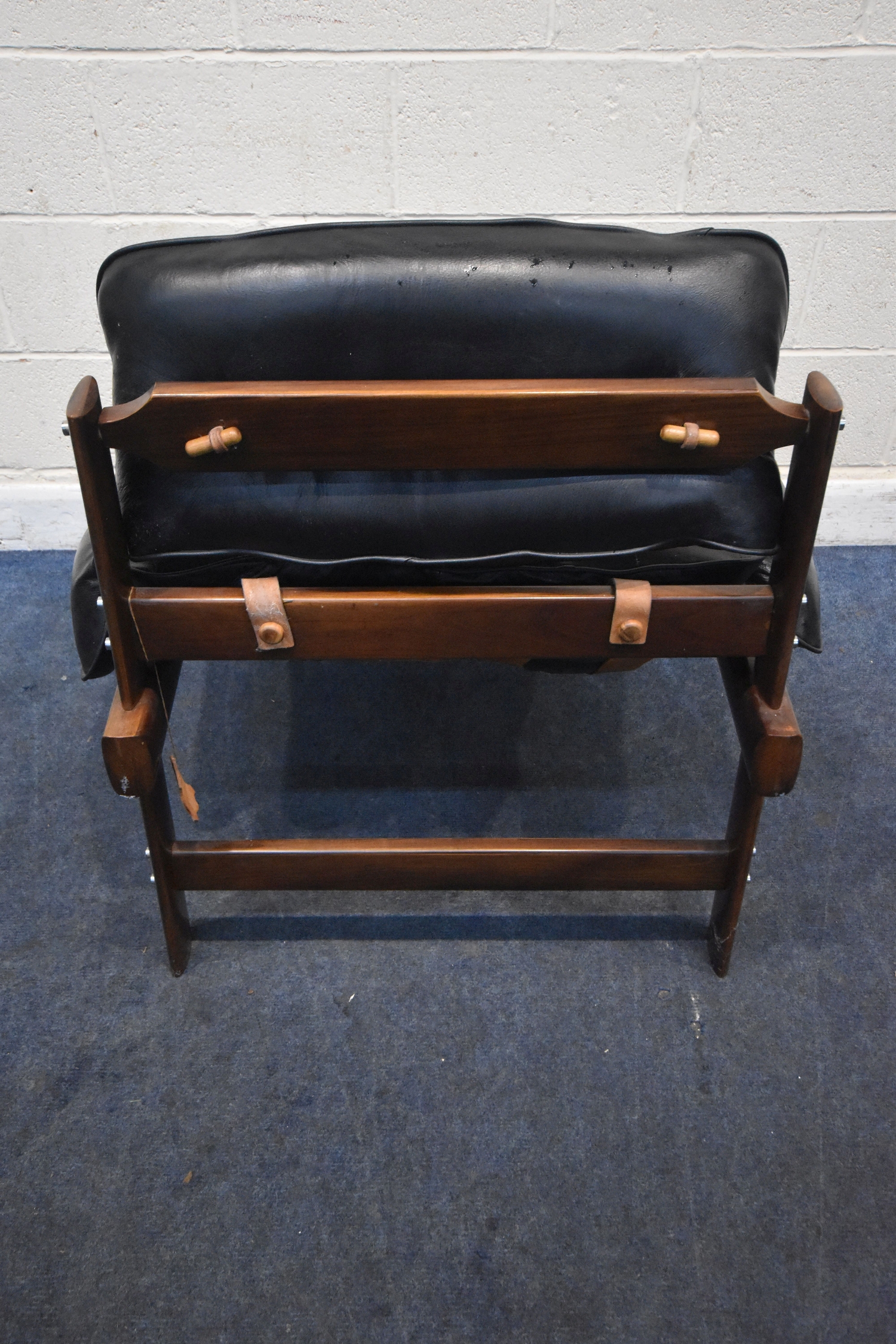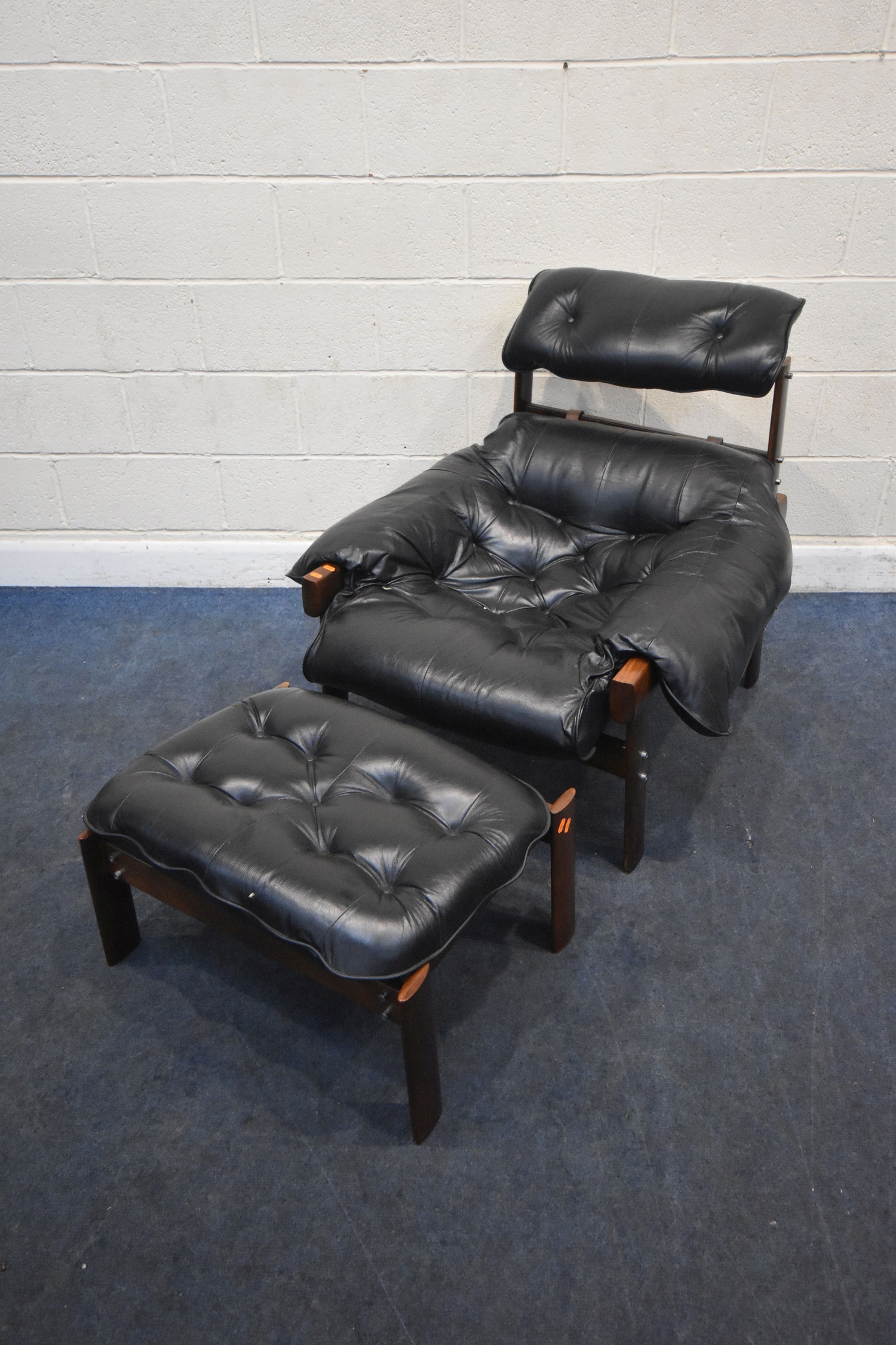 POSSIBLY PERCIVAL LAFER, A MID CENTURY BRAZILIAN ROSEWOOD FRAMED MP-43 ARMCHAIR, with black leather upholstery, width 94cm x frame width 75cm x depth 100cm x height 90cm, along with a matching footstool, condition report: neither the chair or stool have fire regulation labels, so do not comply with the Furniture and Furnishings fire Safety Regulations 1988 and for this reason it should not be used in a private dwelling, no visible makers marks, no rips or tears, general signs of usage, Note: Sold in compliance with CITES regulations, with (non-transferable) Transaction Specific certificate number 26GBA10IZOV9O, Please be aware that this lot contains material which may be subject to import/export restrictions, especially outside the EU, due to CITES regulations. Please note it is the buyer's sole responsibility to obtain any relevant export or import licence. For more information, visit http://www.defra.gov.uk/ahvla-en/imports-exports/cites (2)