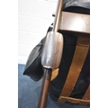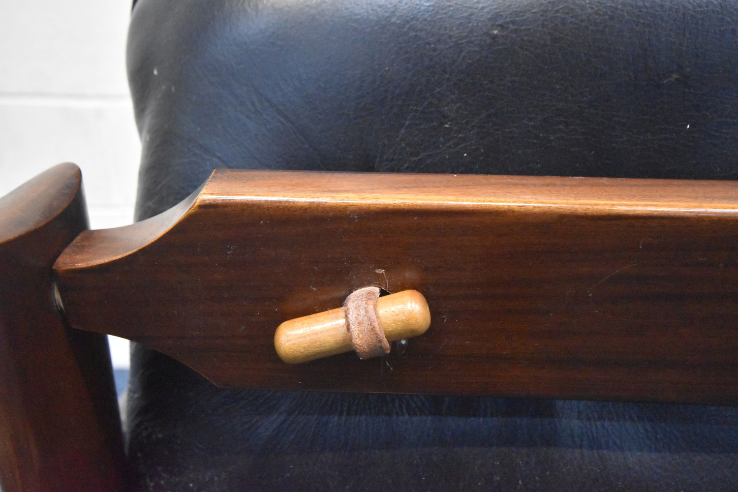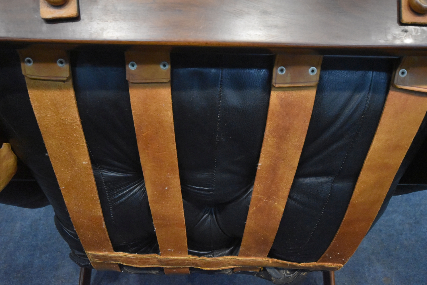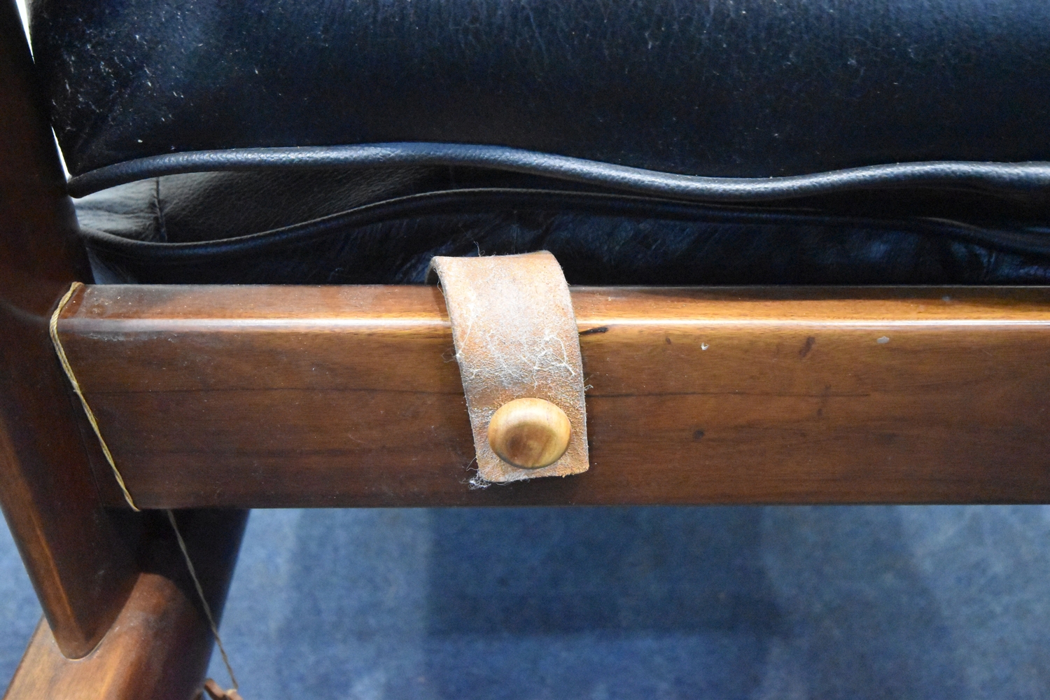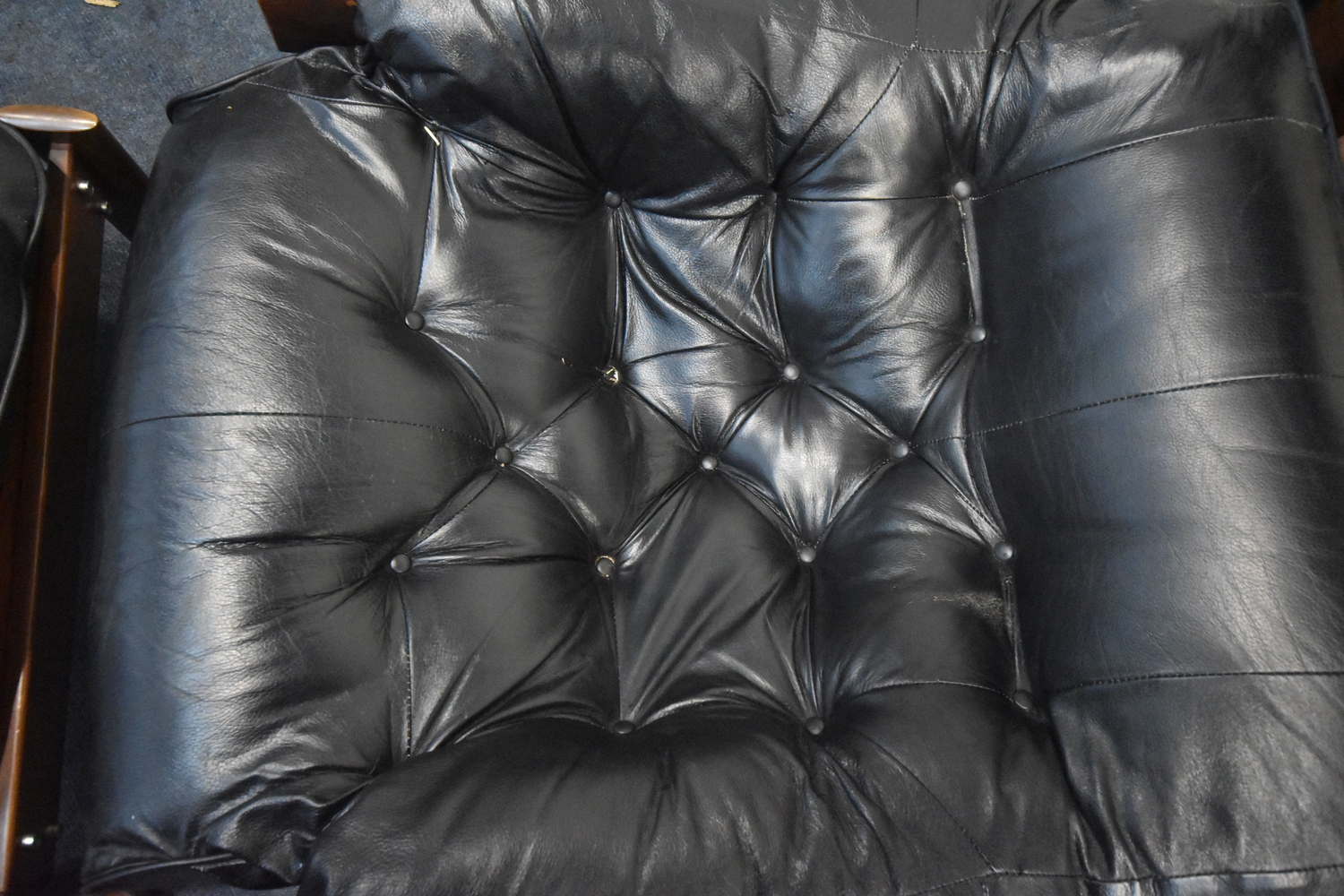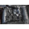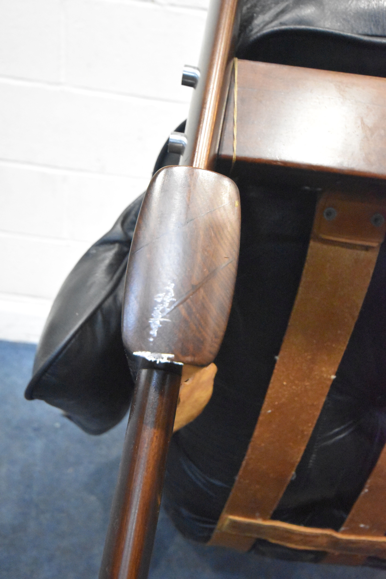 POSSIBLY PERCIVAL LAFER, A MID CENTURY BRAZILIAN ROSEWOOD FRAMED MP-43 ARMCHAIR, with black leather upholstery, width 94cm x frame width 75cm x depth 100cm x height 90cm, along with a matching footstool, condition report: neither the chair or stool have fire regulation labels, so do not comply with the Furniture and Furnishings fire Safety Regulations 1988 and for this reason it should not be used in a private dwelling, no visible makers marks, no rips or tears, general signs of usage, Note: Sold in compliance with CITES regulations, with (non-transferable) Transaction Specific certificate number 26GBA10IZOV9O, Please be aware that this lot contains material which may be subject to import/export restrictions, especially outside the EU, due to CITES regulations. Please note it is the buyer's sole responsibility to obtain any relevant export or import licence. For more information, visit http://www.defra.gov.uk/ahvla-en/imports-exports/cites (2)