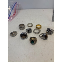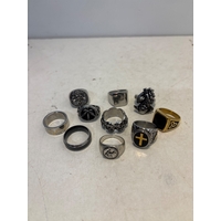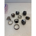 Mixed-metal rings with various designs, skull motifs, and embellishments.
