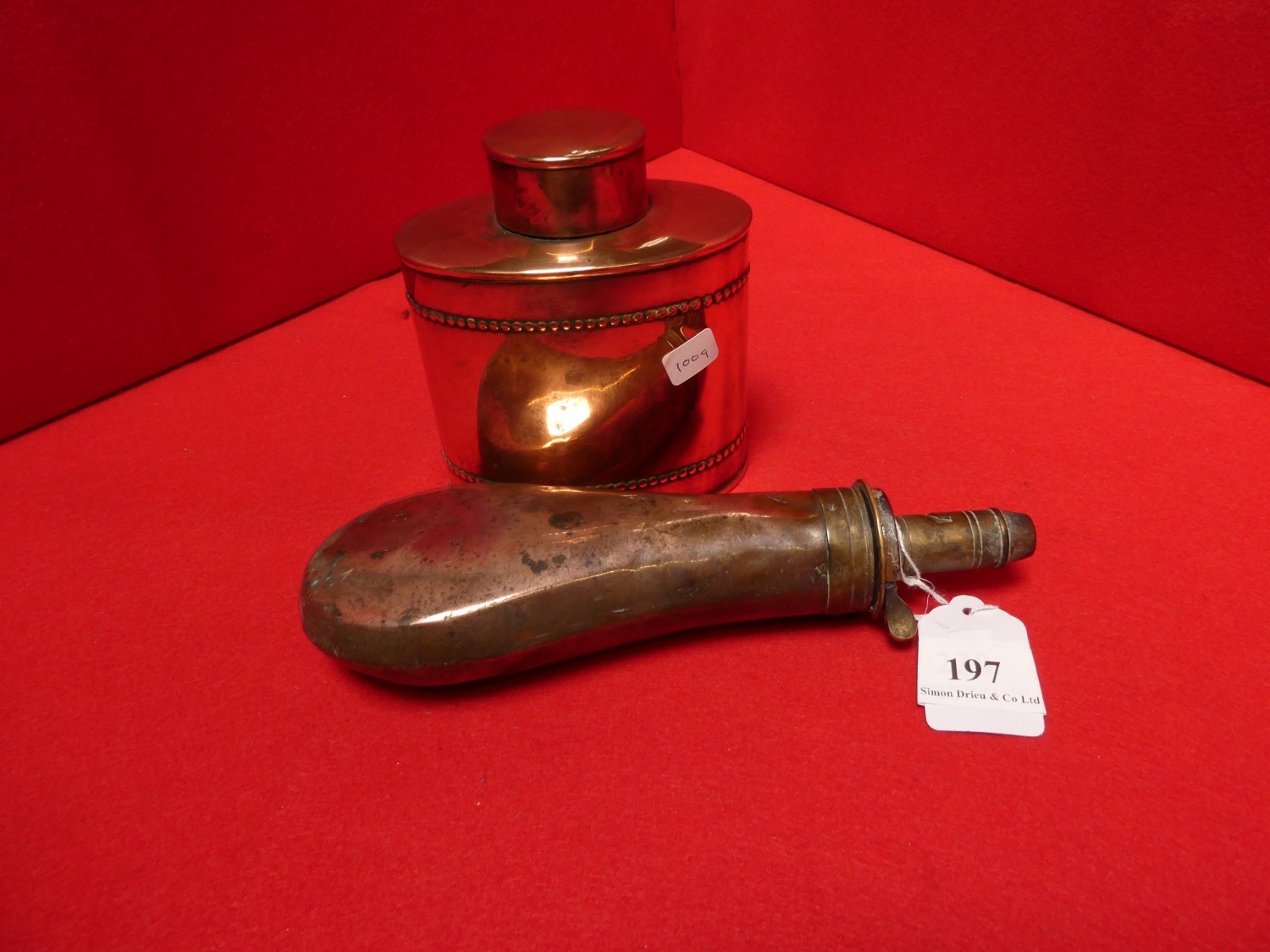 A vintage copper shot flask together with a vintage lidded copper canister