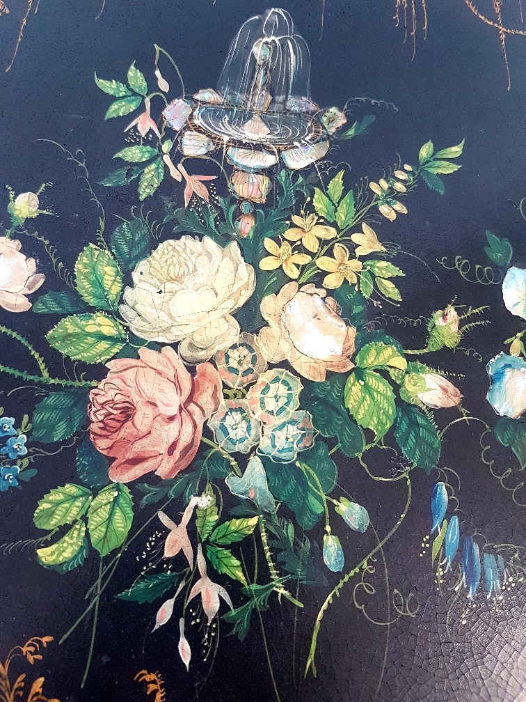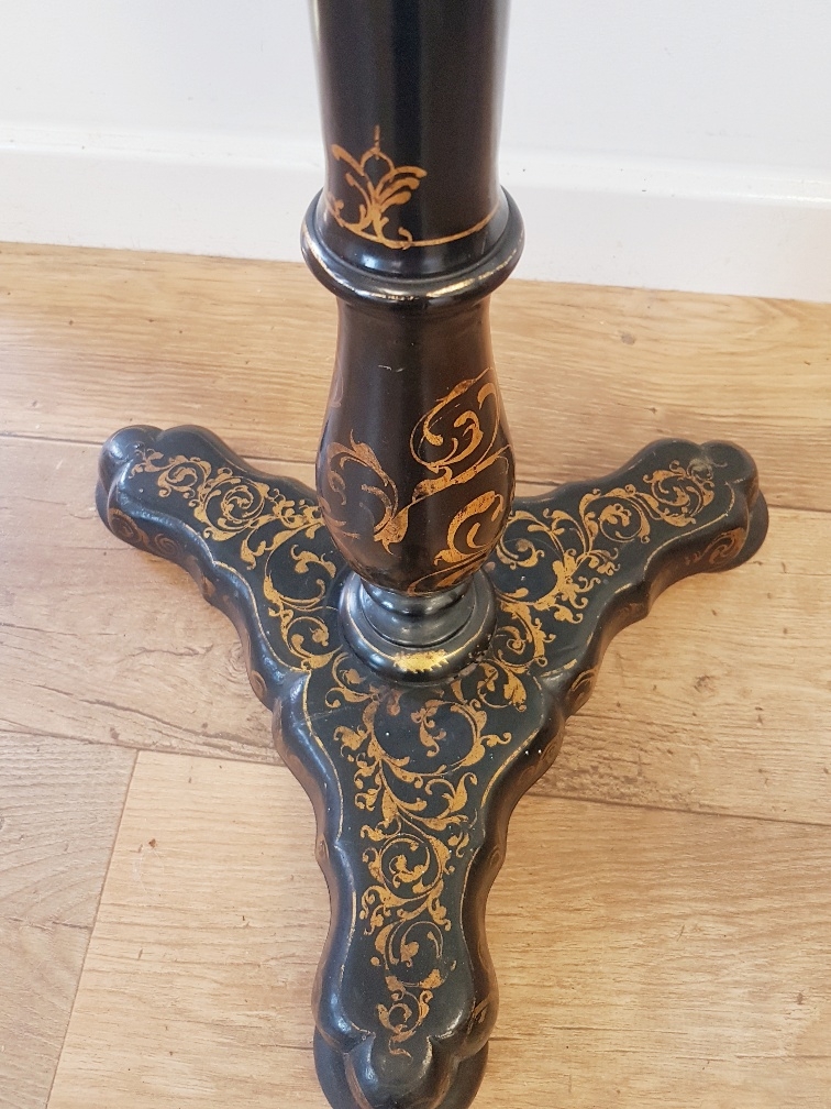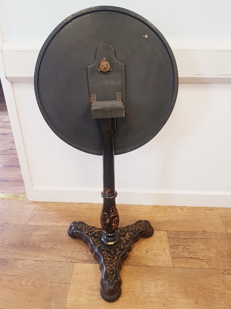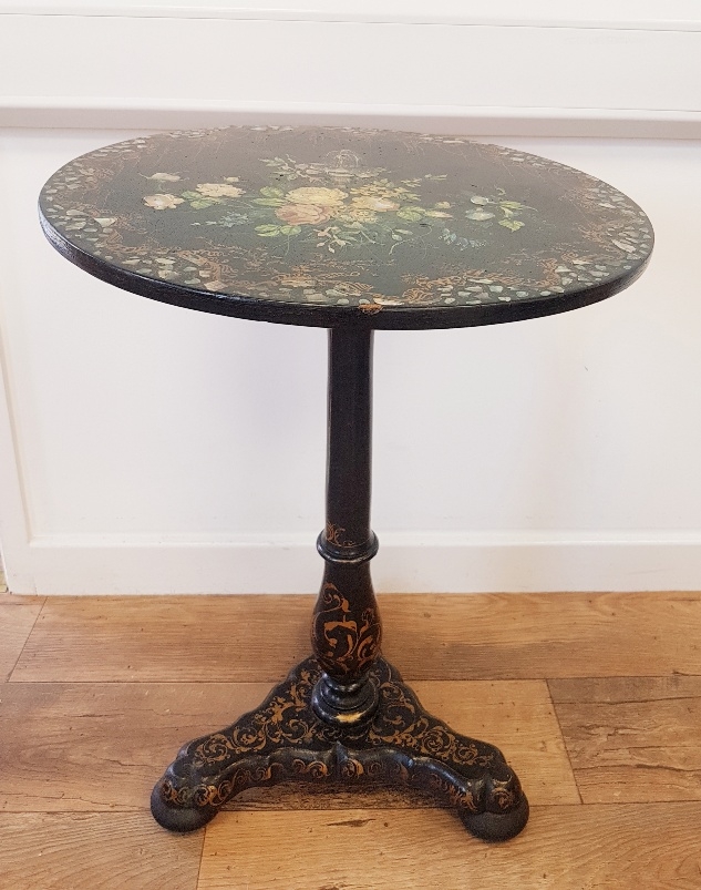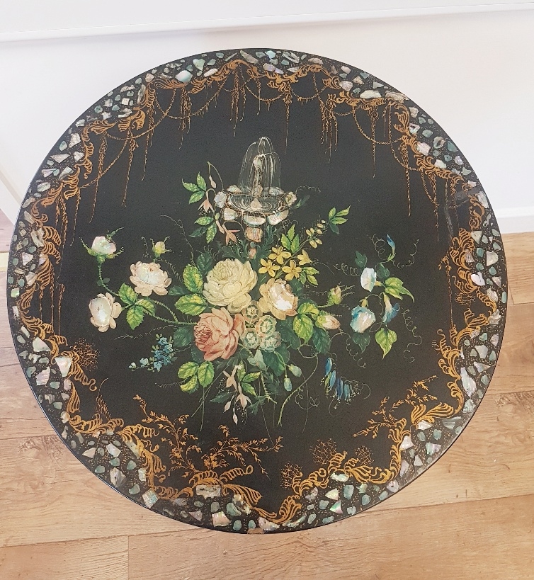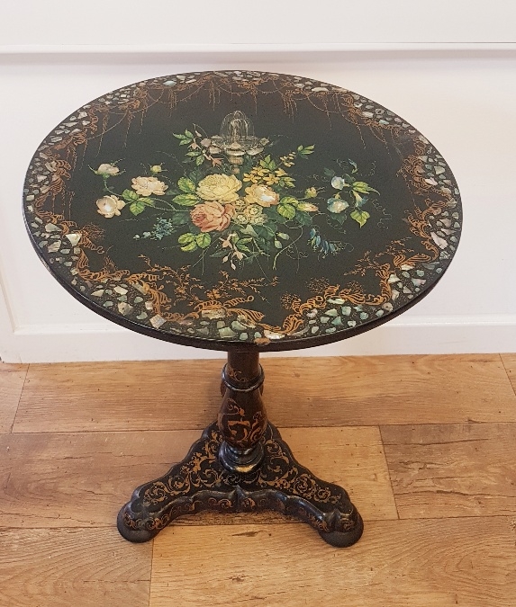 Georgian Tilt Top Table with high quality floral decoration, mother of pearl inserts and gilt decoration to the base. Stands 27 inches tall by 20 inches diameter.