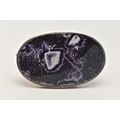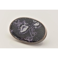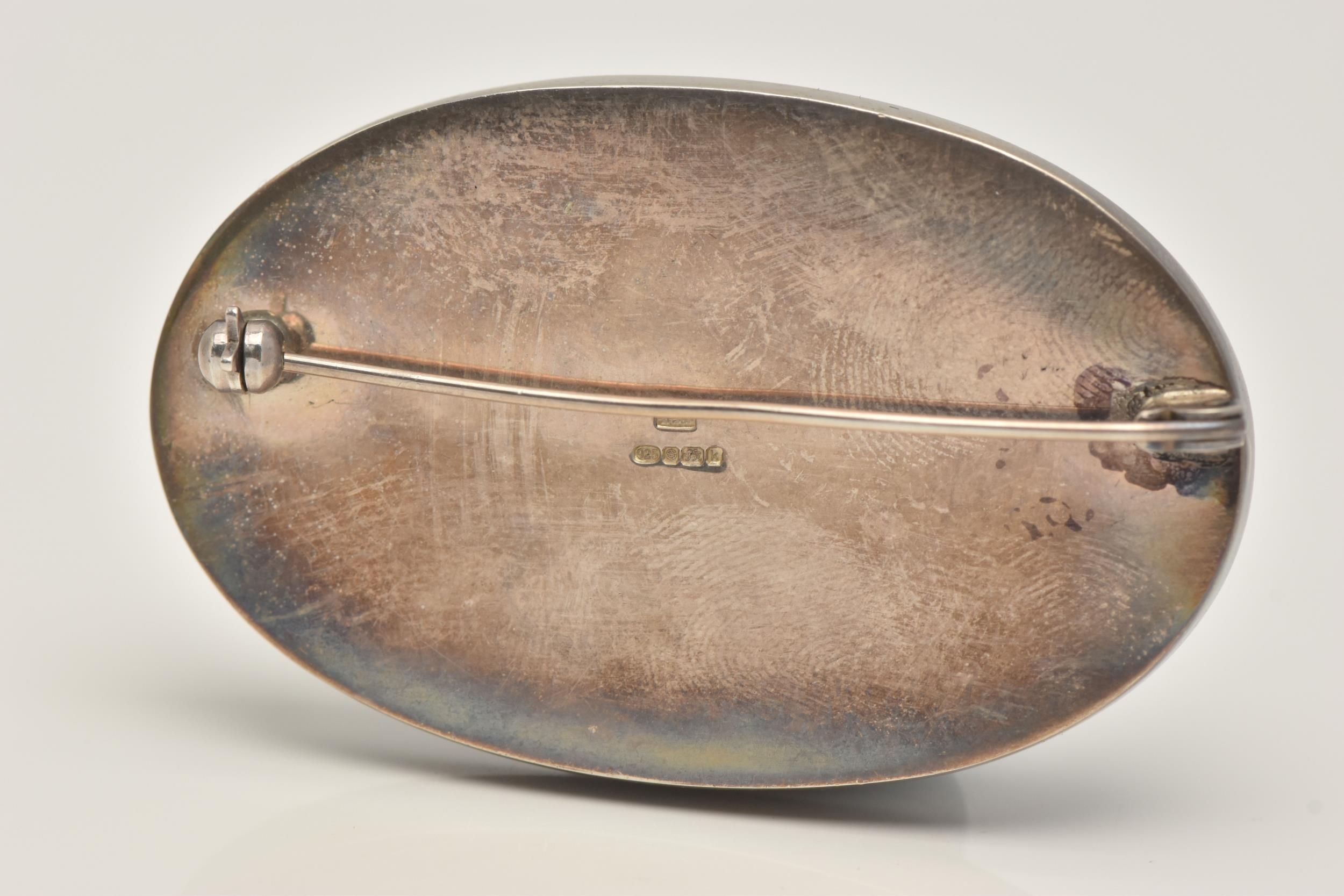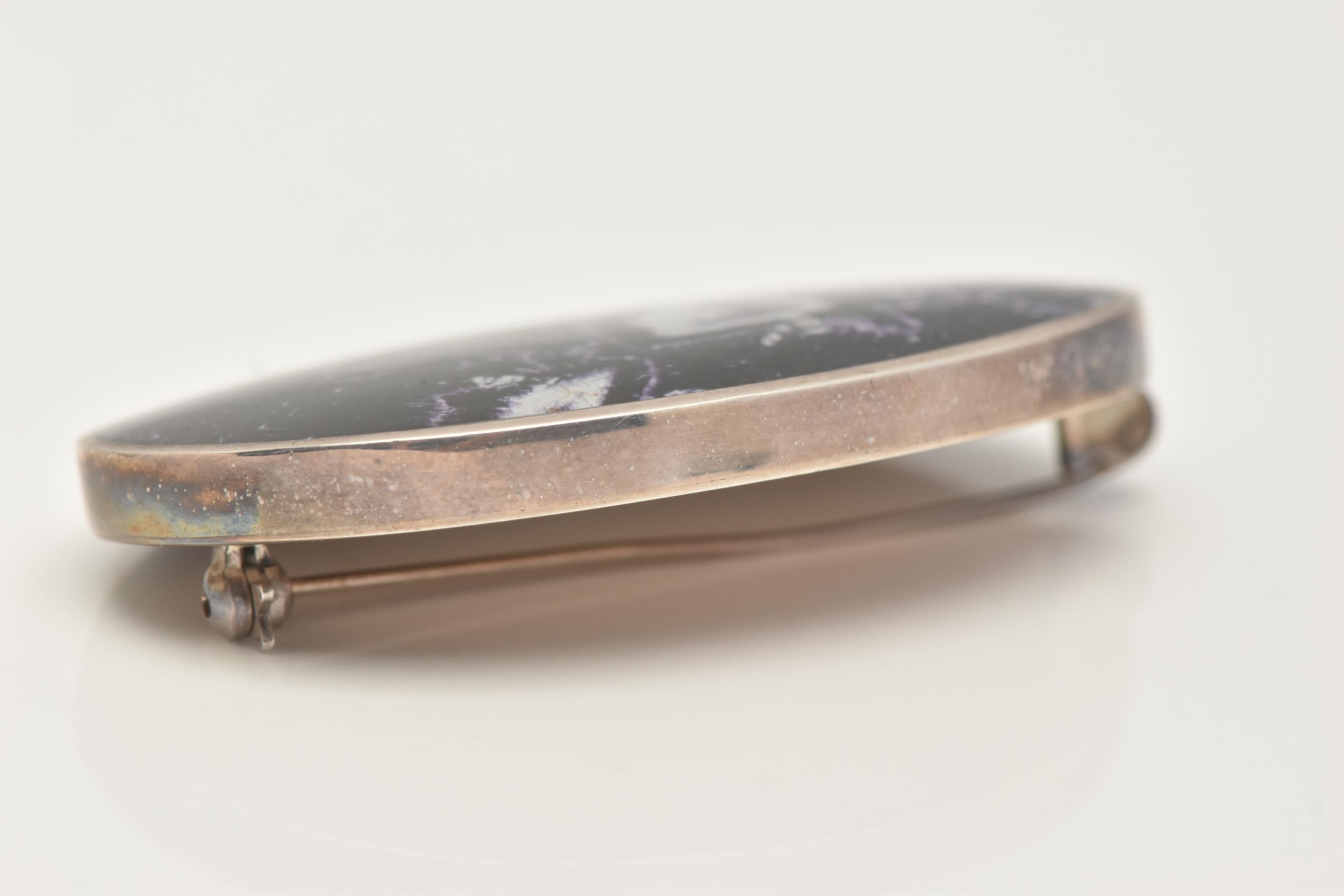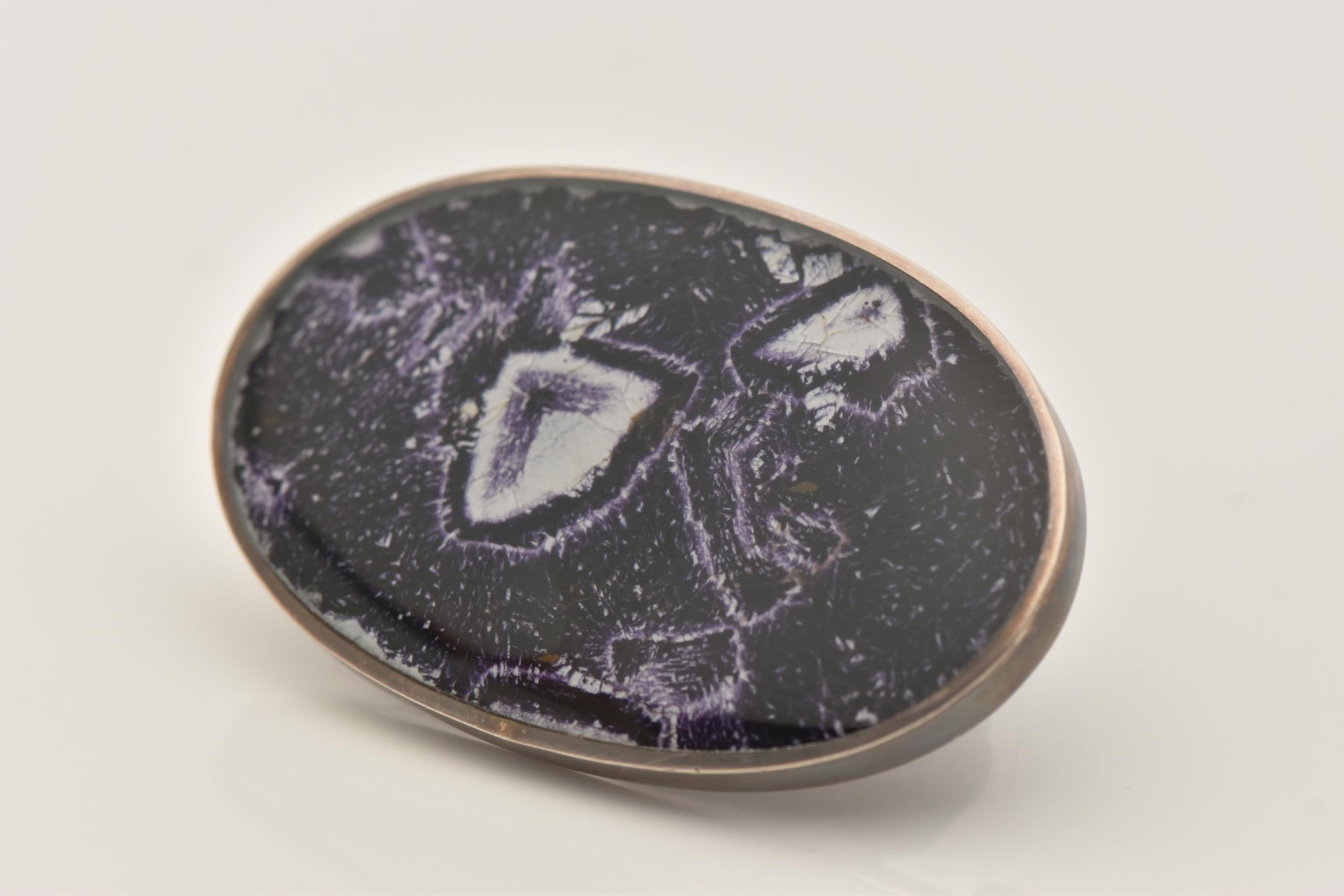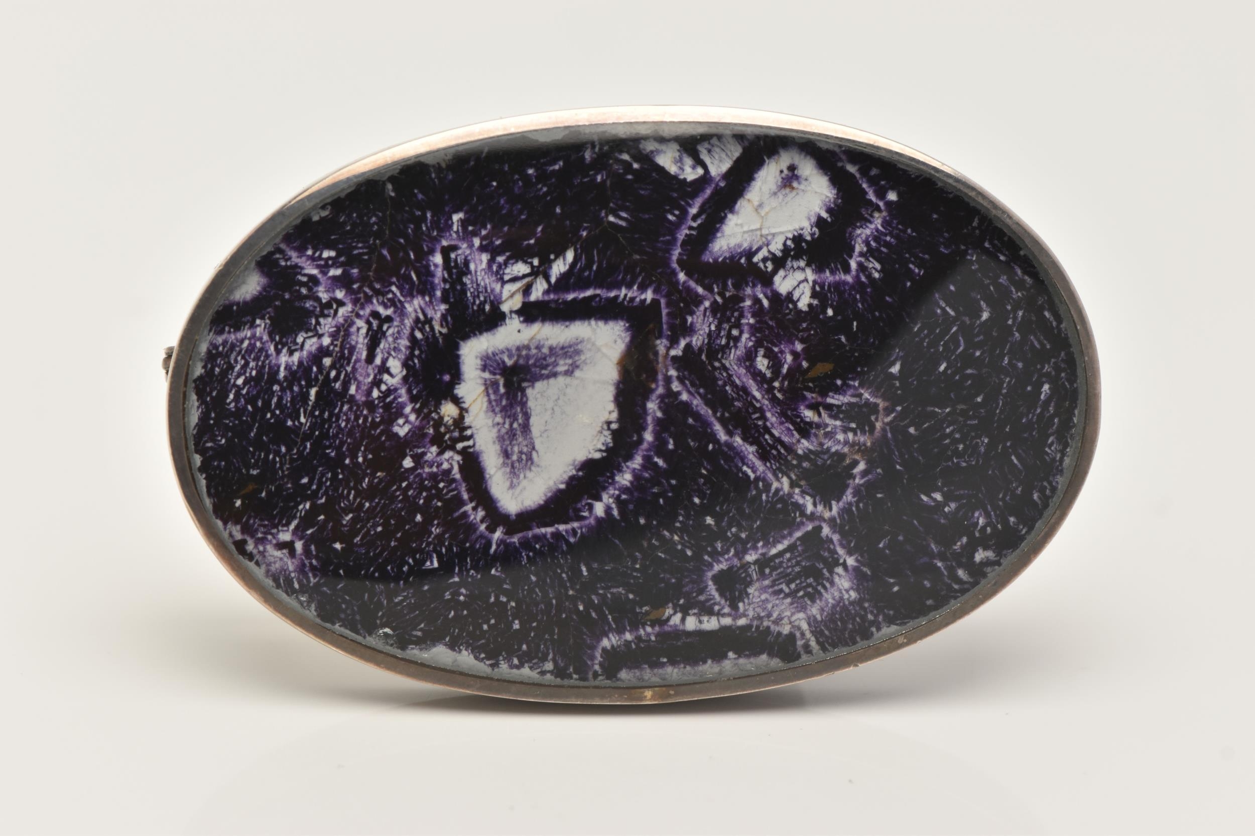 A 'DAVID SCOTT WALKER' SILVER BROOCH, of an oval form with a slice of fluorite beneath a glazed panel, collet set in silver with a brooch pin and safety clasp, hallmarked 'David Scott Walker' Sheffield, length 52.4mm x width 33.7mm, approximate gross weight 24.0 grams (condition report: general light wear)