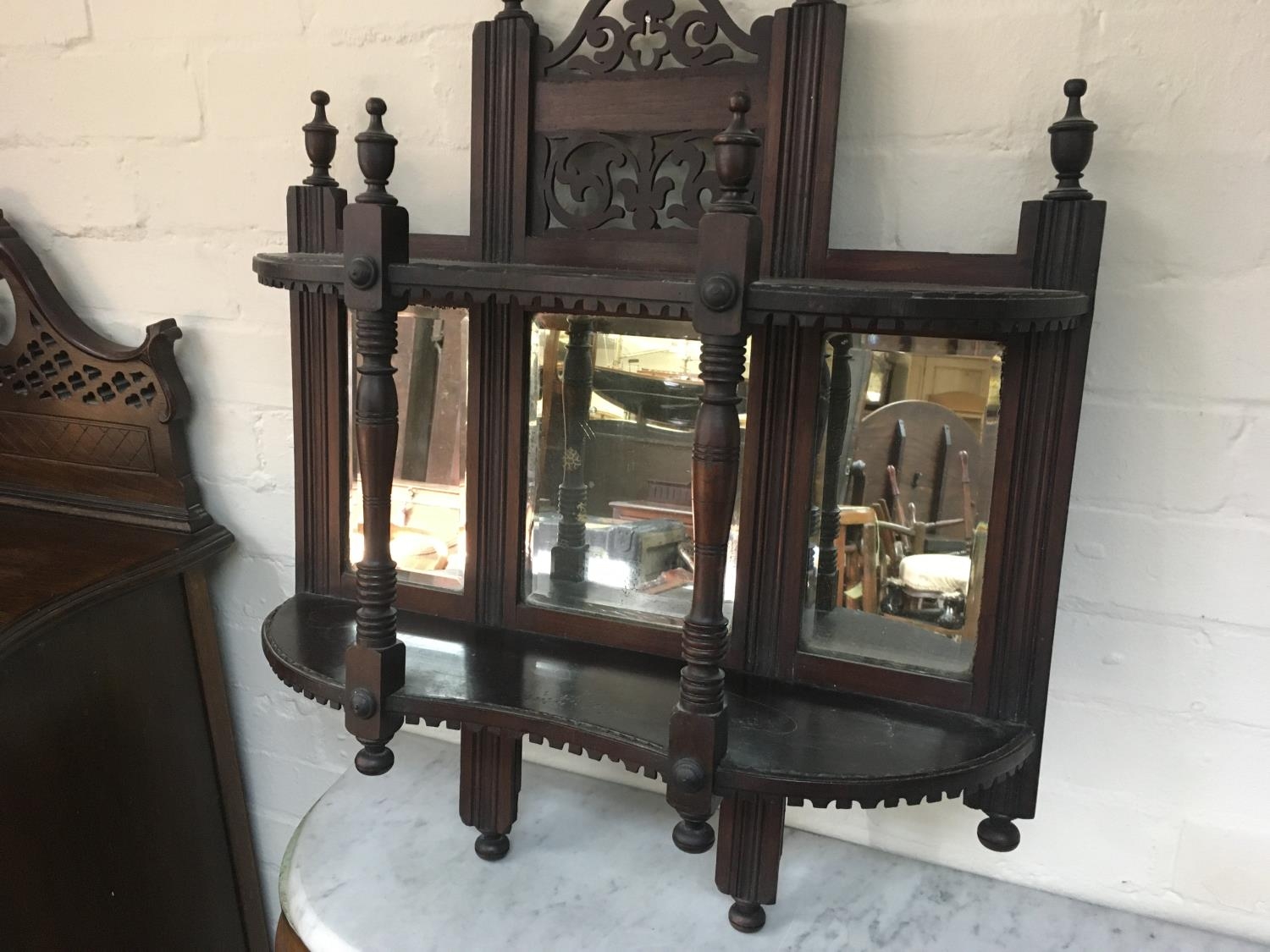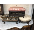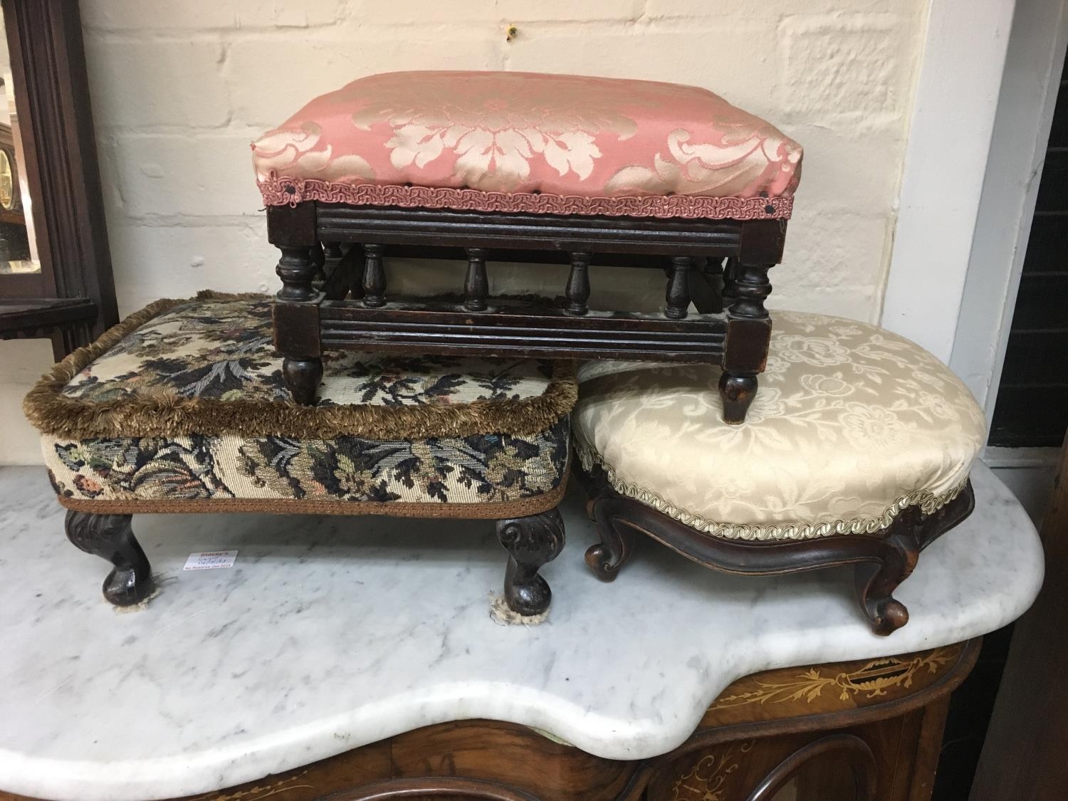 A collection of furniture comprising music cabinet, wash stand , footstools and hanging self .