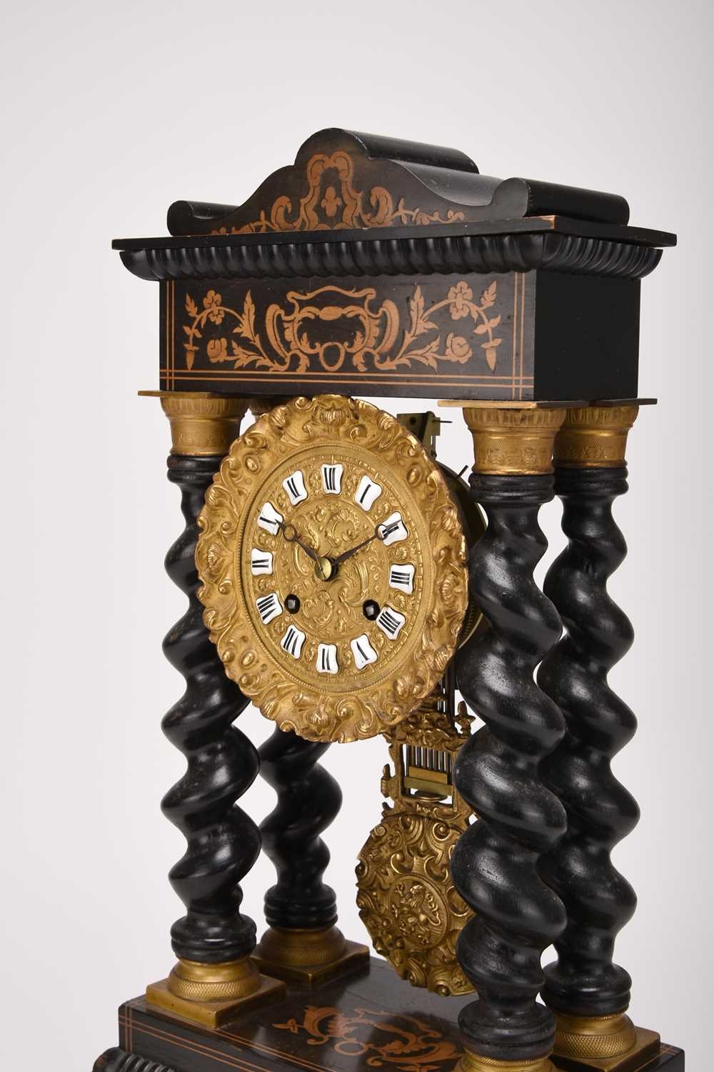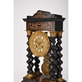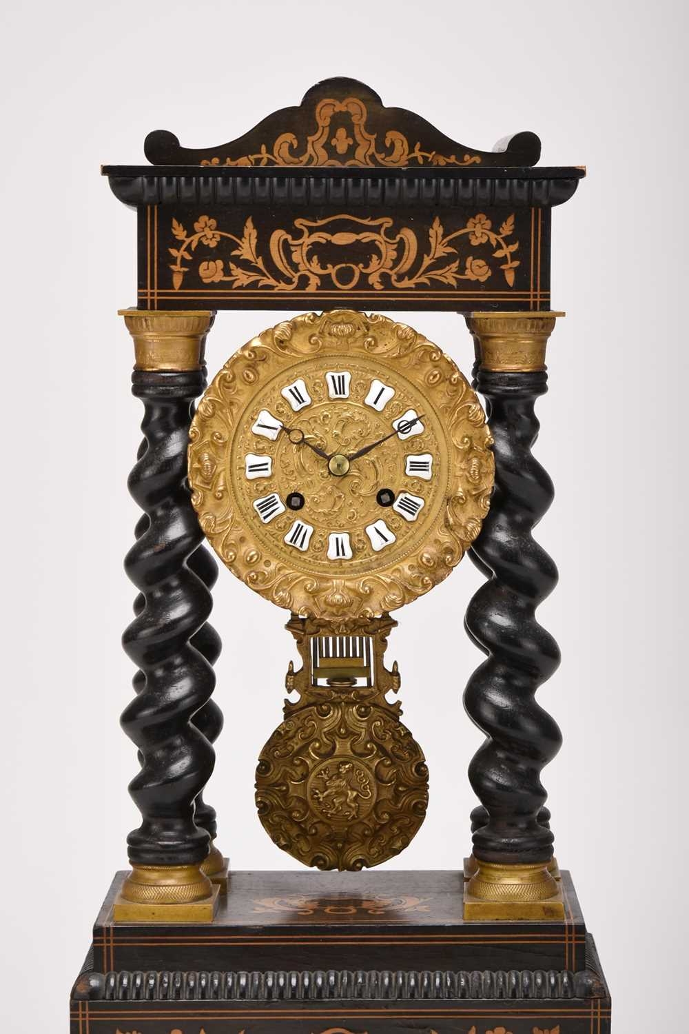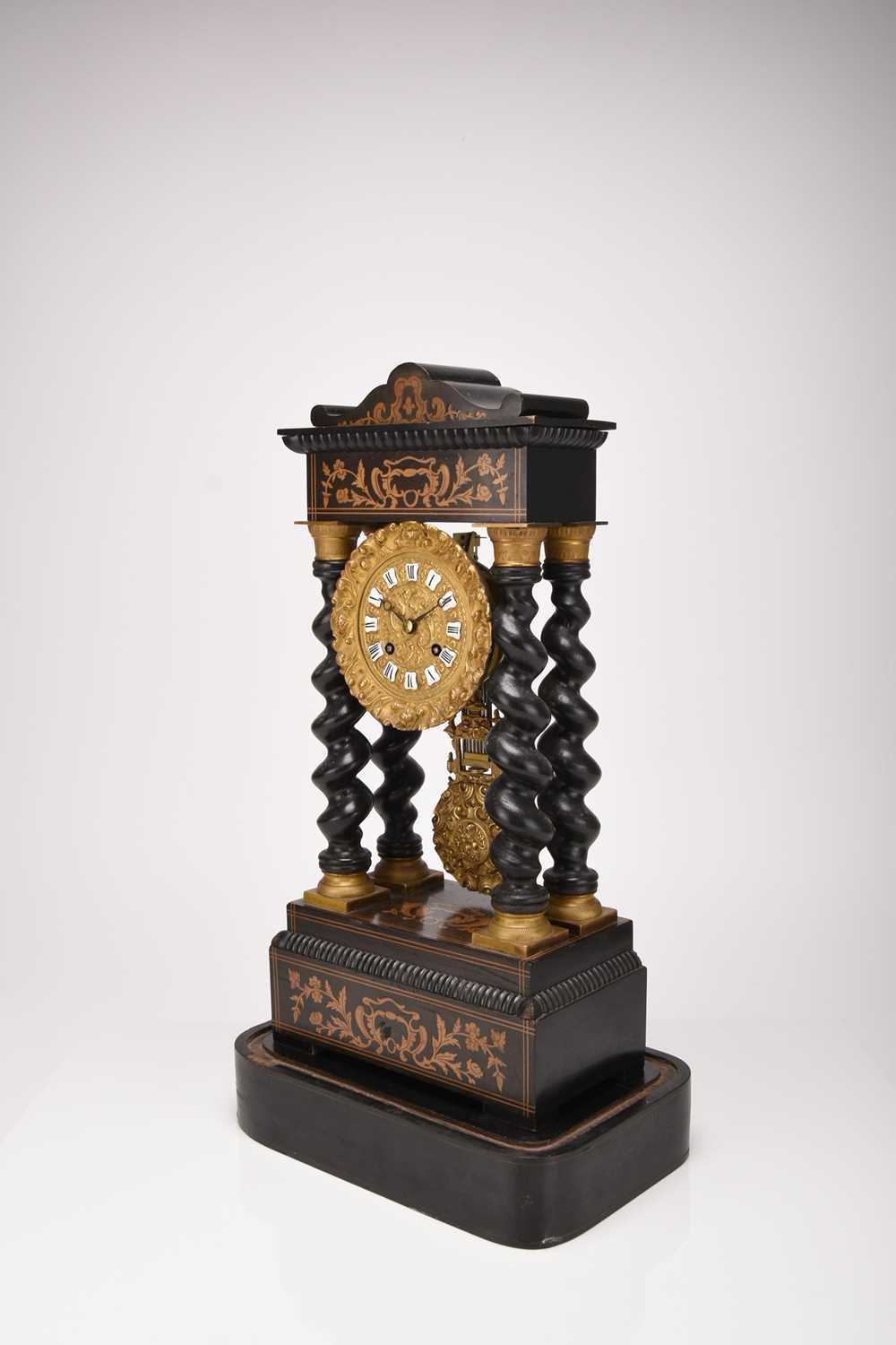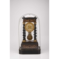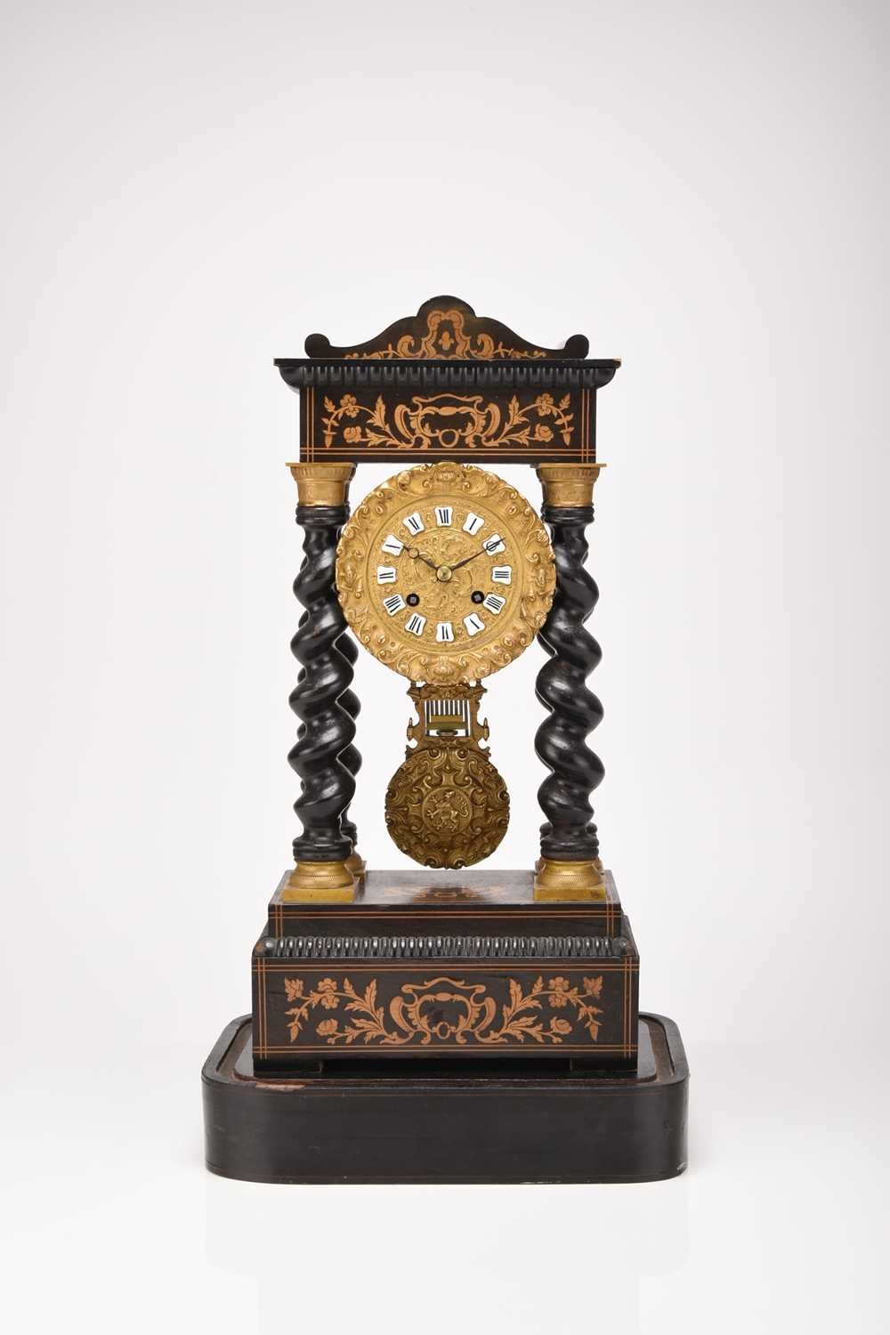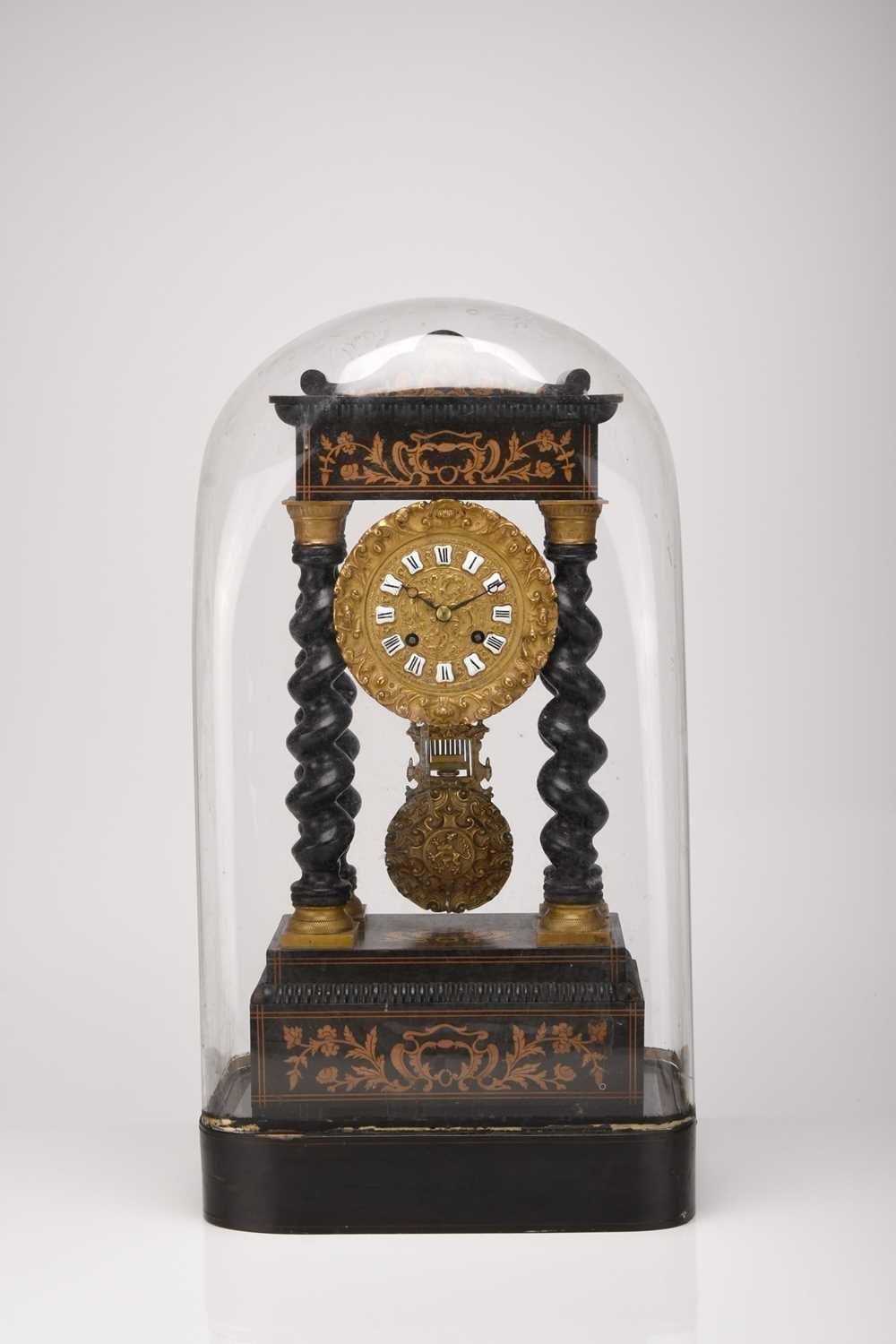 A French ebonised portico mantel clock, late 19th century The 3.5in gilt metal repousse dial with applied Roman numerals, the two train movement striking on a bell, the case raised on four gilt capped barley twist columns, the wavy cornice and stepped plinth with bracket feet both gadrooned and adorned with a boxwood floral frieze and stringing, resting on an ebonised stand fitted with glass dome. 43cm high (dome 49cm high)