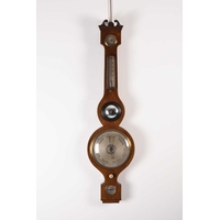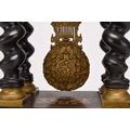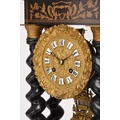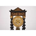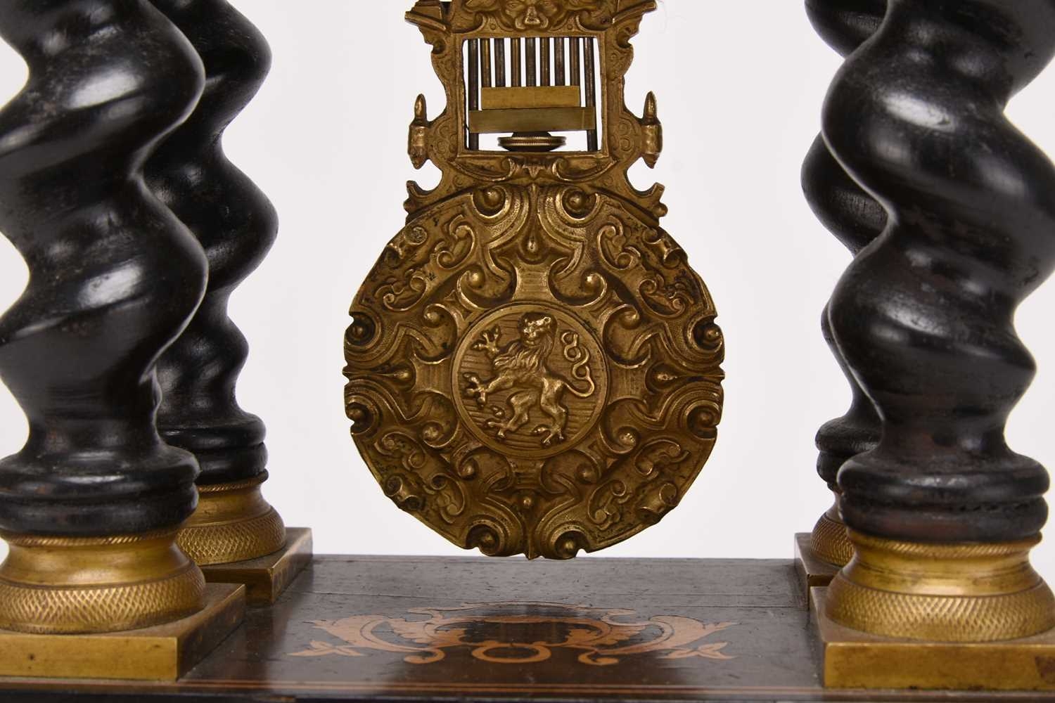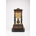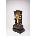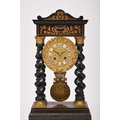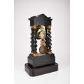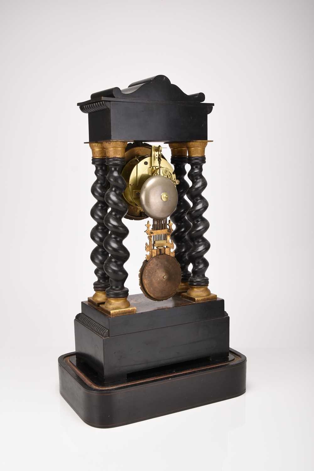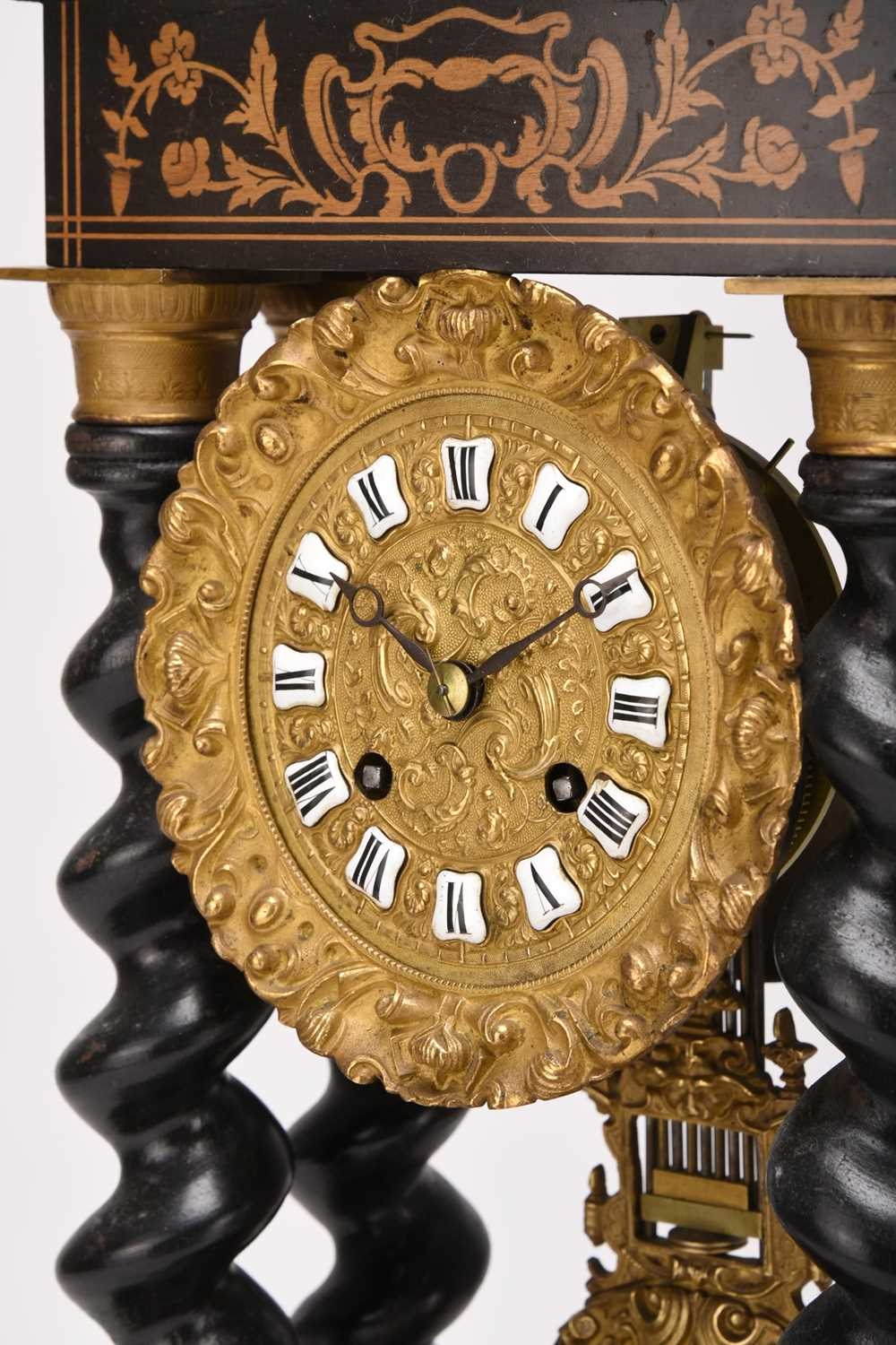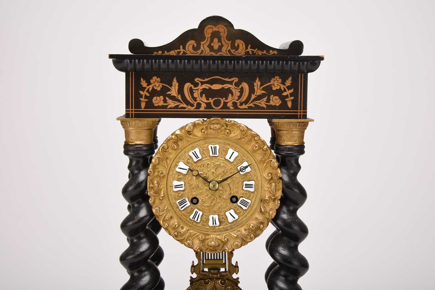 A French ebonised portico mantel clock, late 19th century The 3.5in gilt metal repousse dial with applied Roman numerals, the two train movement striking on a bell, the case raised on four gilt capped barley twist columns, the wavy cornice and stepped plinth with bracket feet both gadrooned and adorned with a boxwood floral frieze and stringing, resting on an ebonised stand fitted with glass dome. 43cm high (dome 49cm high)