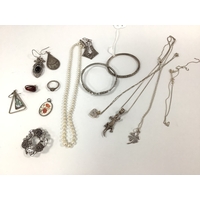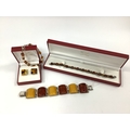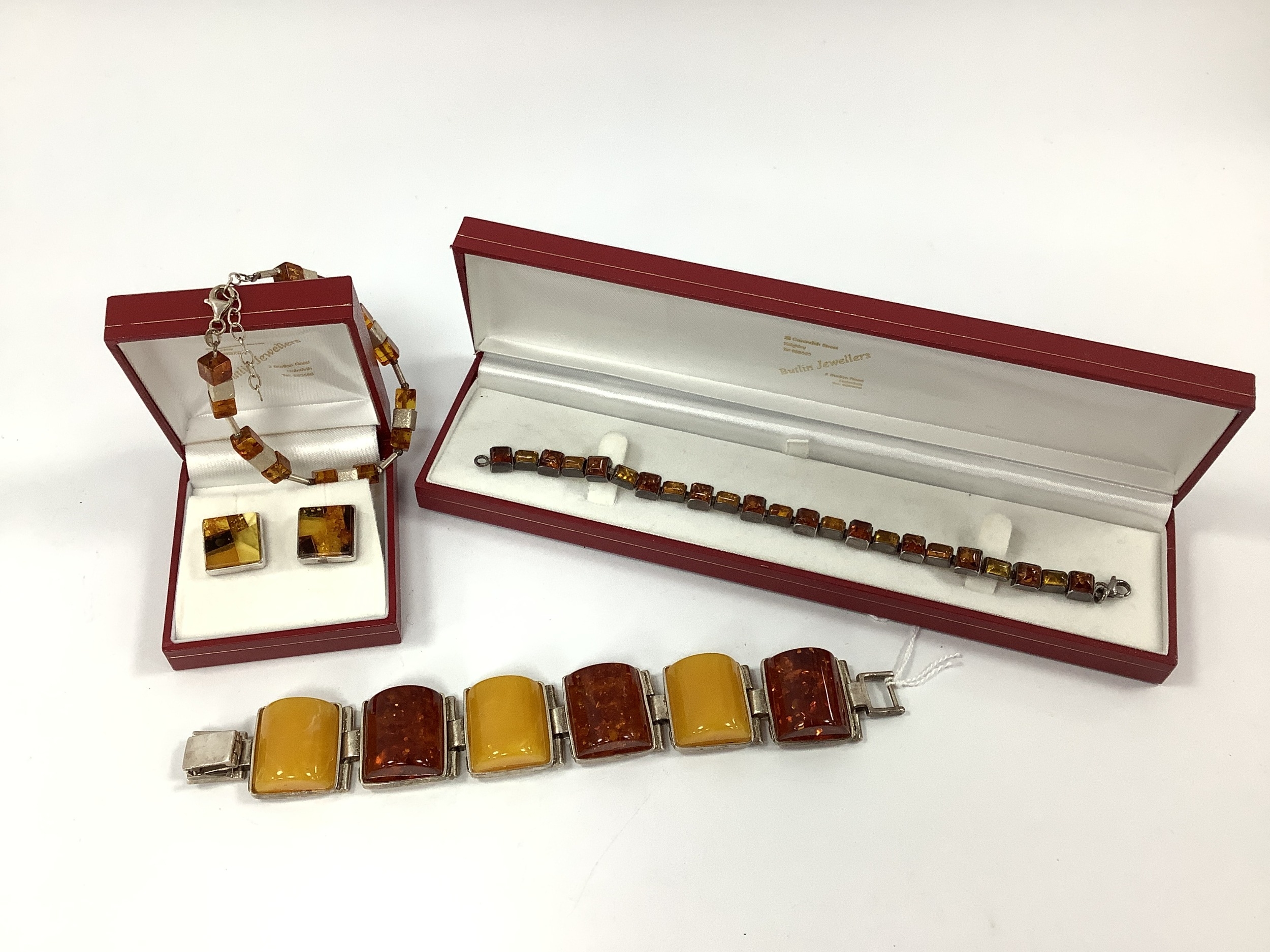 A Chunky Amber Coloured Panel Bracelet, of alternating tones, stamped "925" to each setting, overall length approximately 19.5cm; Together with A Pair of Amber Coloured Modernist Style Stud Earrings, of square form, stamped "925", a collet set amber coloured panel bracelet, of alternating tones and shapes, stamped "925", and a modern amber coloured bead bracelet, stamped "925".