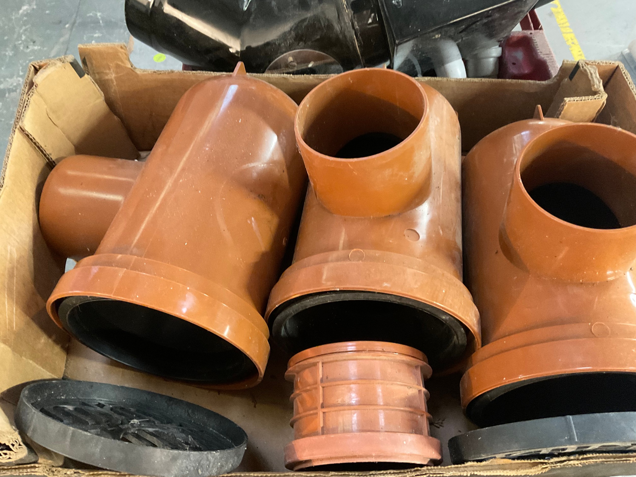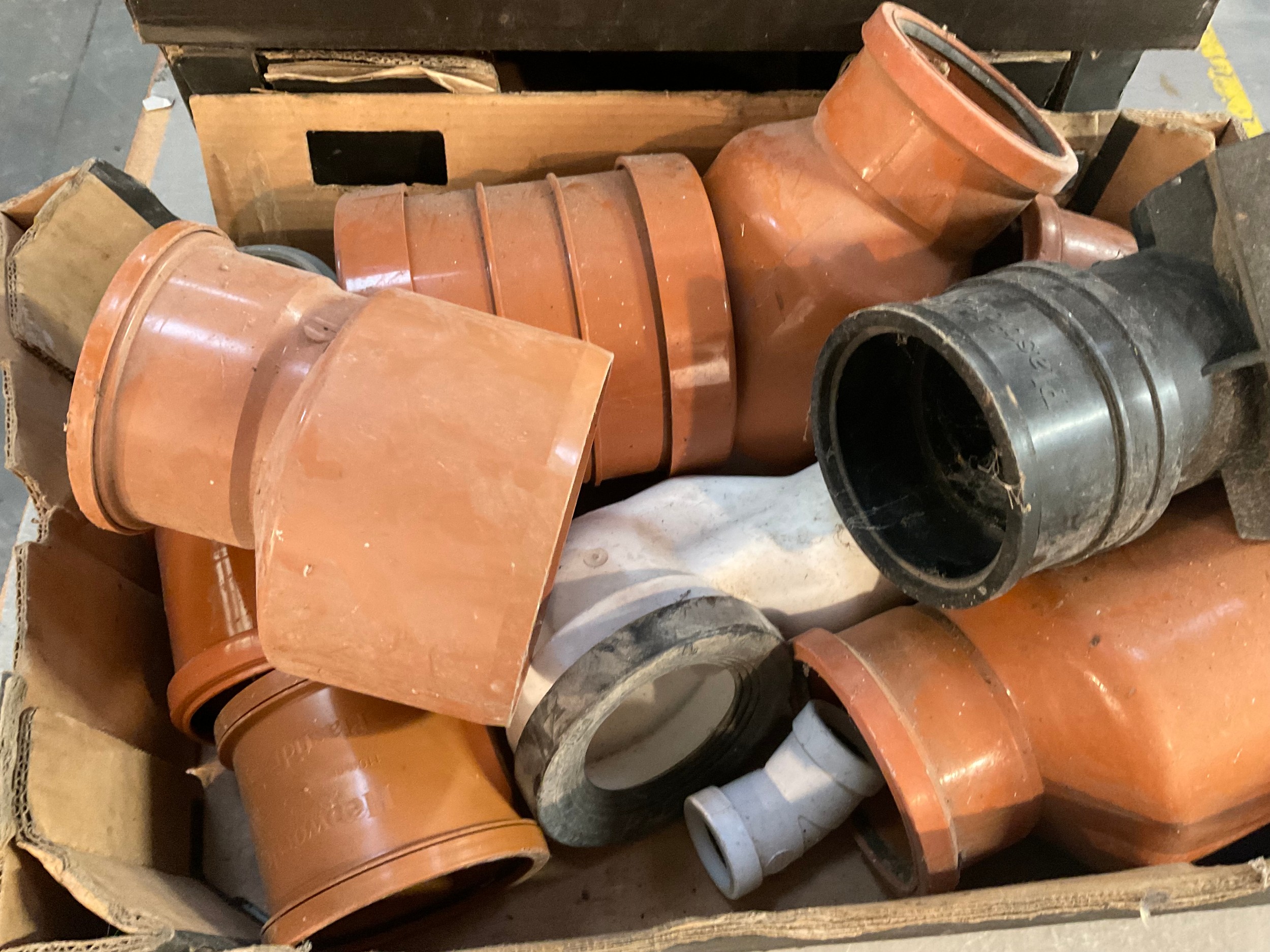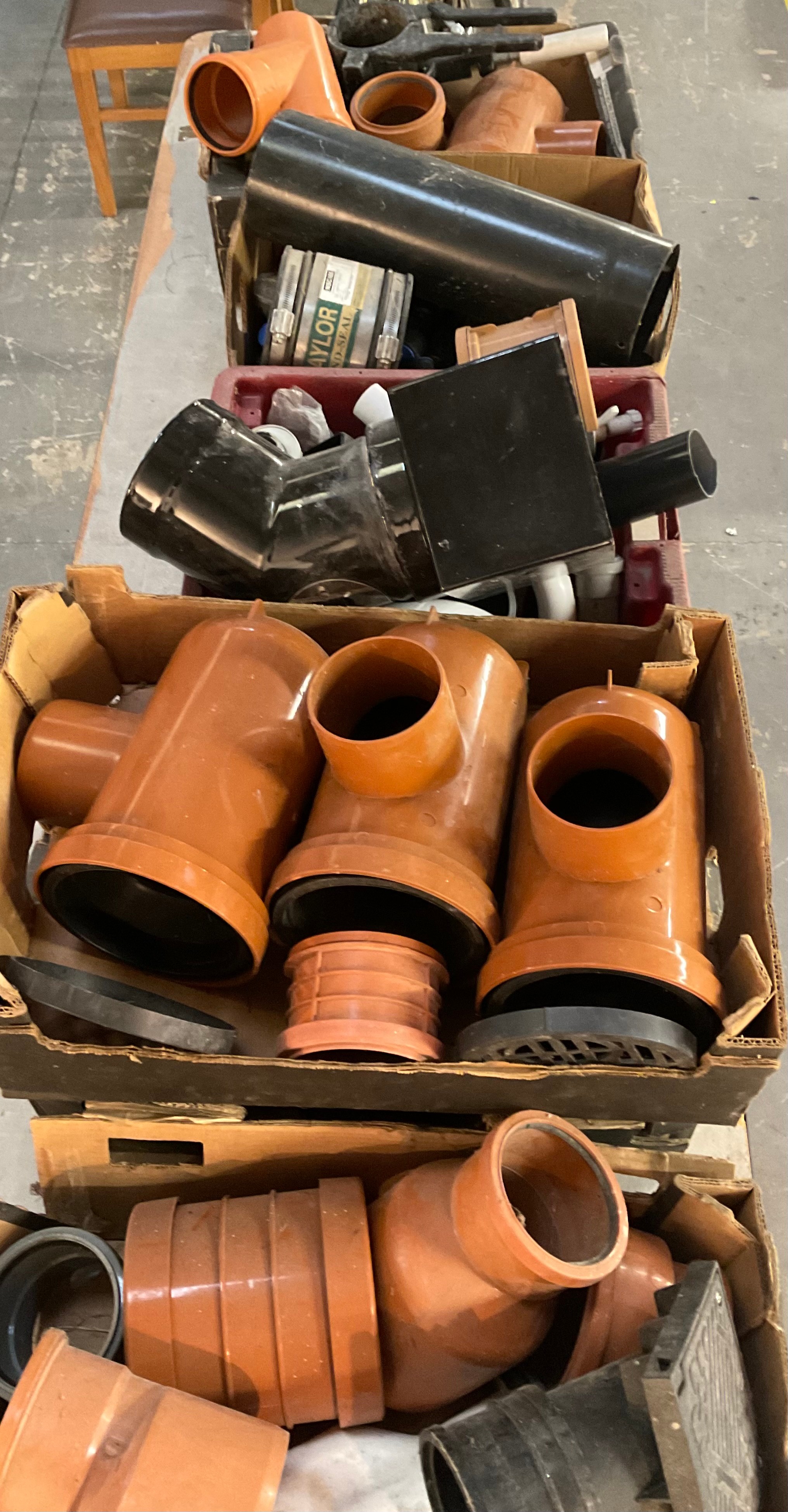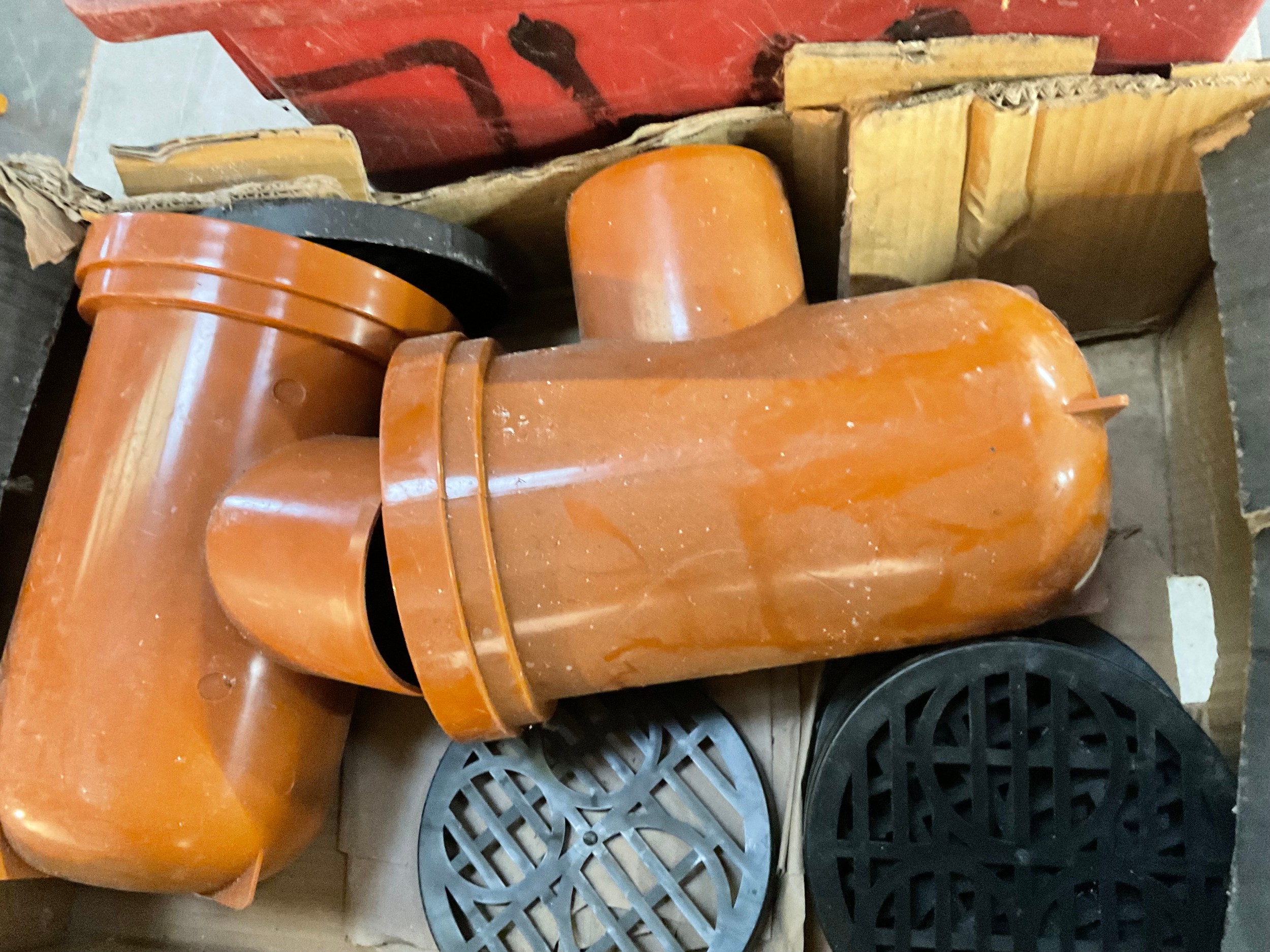 5 BOXES AND PLASTIC CRATE OF DRAINAGE CONNECTING PIPES