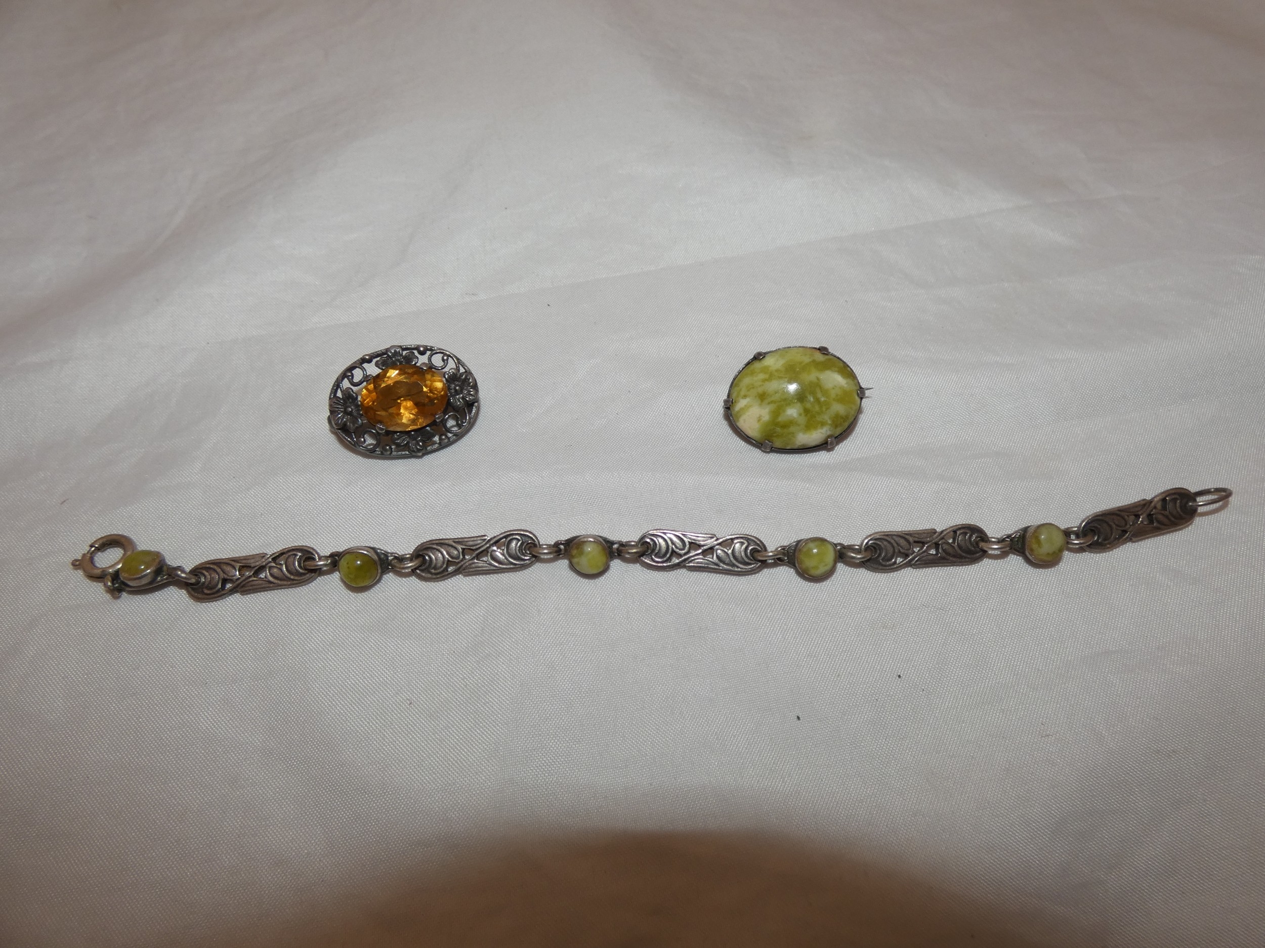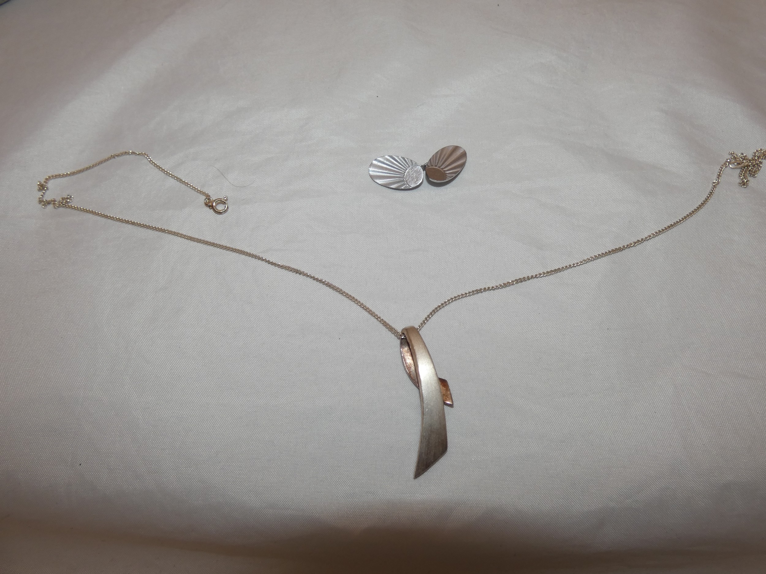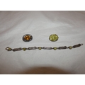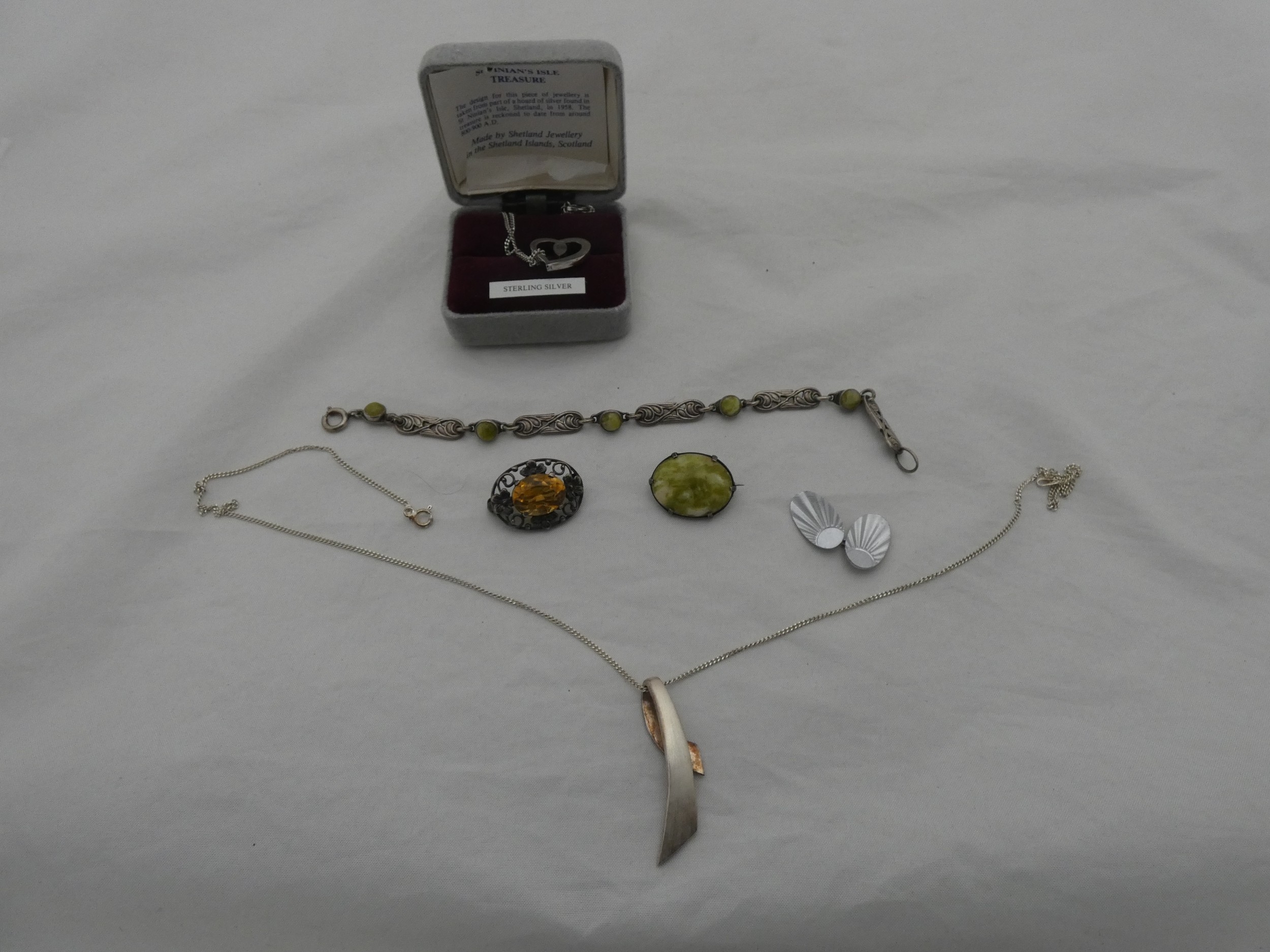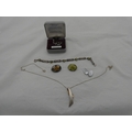 Group of silver jewellery to include a pendant on chain, chain, and a brooch.
