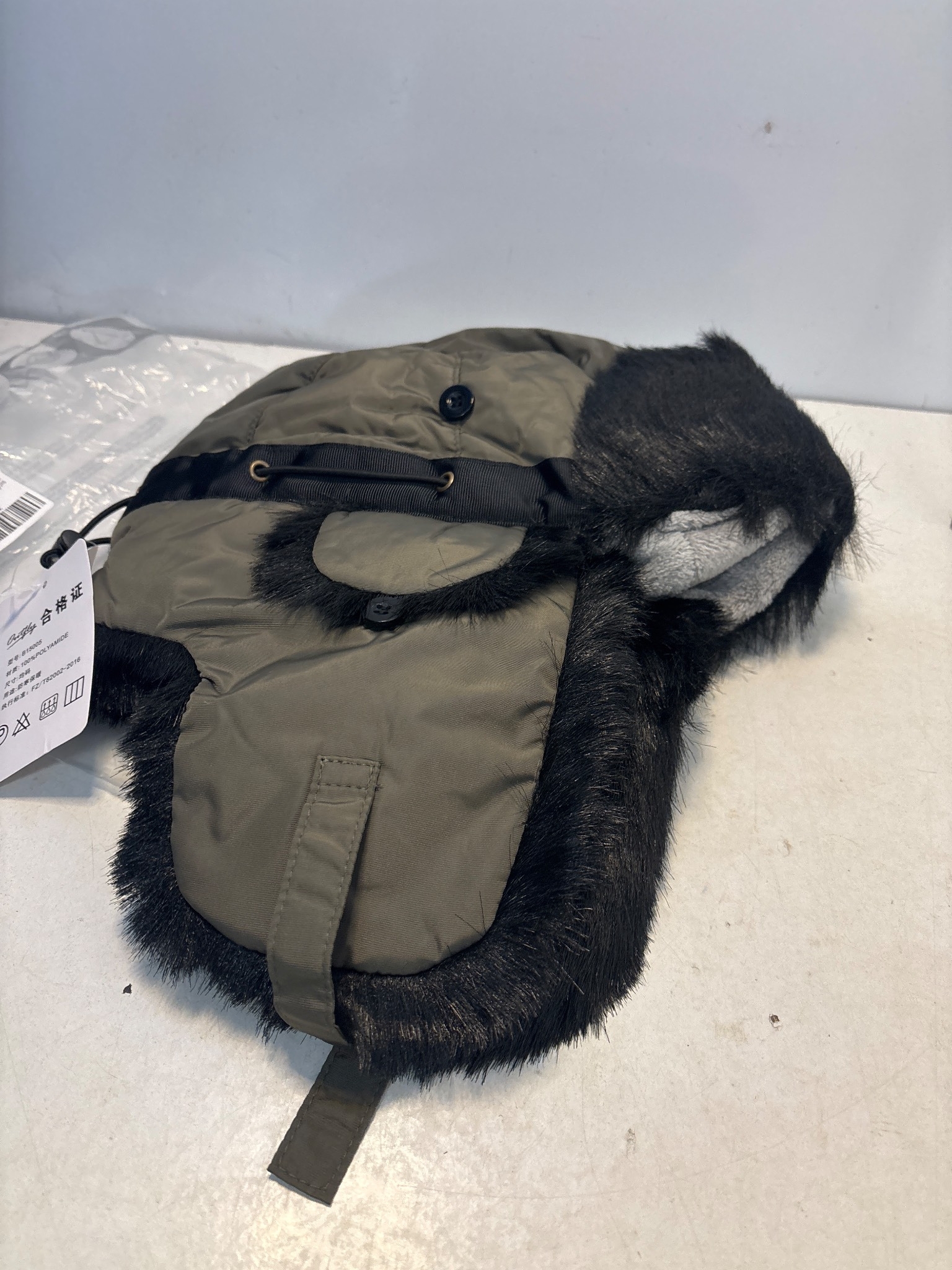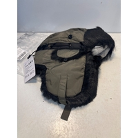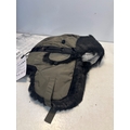 Olive green fabric and faux fur winter hat with adjustable straps.