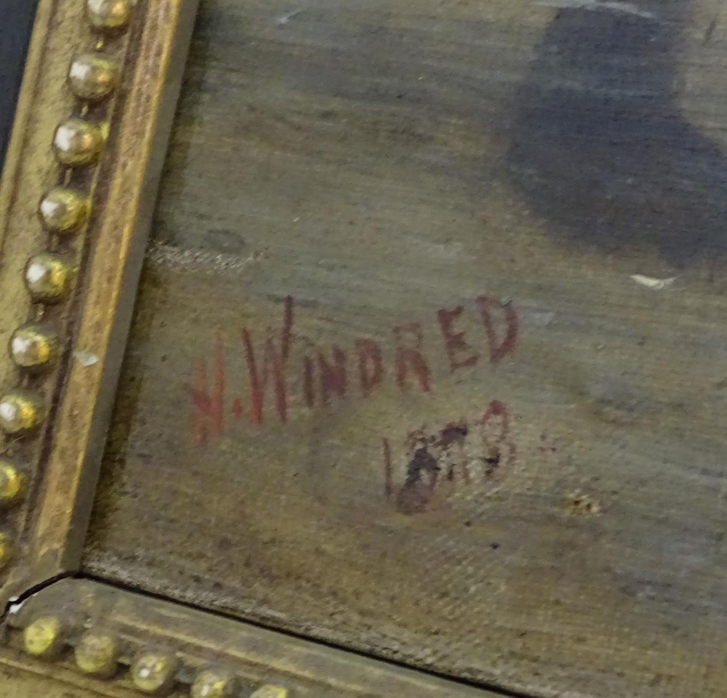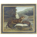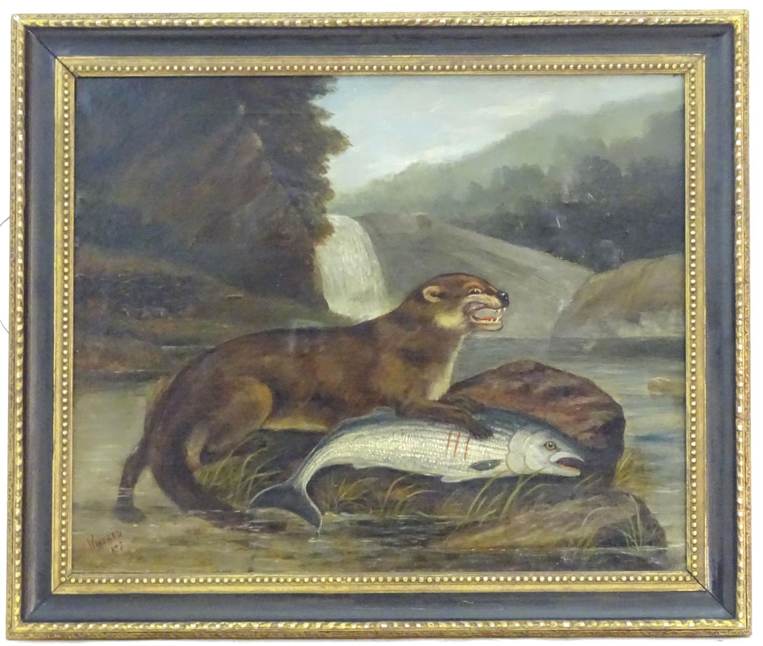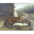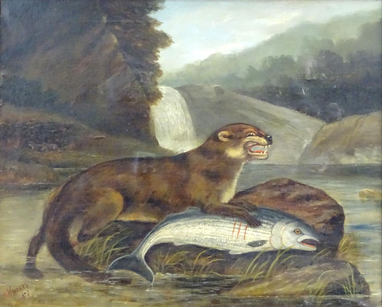 H. Windred, XIX, Oil on canvas, A river landscape scene with an otter with its prey, a salmon, with otter cubs in a nest on the bank. Signed and dated 1878 lower left. Approx. 23 3/4" x 26 3/4"