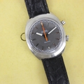 An Omega Chronostop Geneve wristwatch, the grey circular dial with baton markers, set to shaped plain polished case, 3.9cm long (lug to lug) upon an associated black strap, 23cm long, within Omega box (at fault)