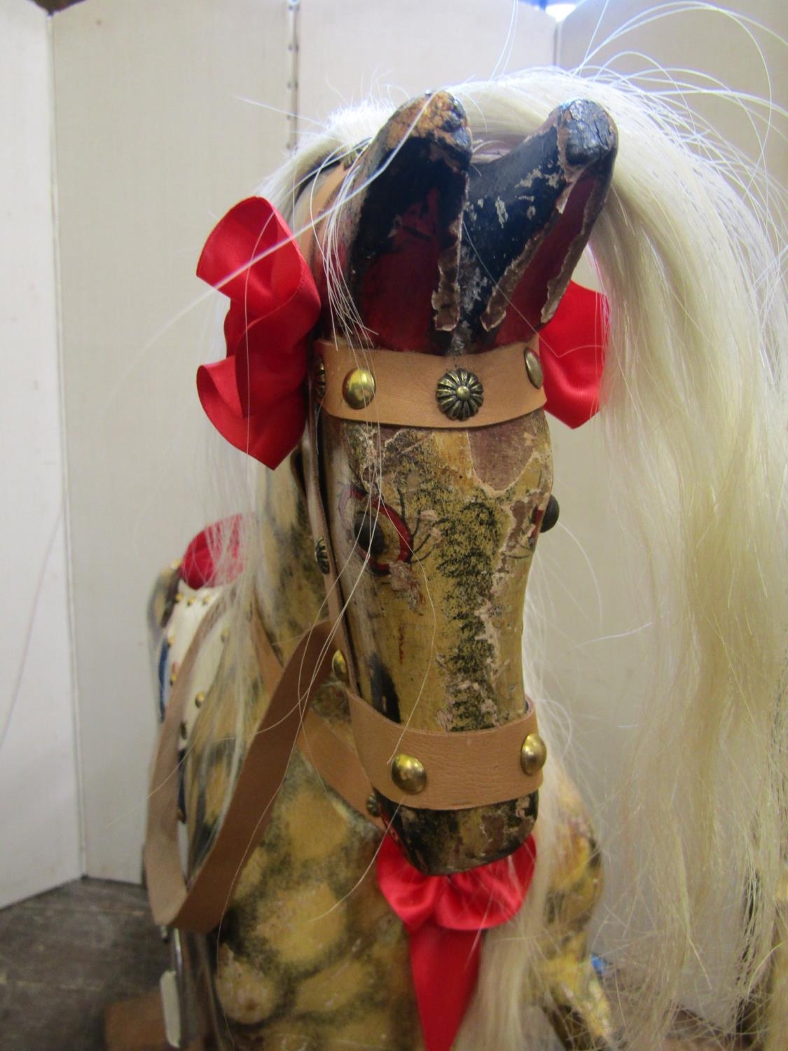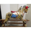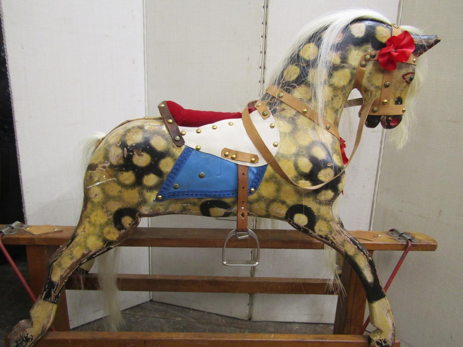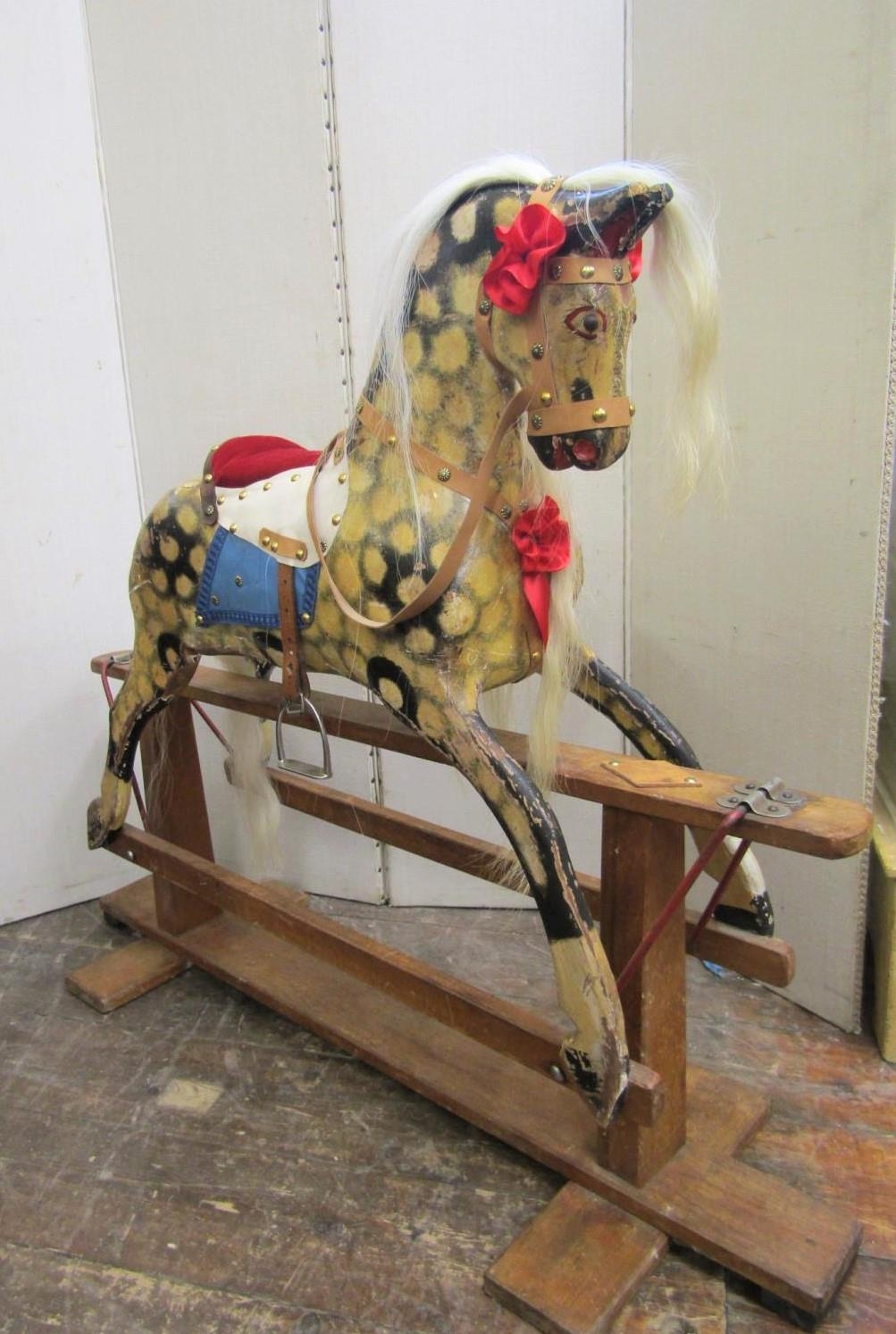 A vintage dapple grey rocking horse on central rocker, overall length 115cm x 95cm high