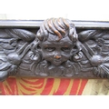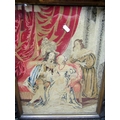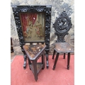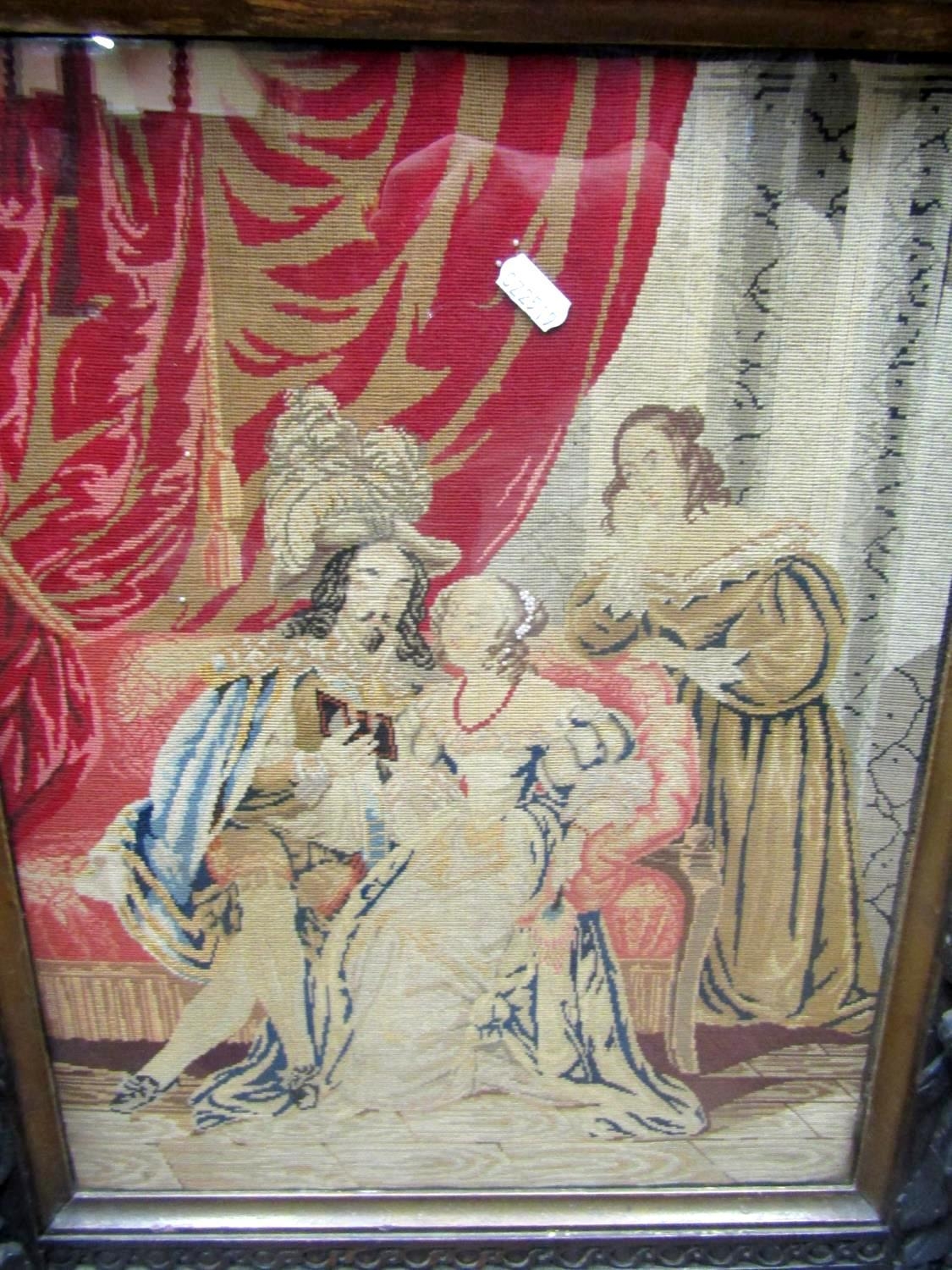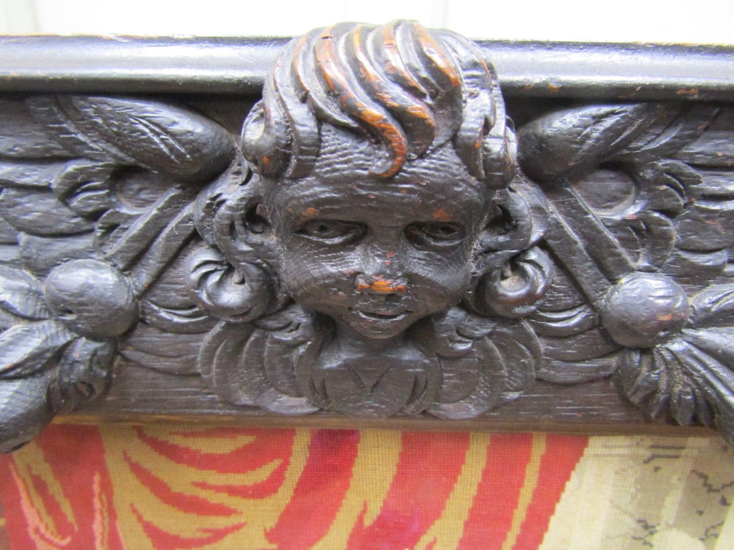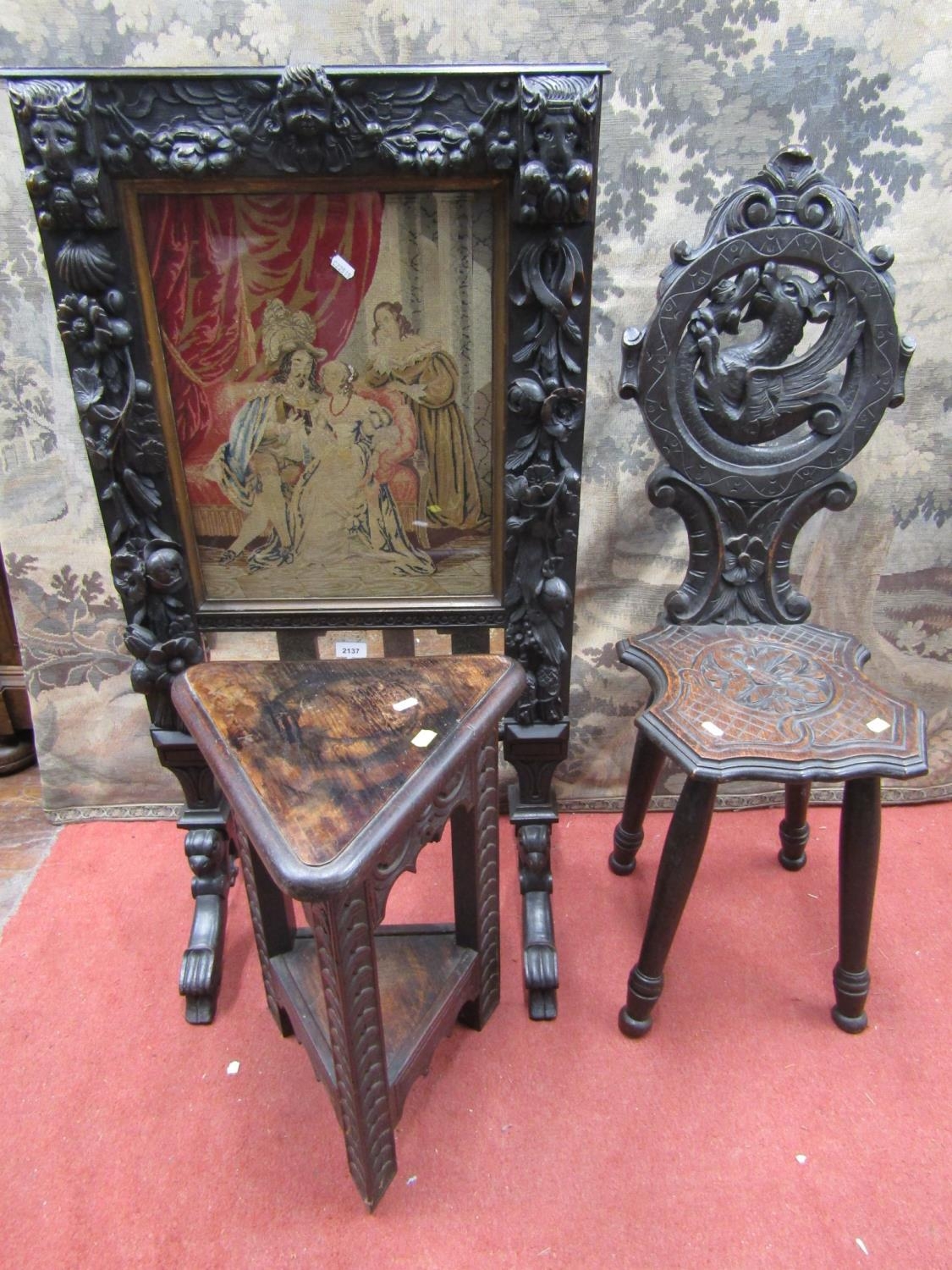 A Victorian carved oak fire screen with applied trailing floral rams mask, cherub and other panels (possibly earlier) raised on swept supports, with eagle mask detail, enclosing a petite point tapestry panel, showing a carolean interior scene, with three characters studying a volume, a Victorian carved oak hall chair and occasional table