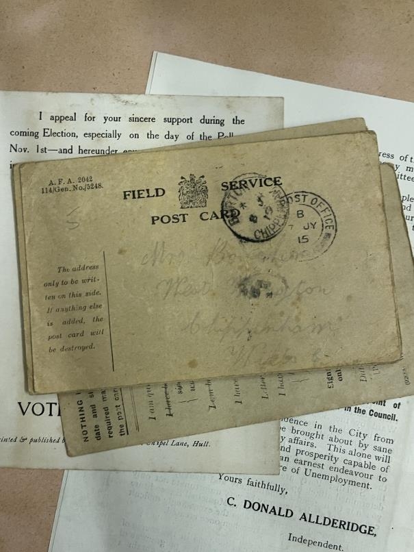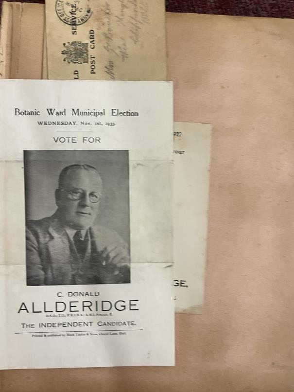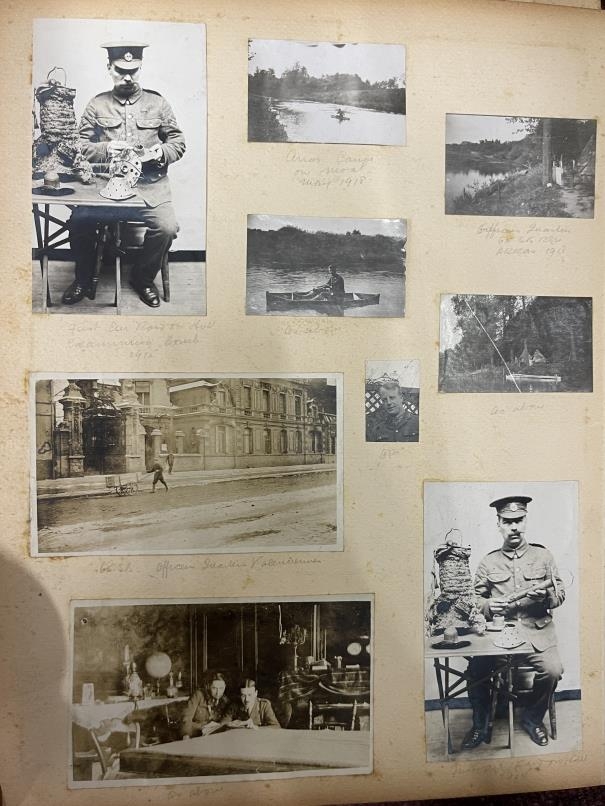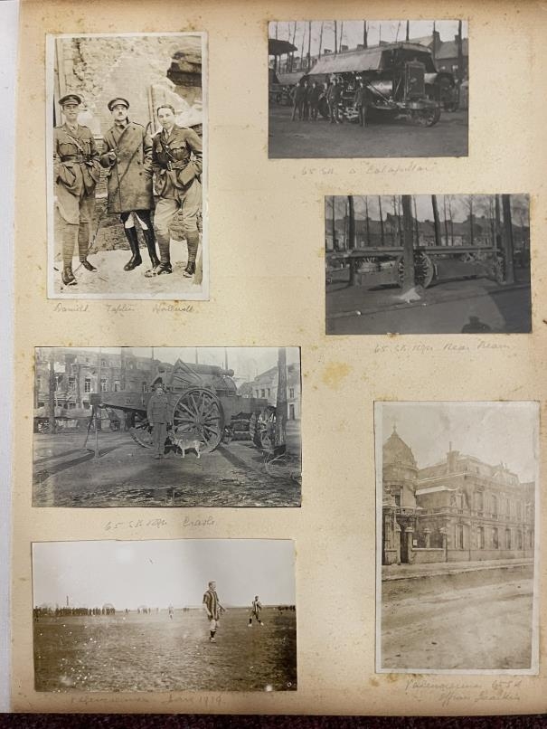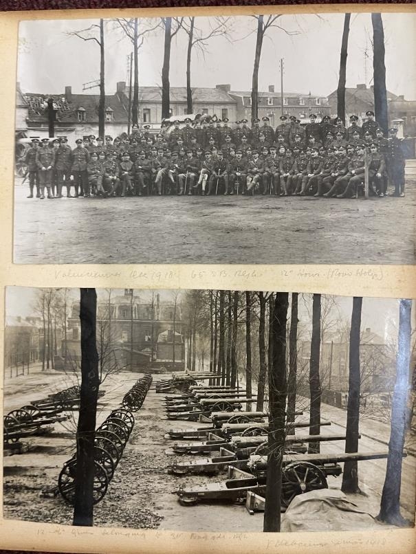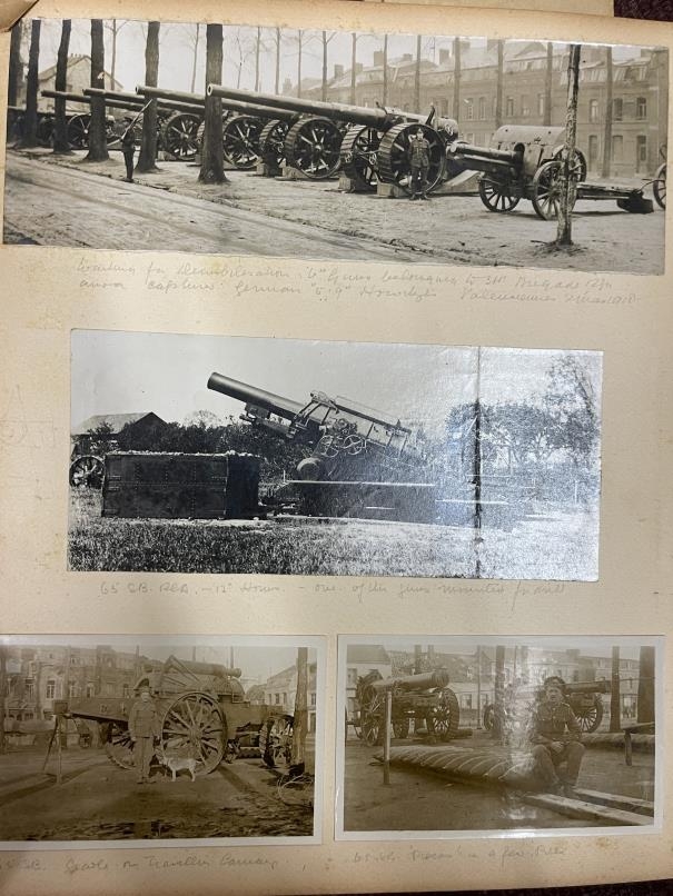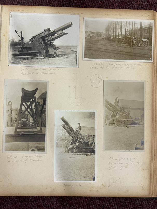 World War One: Album of photographs showing Artillery and Tommies in WWI compiled by Major C.D. Allderidge. Plus seven unrelated WWI Field Service postcards dating from 1915-16.
