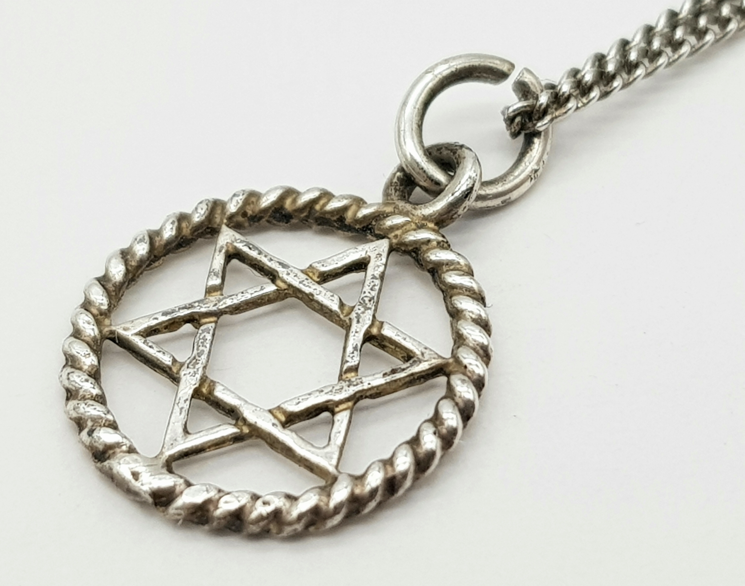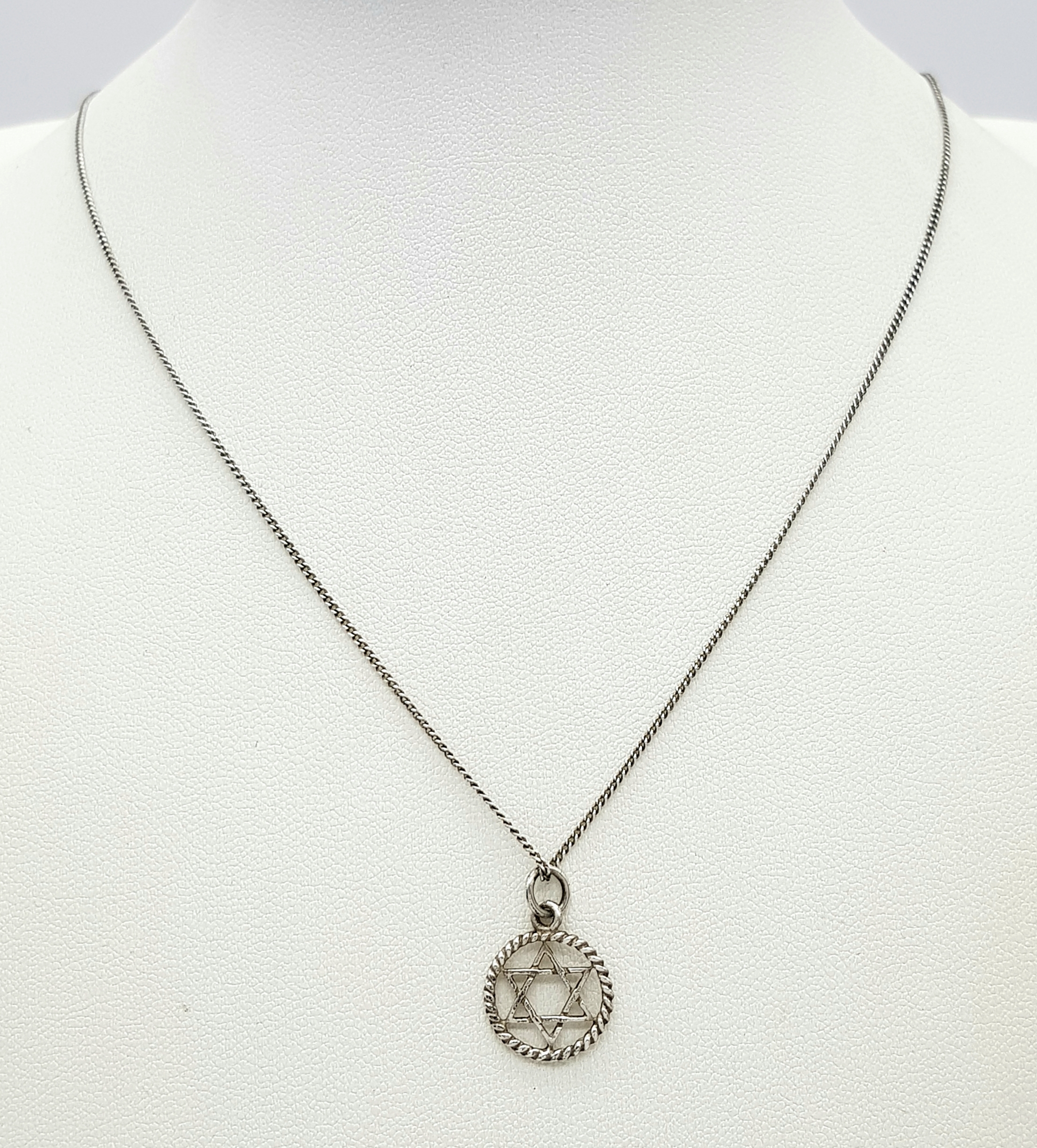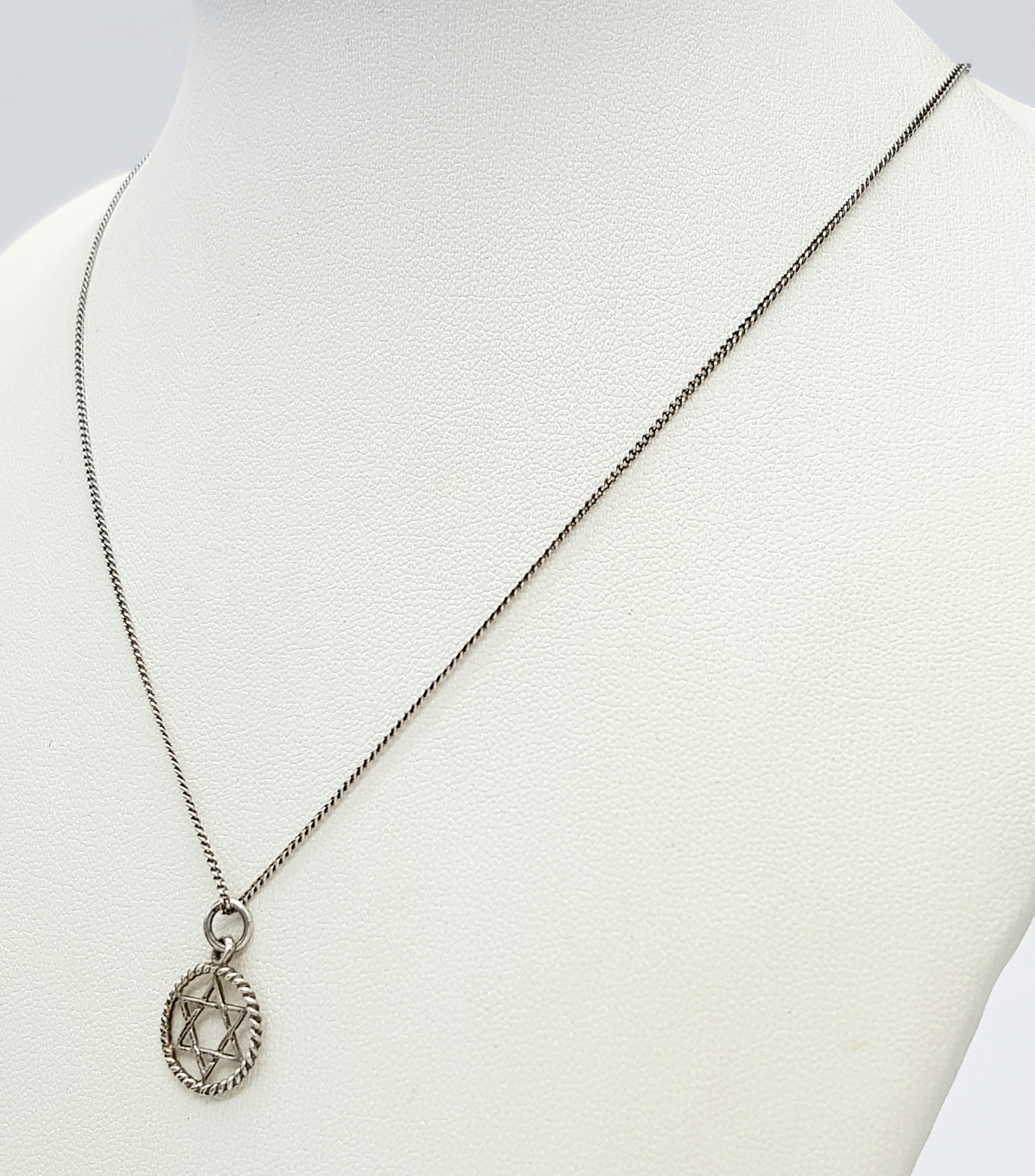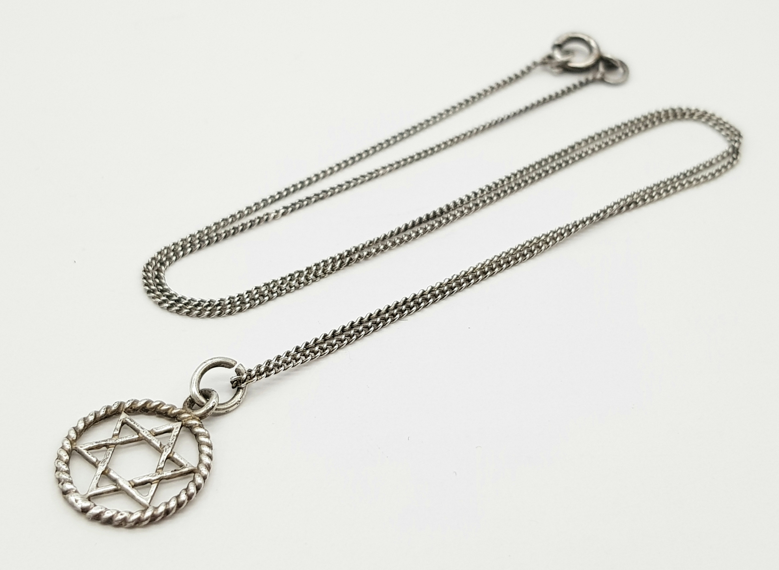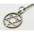 A vintage 925 silver Star of David pendant, set on a silver chain necklace. Total weight 2G. Total length 40cm.