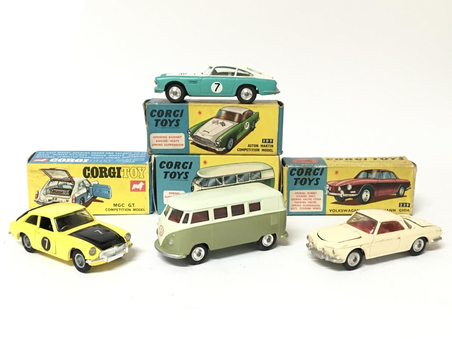 Corgi toys, #434 Volkswagen Kombi, #345 MGC GT competition model, #239 Volkswagen 1500 Karmann Ghia and #309 Aston Martin Competition model, boxed