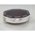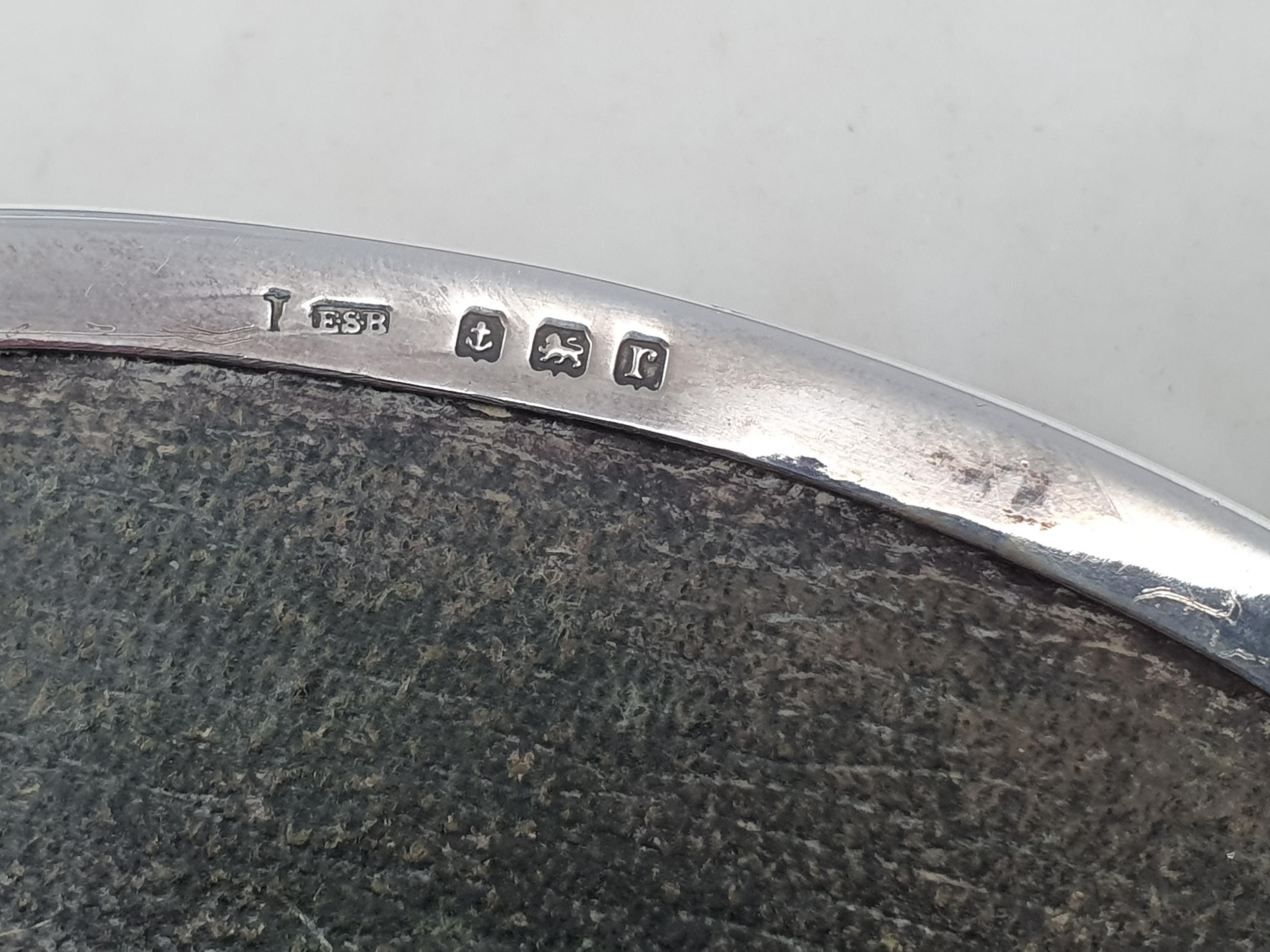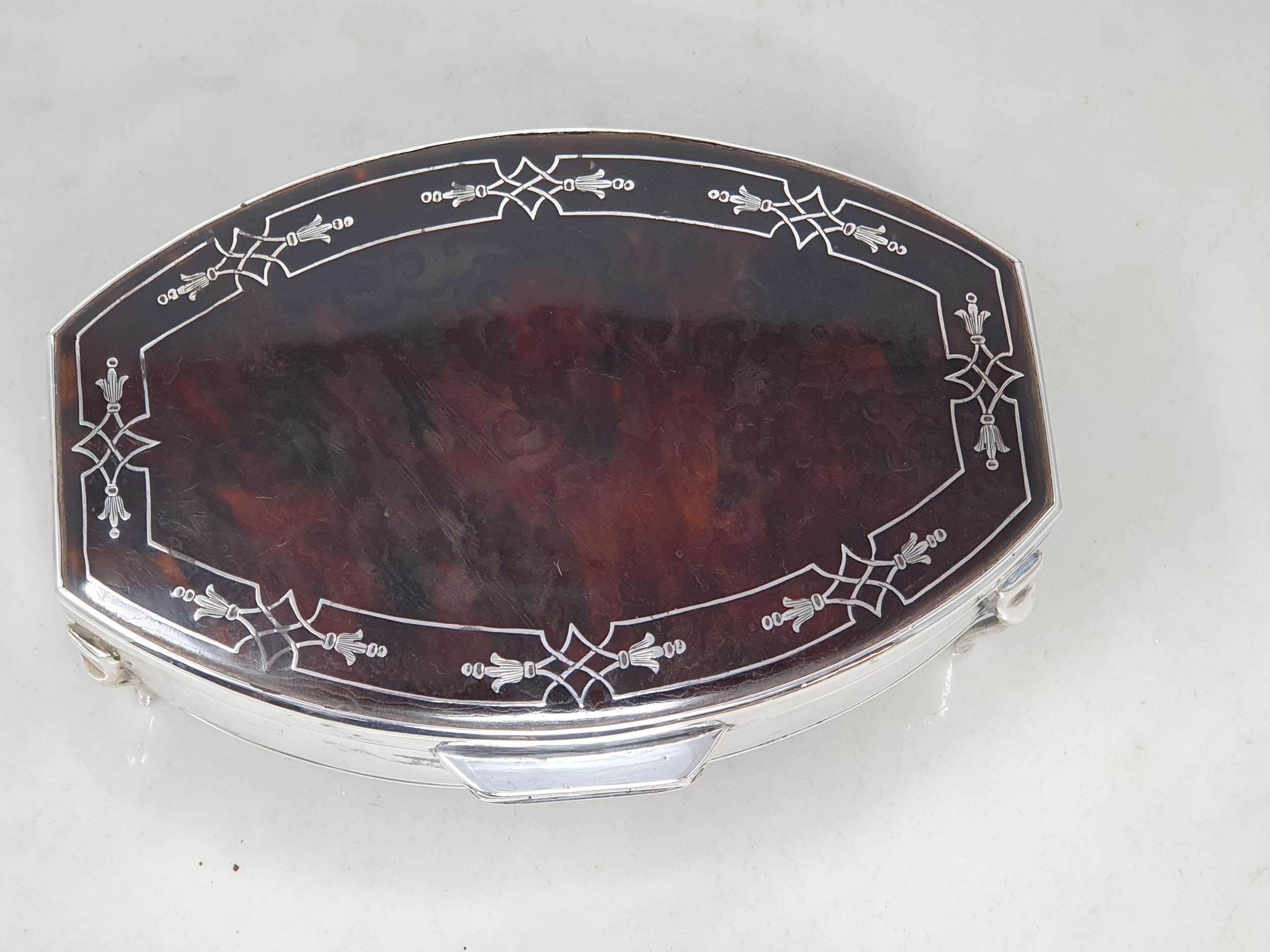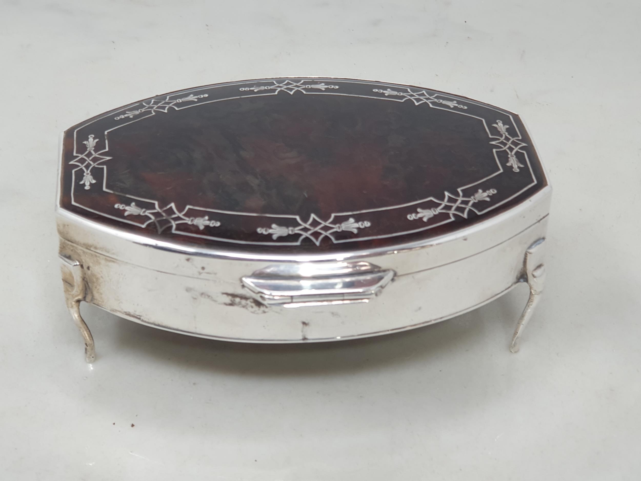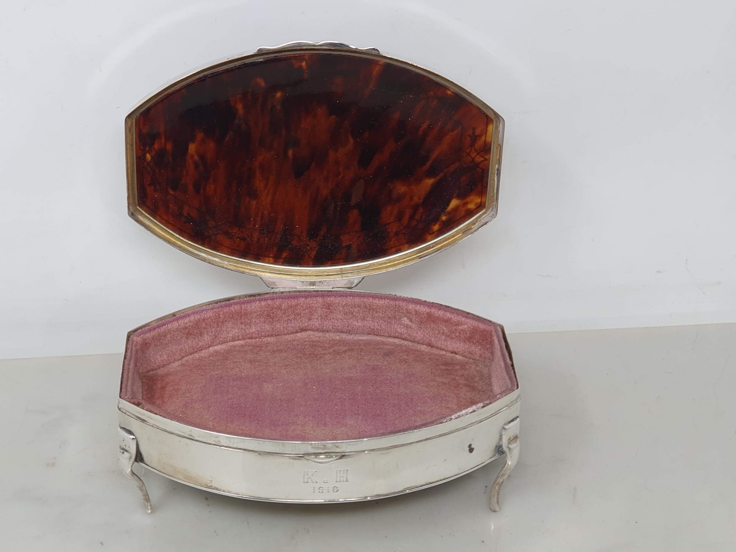 A George V silver and tortoiseshell Trinket Box with inlaid frieze on four shaped supports, Birmingham 1916, 5in