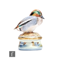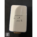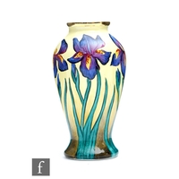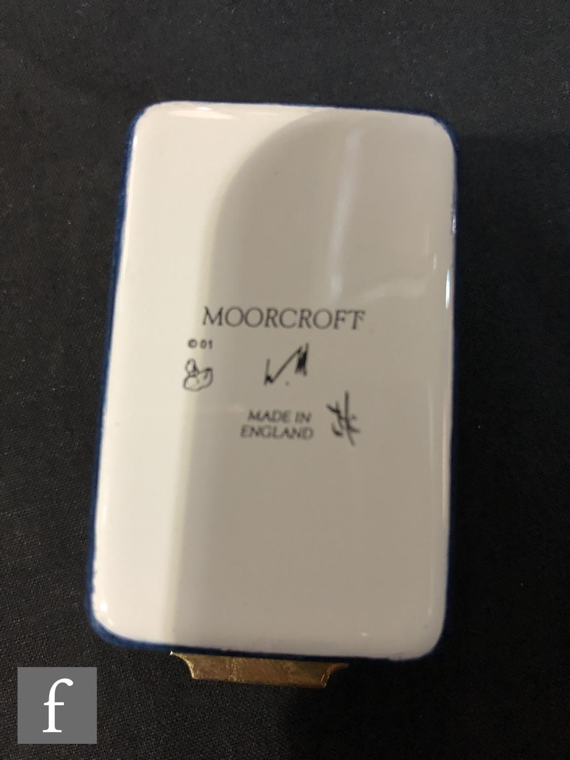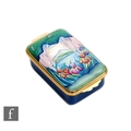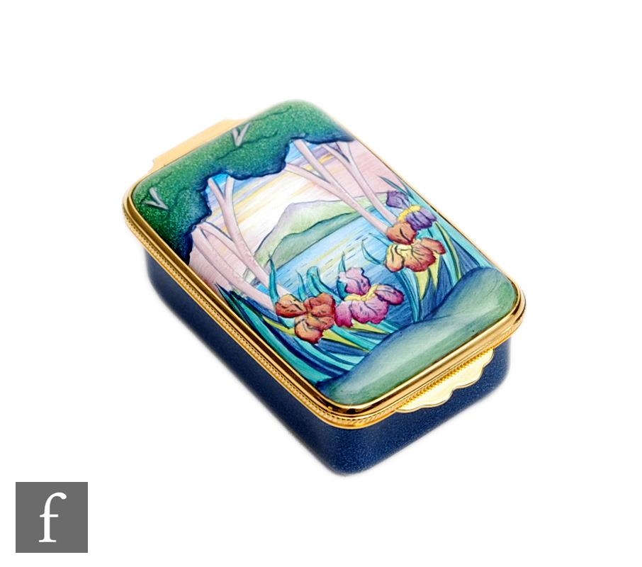 A Moorcroft Enamels rectangular trinket box decorated with hand painted flag iris before a mountainous landscape, printed mark, boxed, 5.5cm x 4cm.