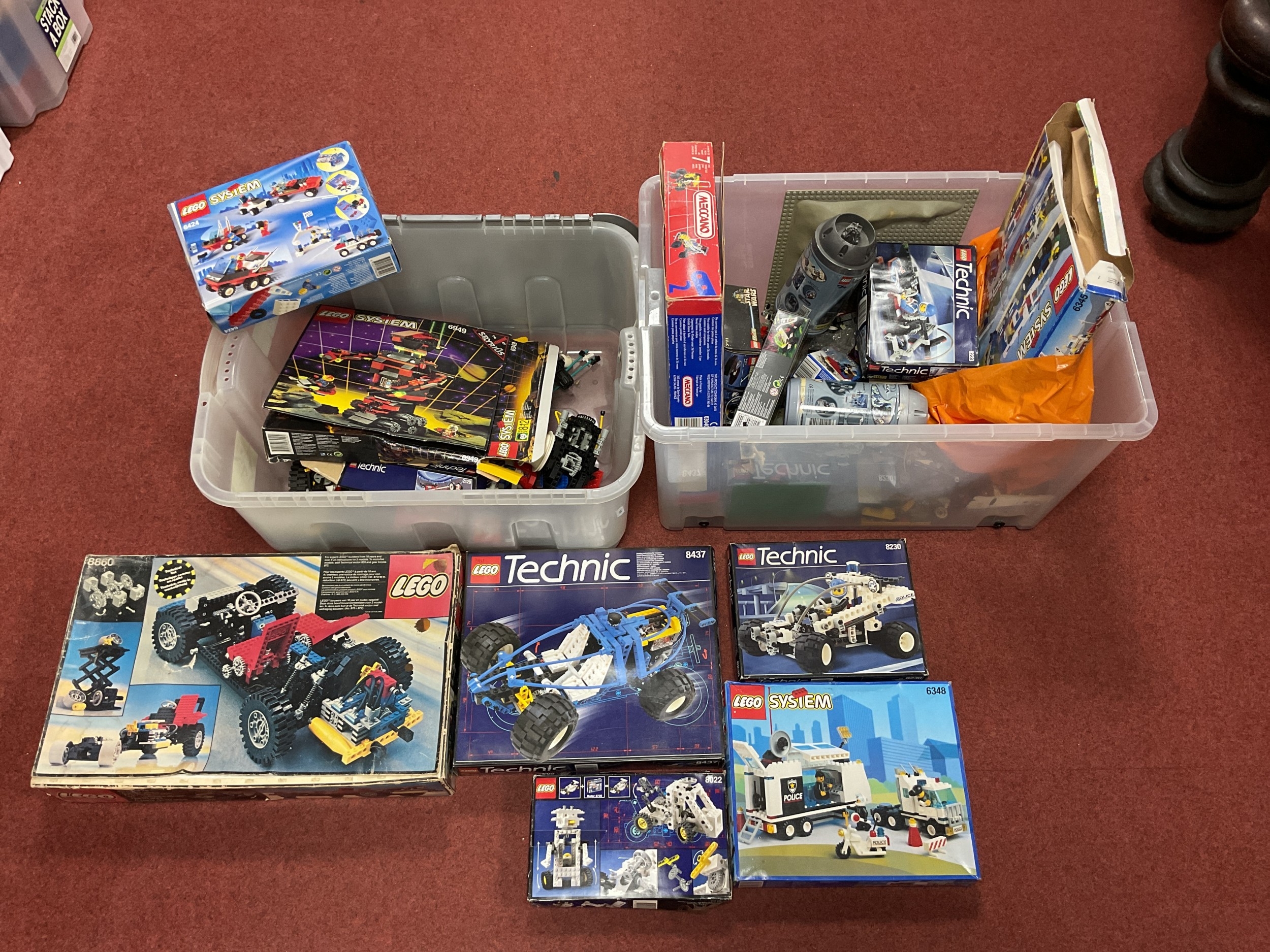 A quantity of boxed and loose Lego to include #6348 Surveillance Squad, Technic #8437 Future Car, #8860 Car Chassis (incomplete), Technic #8230 Coastal Cop Buggy. All boxed sets are unchecked for completeness of all parts. Bidder to assure themselves for completeness. Together with a modern Meccano Set (incomplete). (Two Boxes).