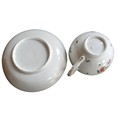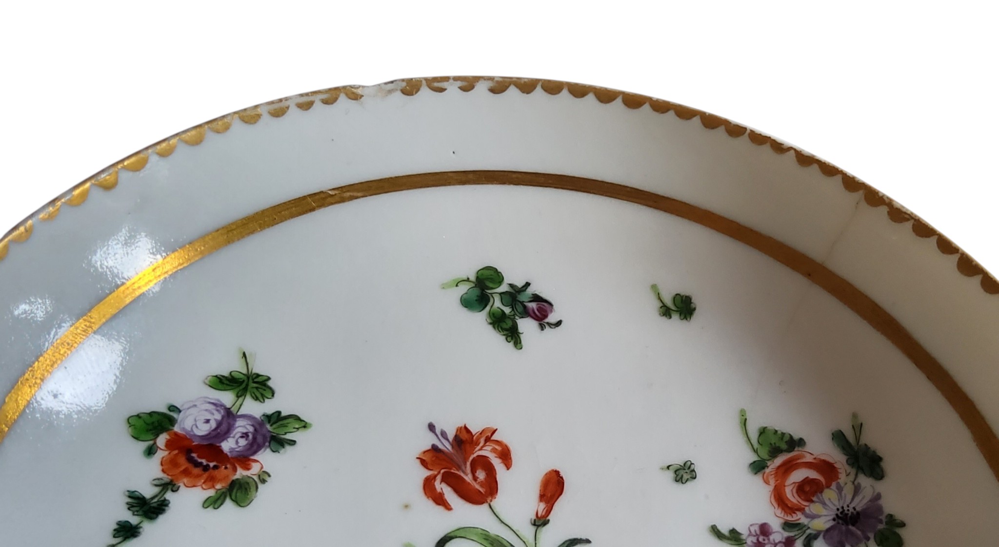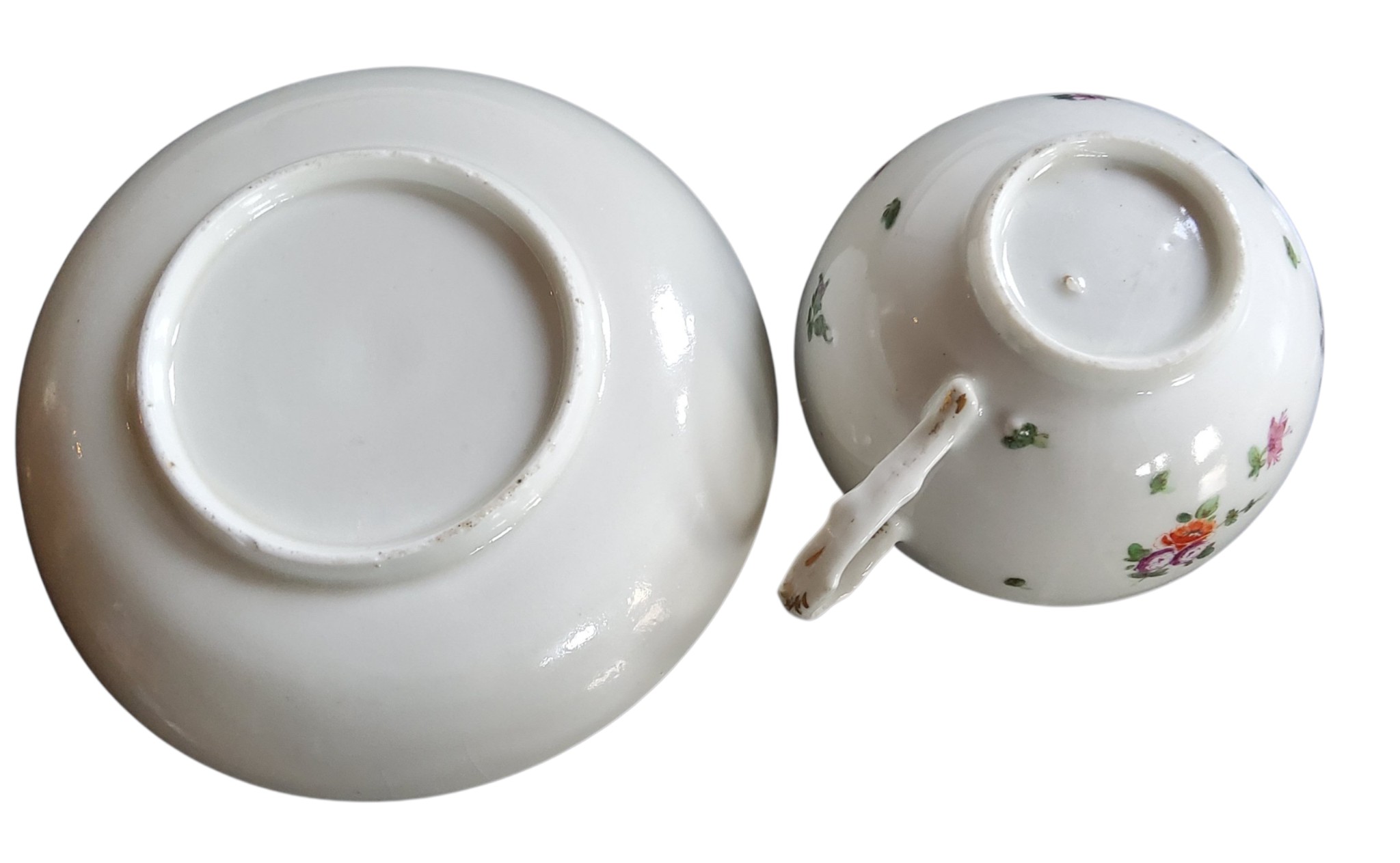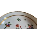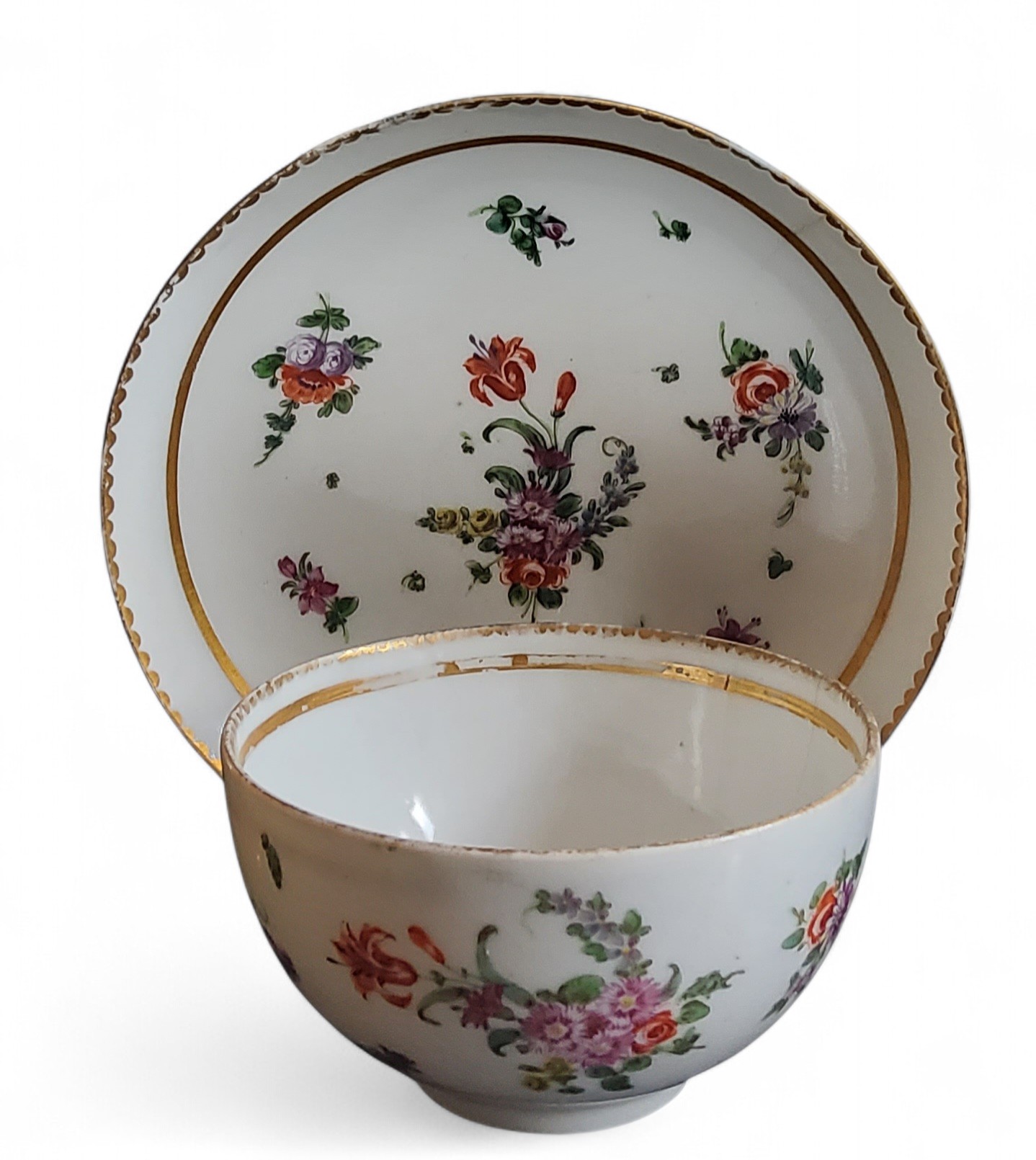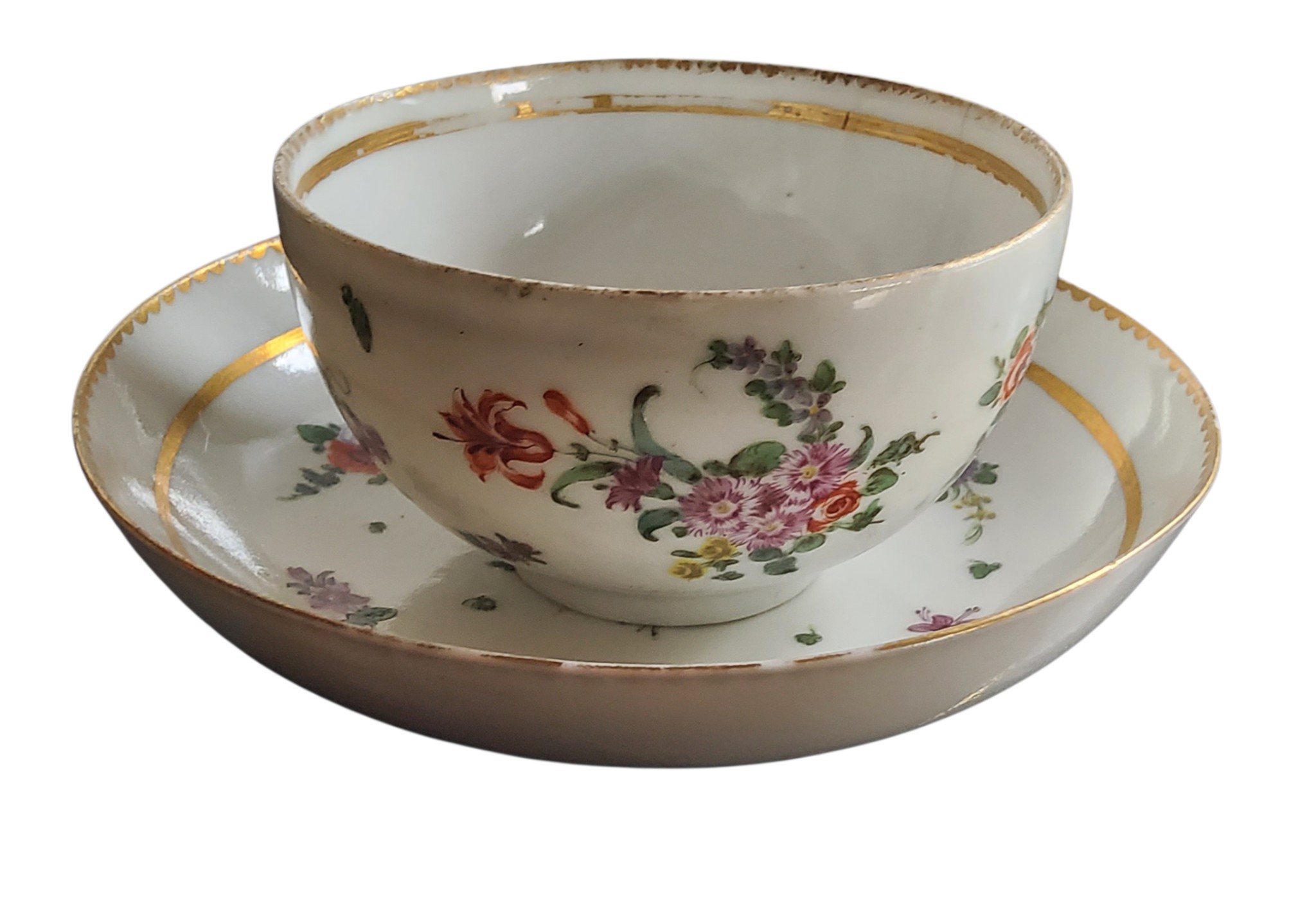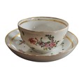 A Bristol cup and saucer, decorated in polychrome with scatter sprays, gilt line border, dentil rim, c.1770