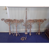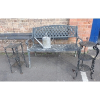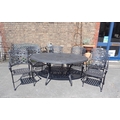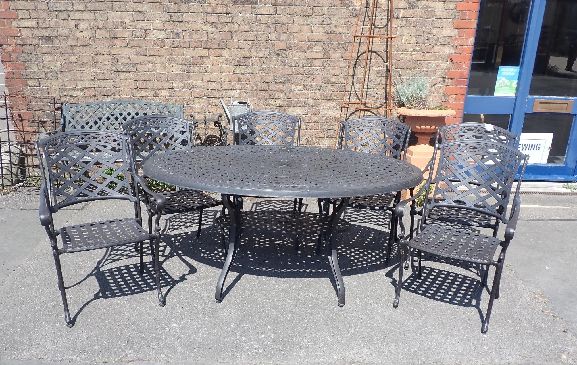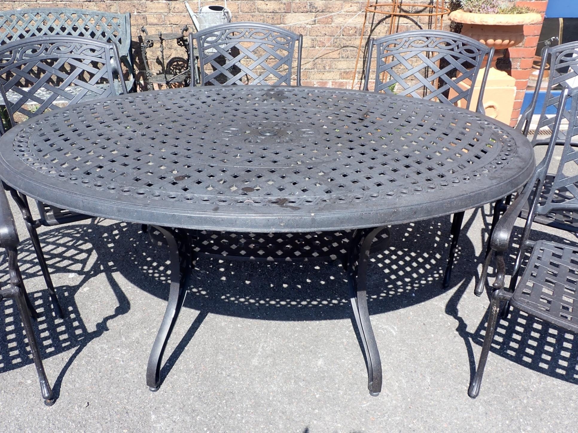 A CAST METAL OVAL GARDEN TABLE AND SIX CHAIRSwith lattice design, the table 115 x 168cm