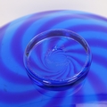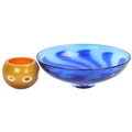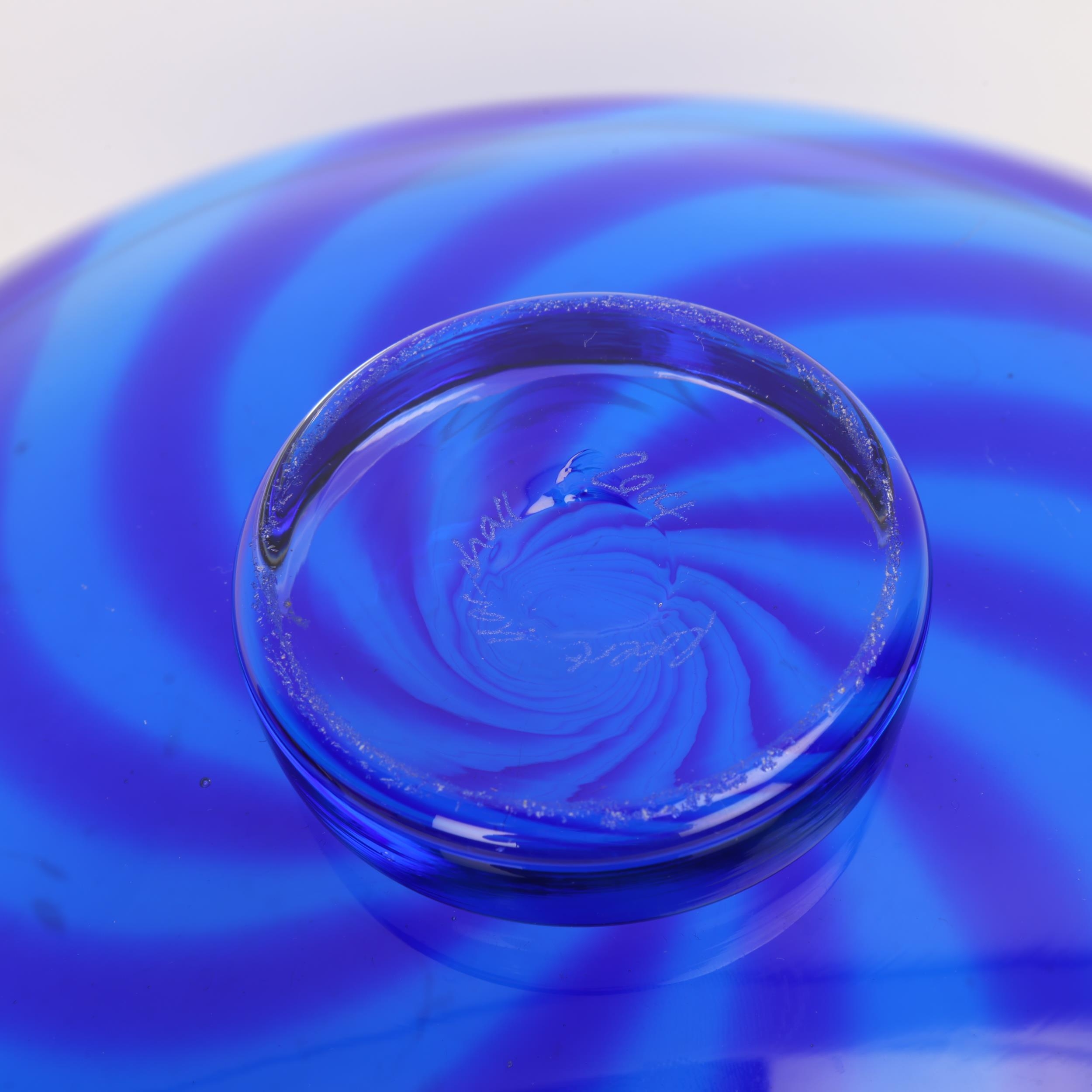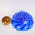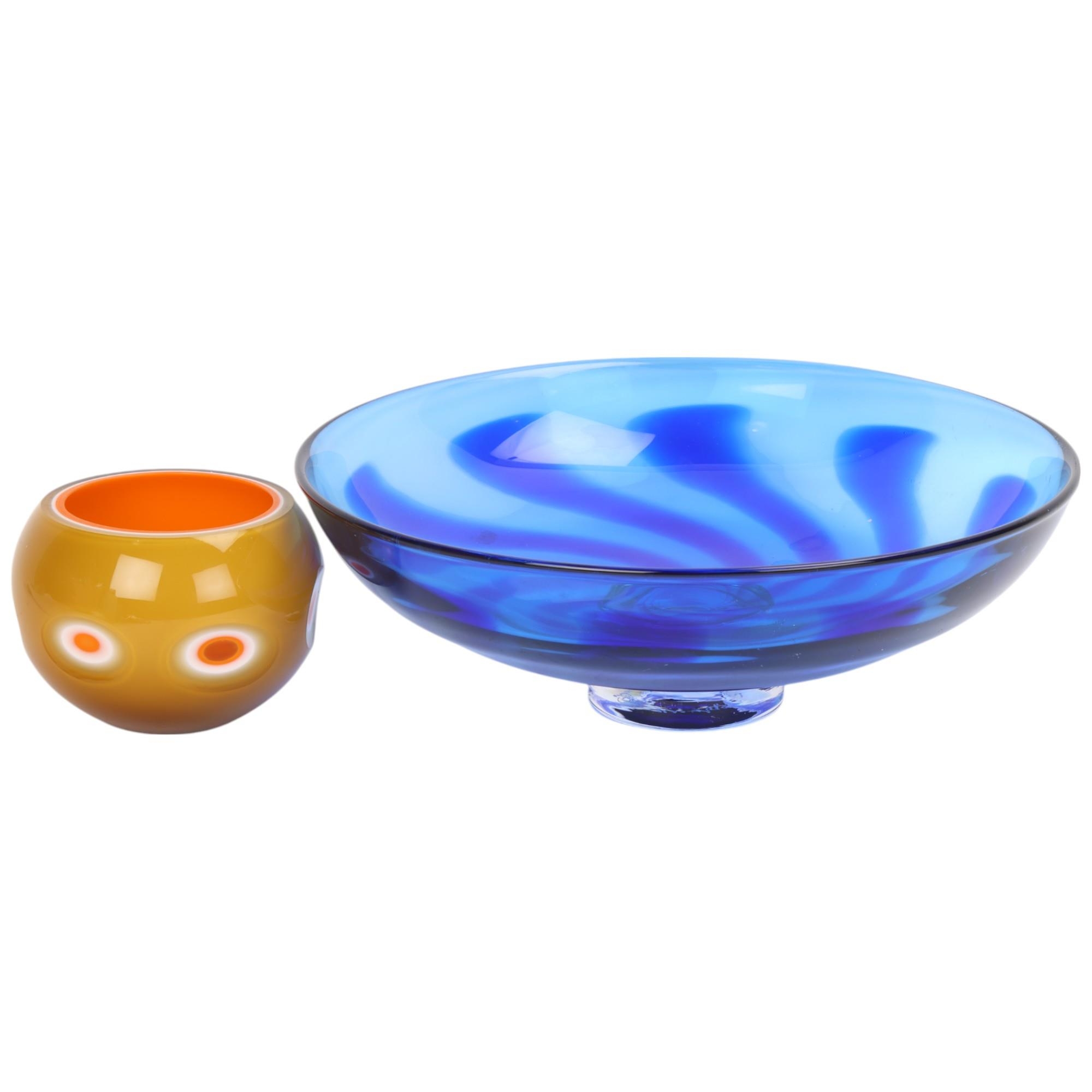Robert Marshall, a hand made studio glass pedestal bowl, with blue swirl pattern, signed to base, diameter 26cm, together with a layered orange/white/amber bowl, unsigned