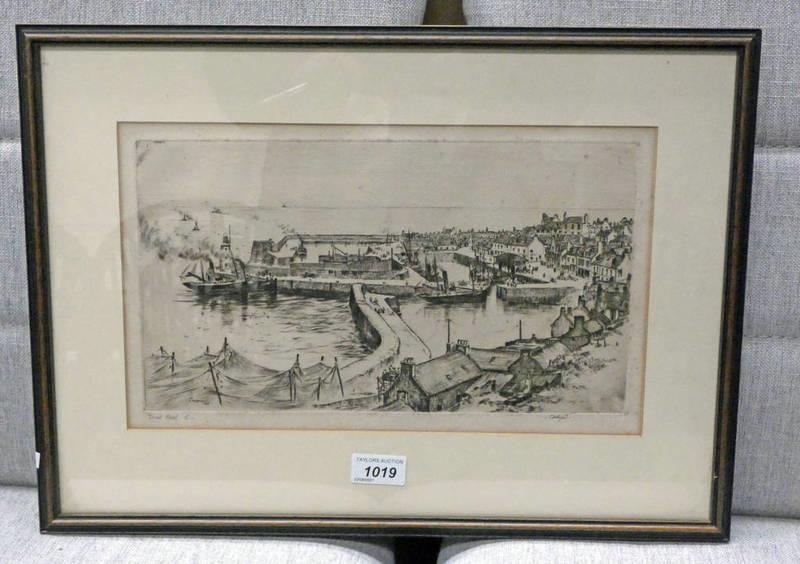 JAMES CADZOW, MACDUFF HARBOUR, SIGNED, FRAMED TRIAL PROOF ETCHING, 19 X 33 CM