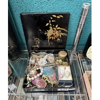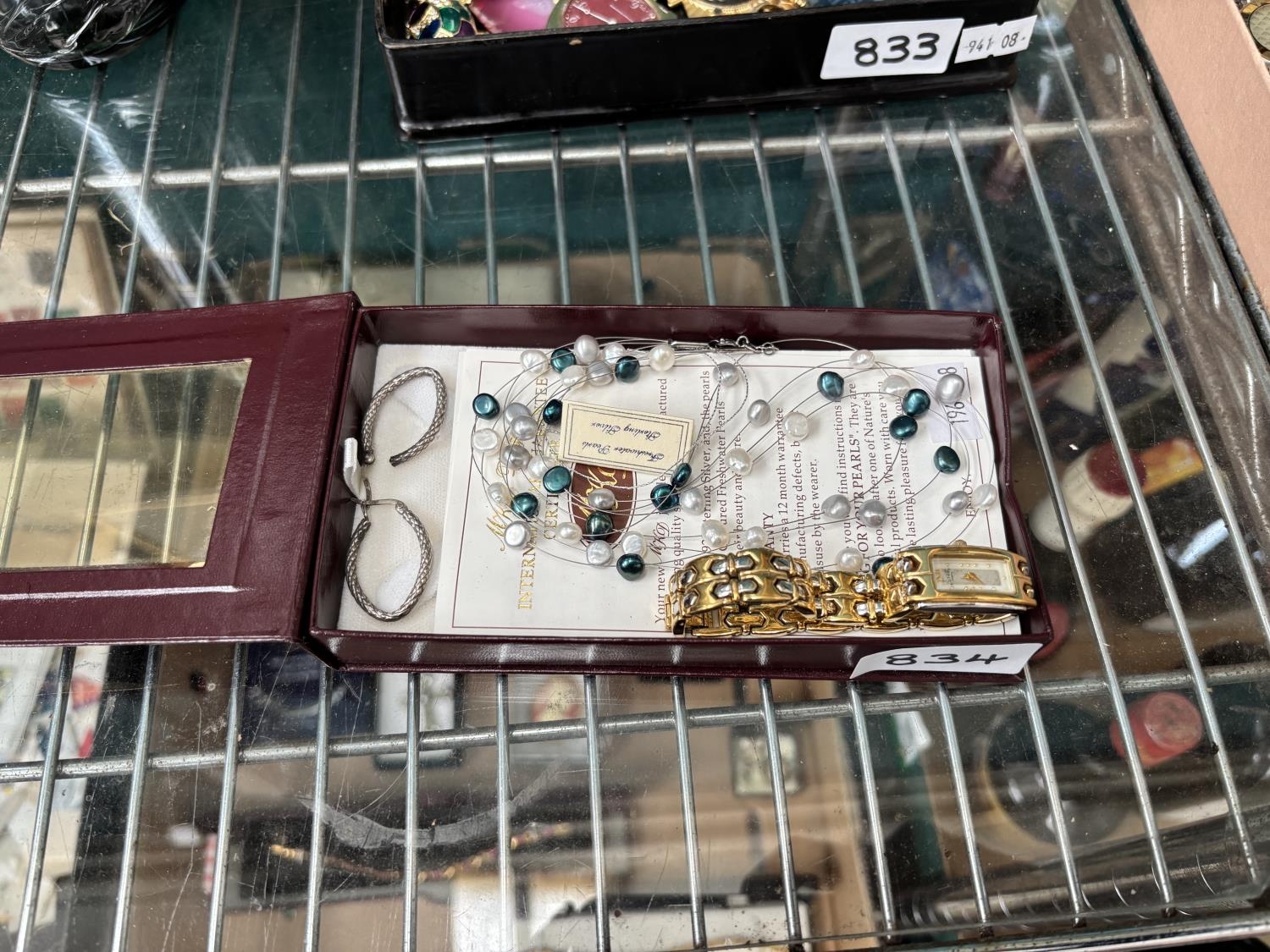 Mother of pearl faced Rotary watch, silver earrings and a pearl necklace