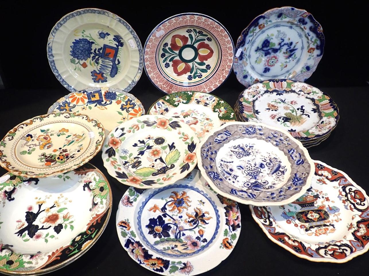 A COLLECTION OF 19th CENTURY AND LATER DINNER PLATESironstone and others, a spongeware soup plate, and an oval drainer (some a/f)