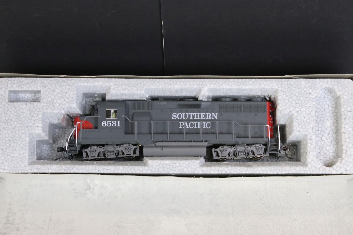 Three boxed Kato HO gauge Southern Pacific locomotives to include 37-11C #1906, 37-1205 #8100 (some box damage) & 37-02C #6531