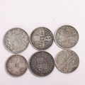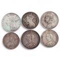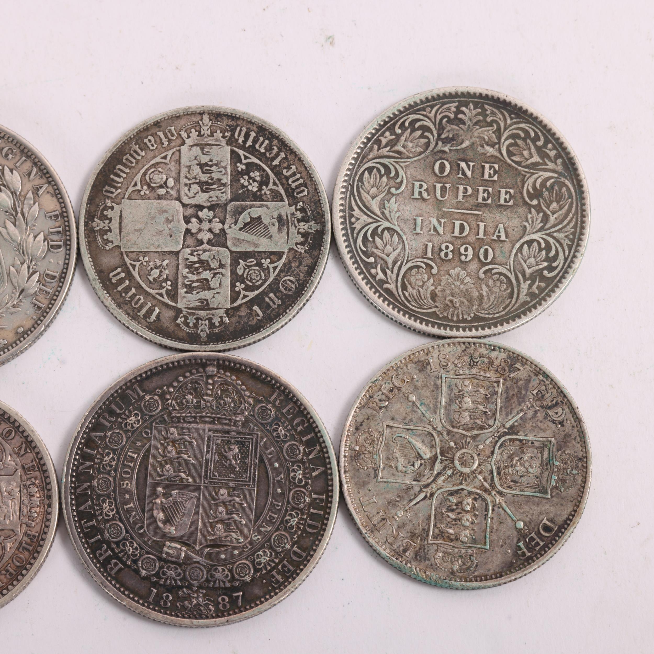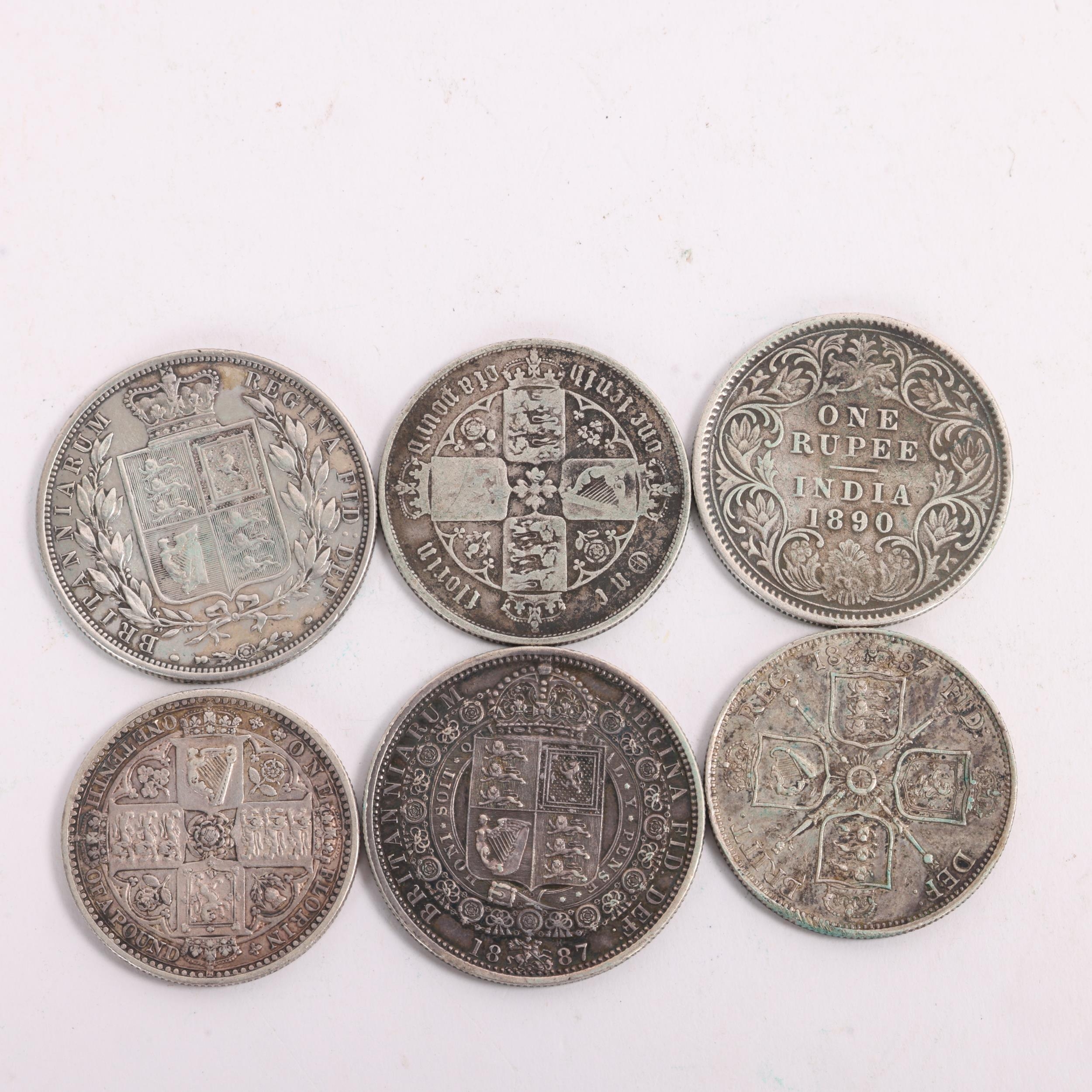 6 Queen Victoria silver coins, 2 x 1887 Halfcrowns (1 young, 1 old head), 3 x Florins 1849, 1887, 1860s? and an 1890 One Rupee coin