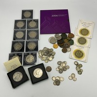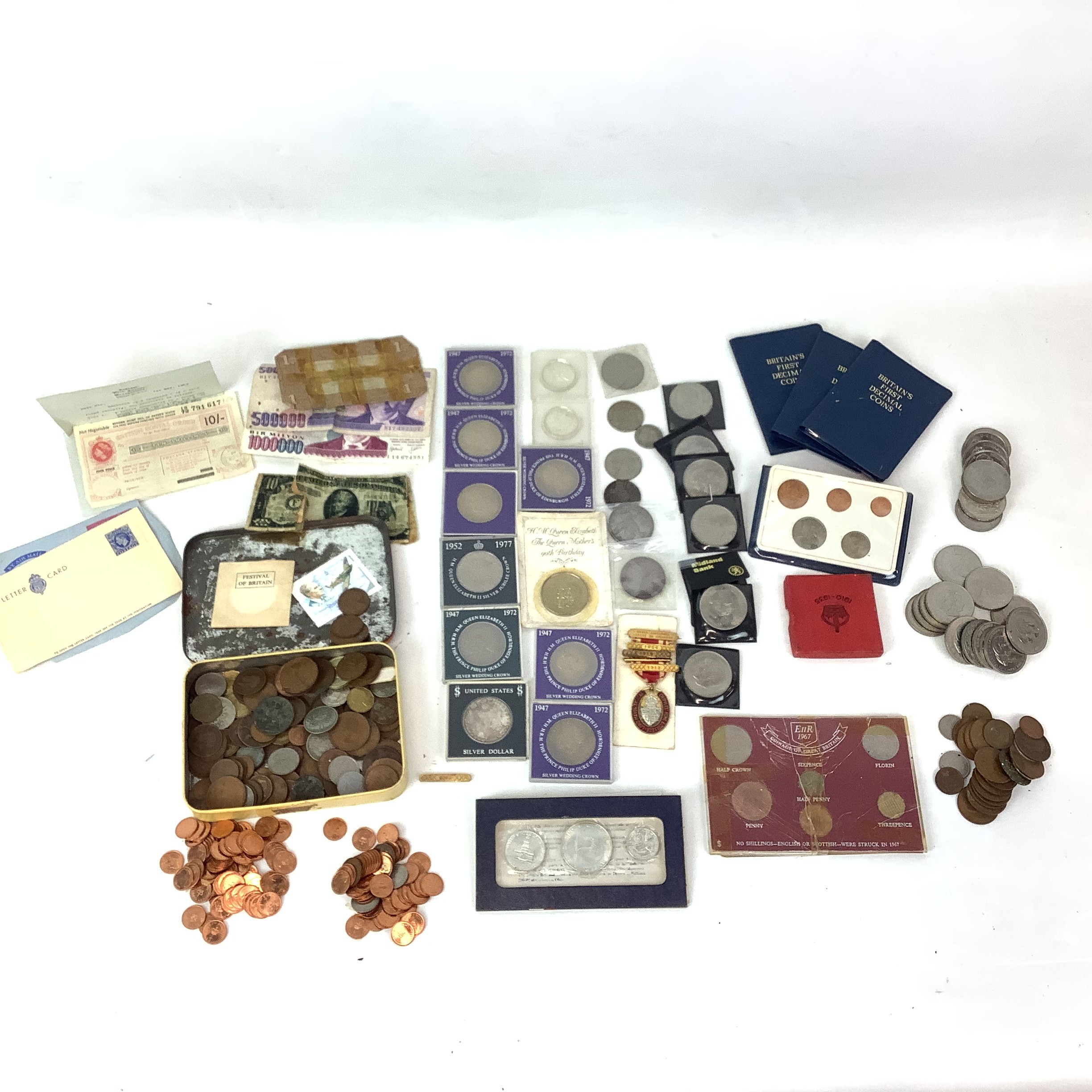 English and American coinage, to include 1935 crown, 1881 S Morgan Silver Dollar, 1884 O Morgan Silver Dollar, four Britain's First Decimal Coins sets and an assortment of commemorative coins, etc.