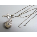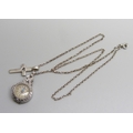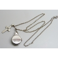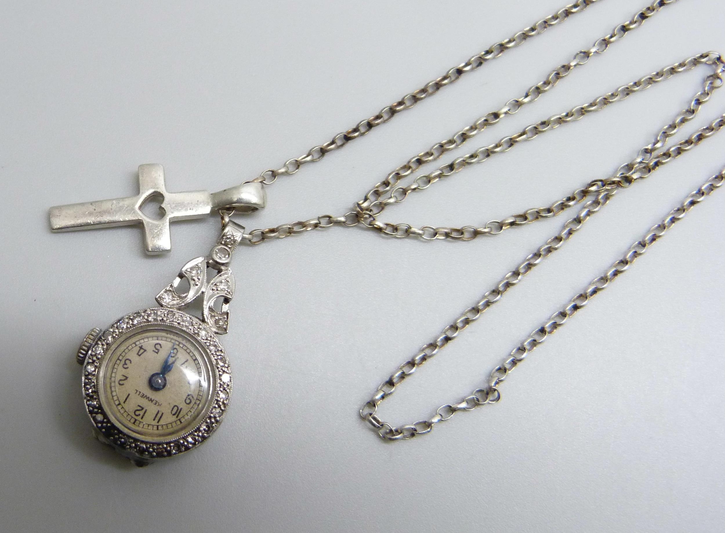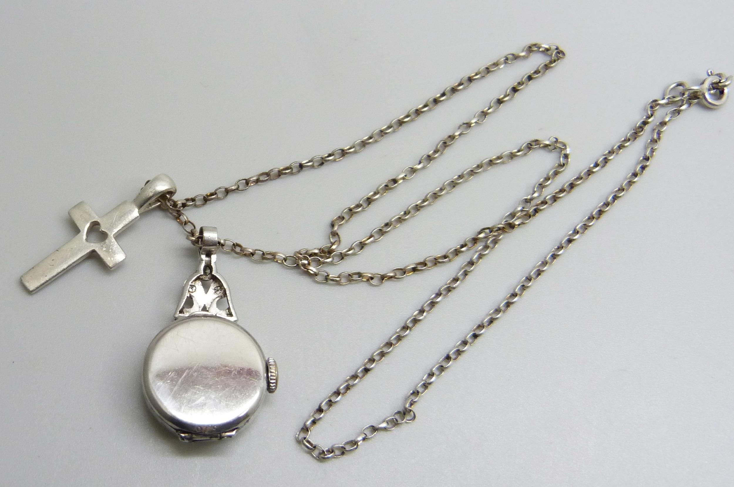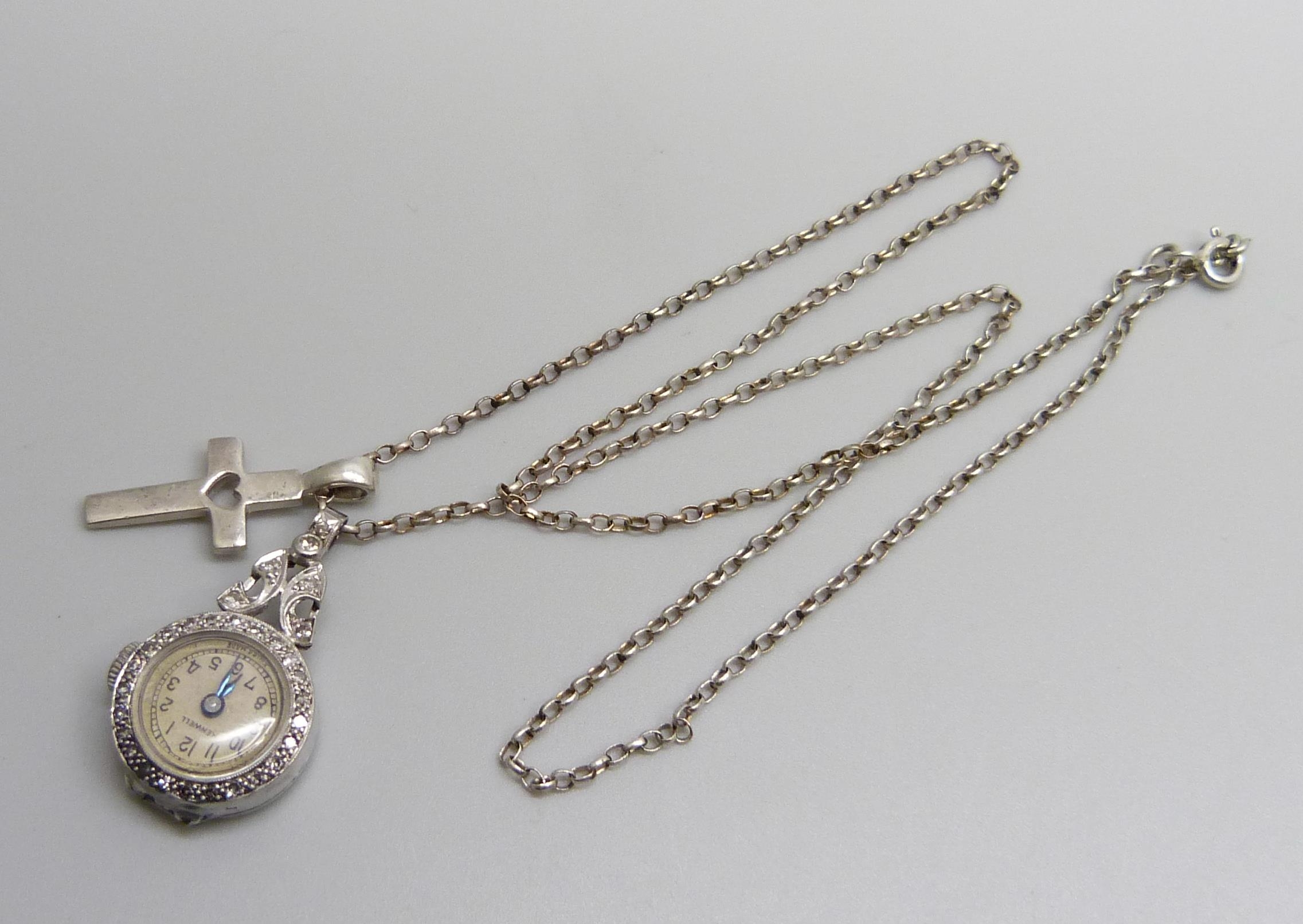 A palladium cased diamond set pendant watch and a silver cross pendant on a silver chain