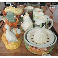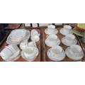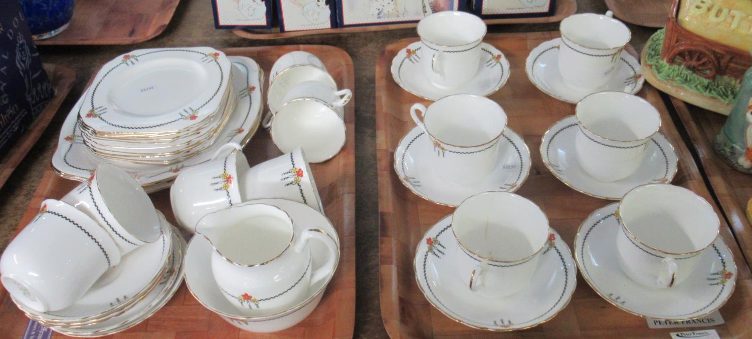 Two trays of Plant Tuscan part teaware decorated with stylised orange and yellow flowers and a Greek key border black and guilt edging. Comprising 12 tea cups and 11 saucer, 10 tea plates, 2 sandwich plates, sugar basin and milk jug.