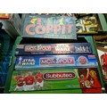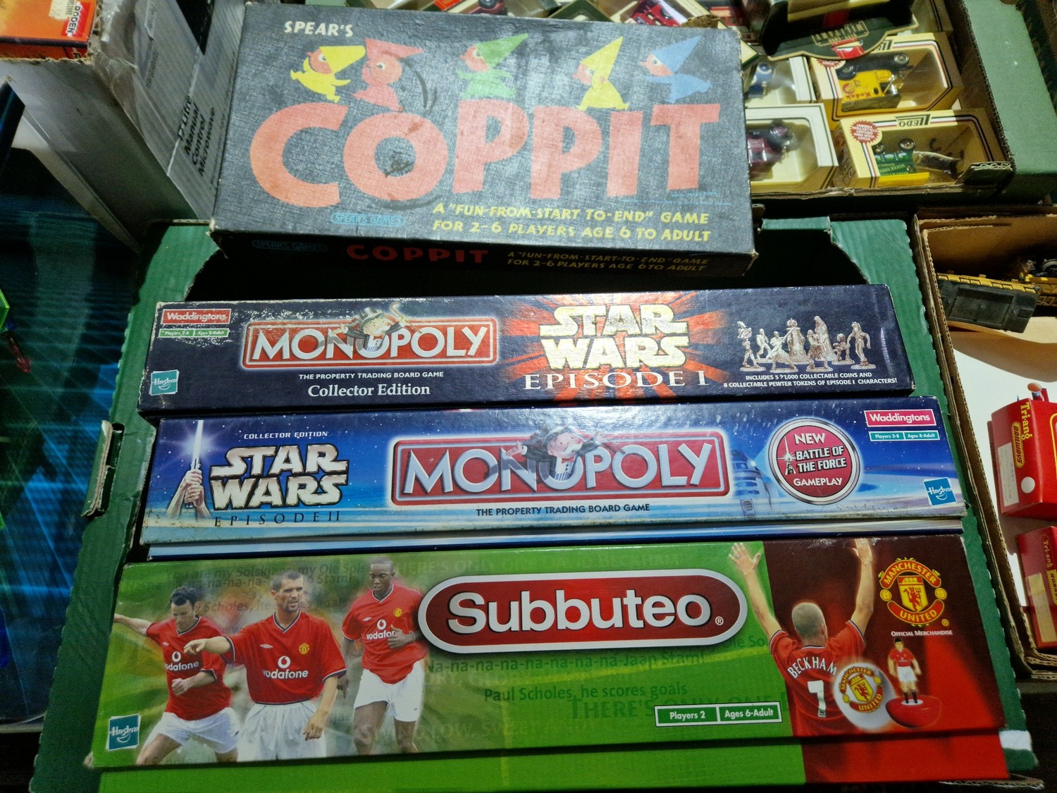 A box of games comprising 2 x Star Wars Monopoly (episode I & episode II), Manchester Unted Subbuteo (unused) and a vintage Coppit game.