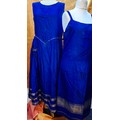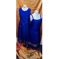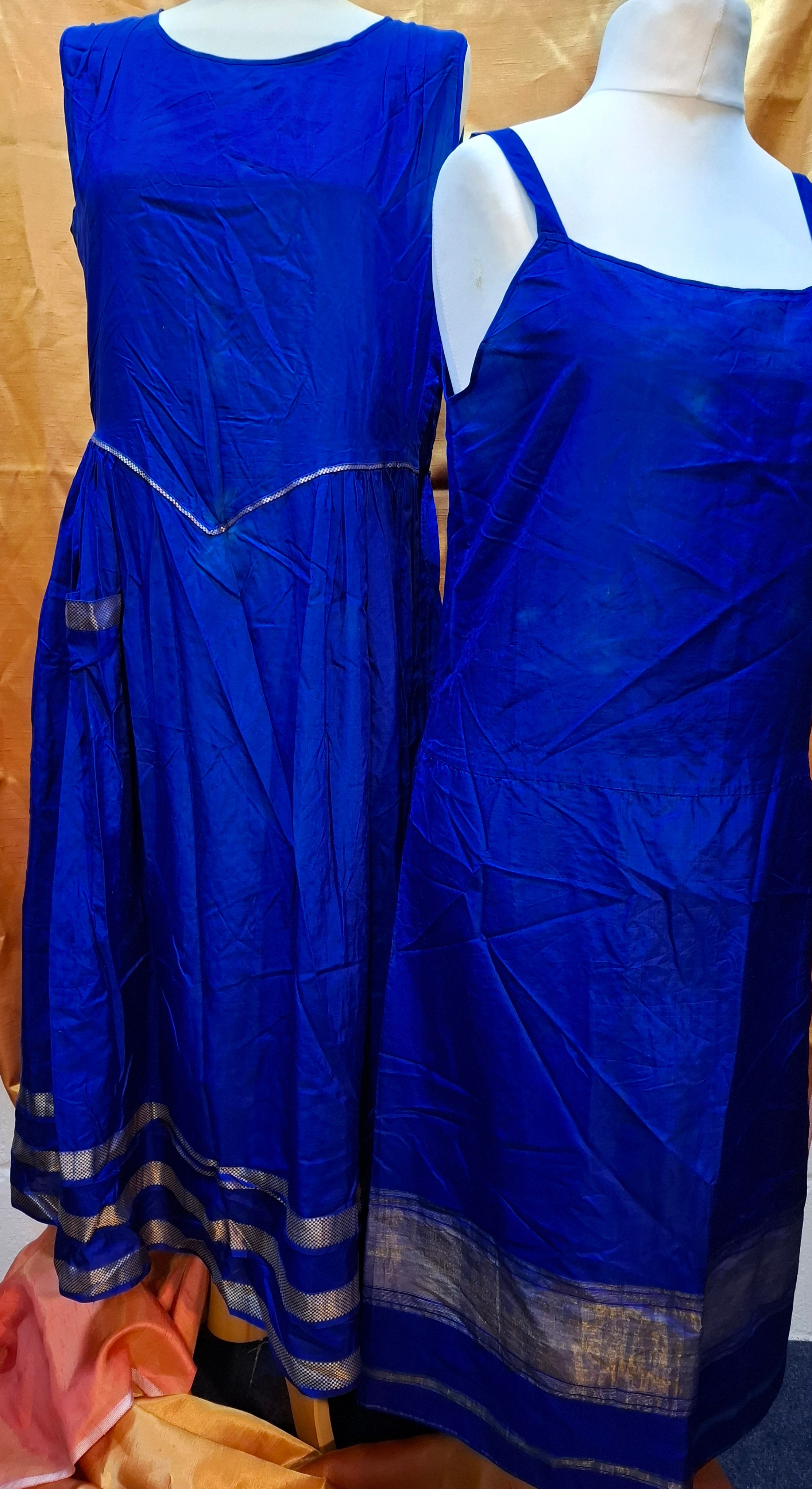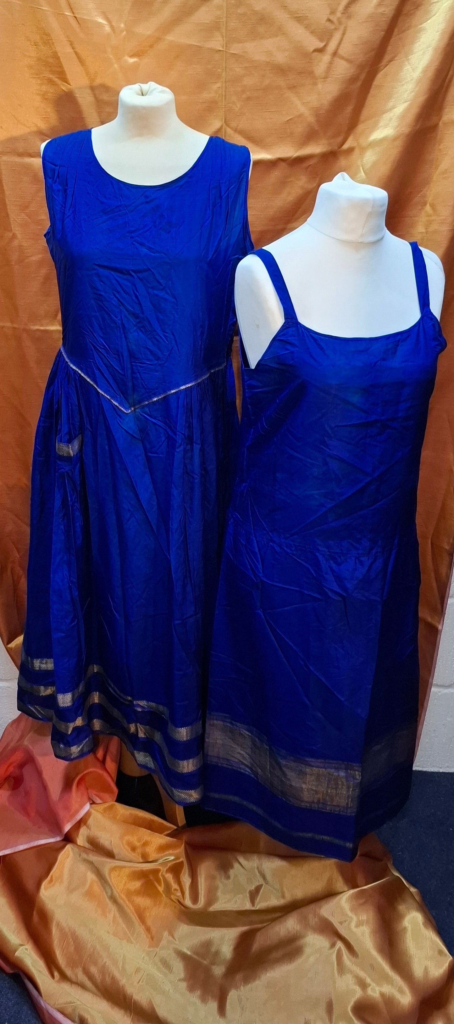 A vintage cobalt blue silk sleeveless dress with gold coloured trim approx 38" chest and another approx 36" chest together with a bolt of 9m of gold coloured material. Location: Rail
