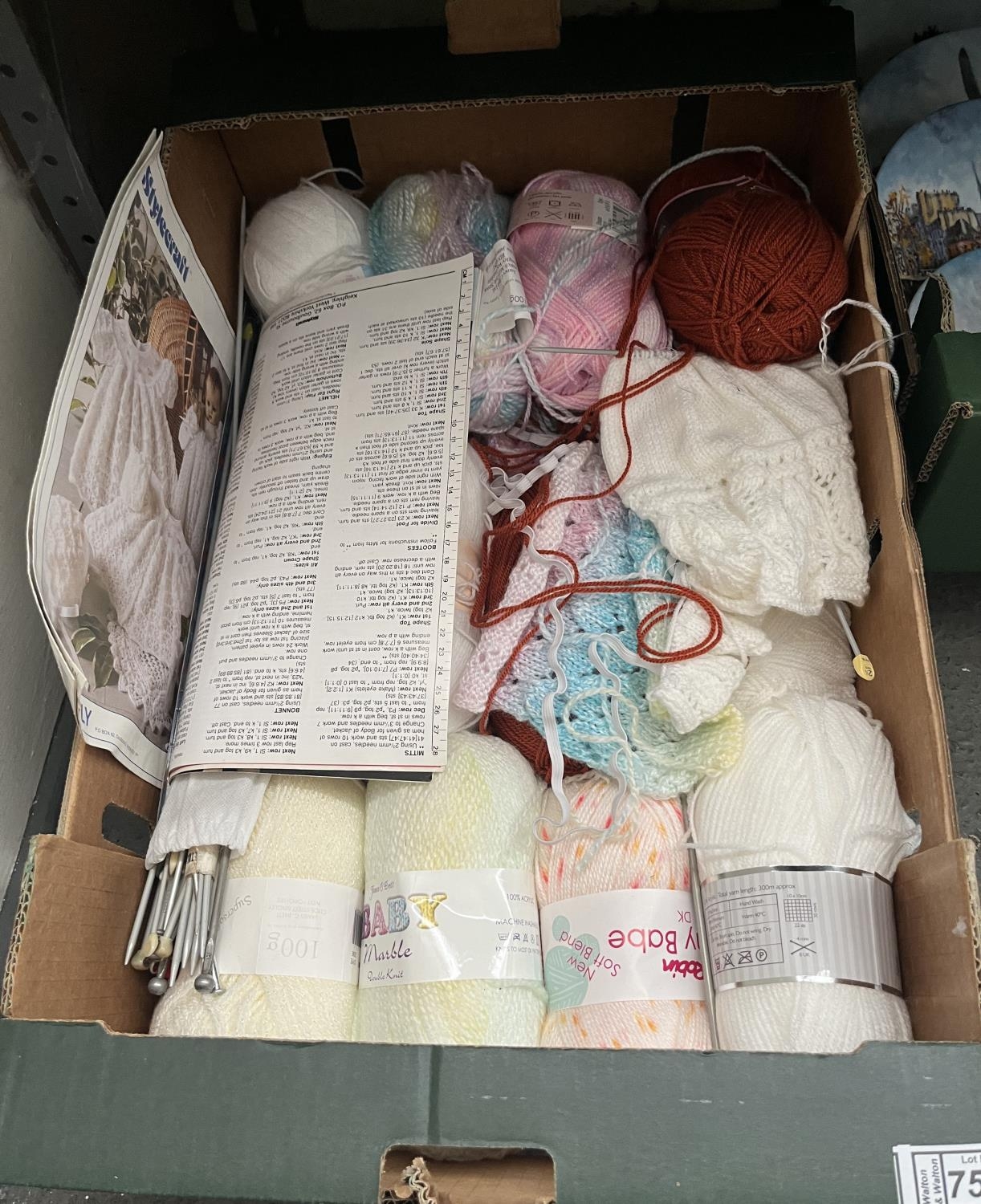 Box containing new wool and knitting needles