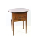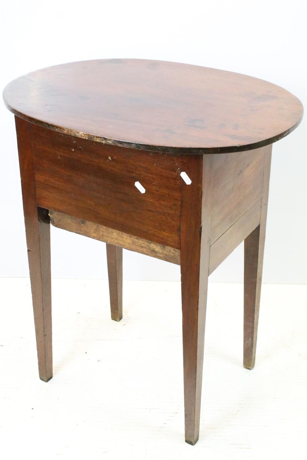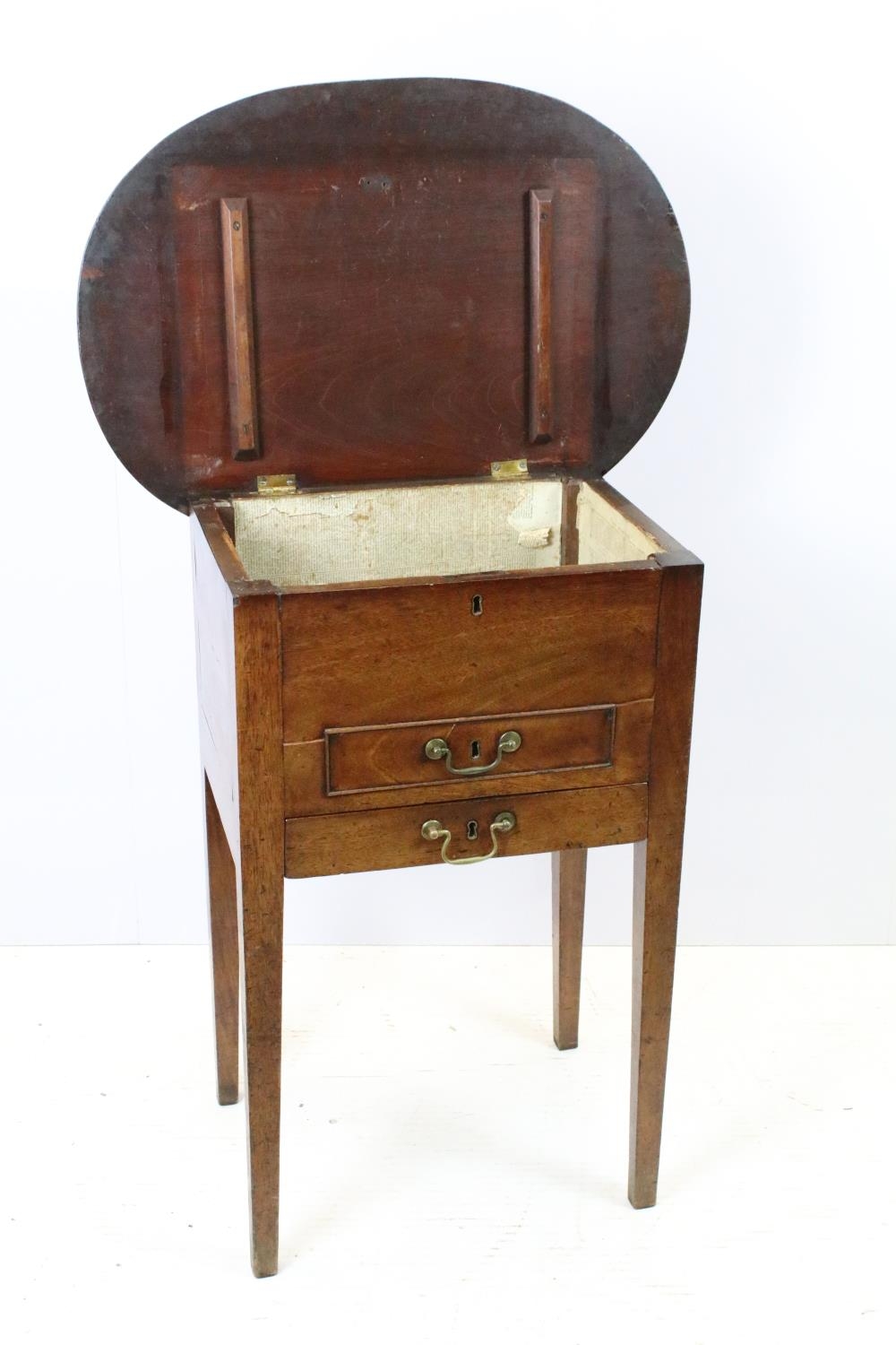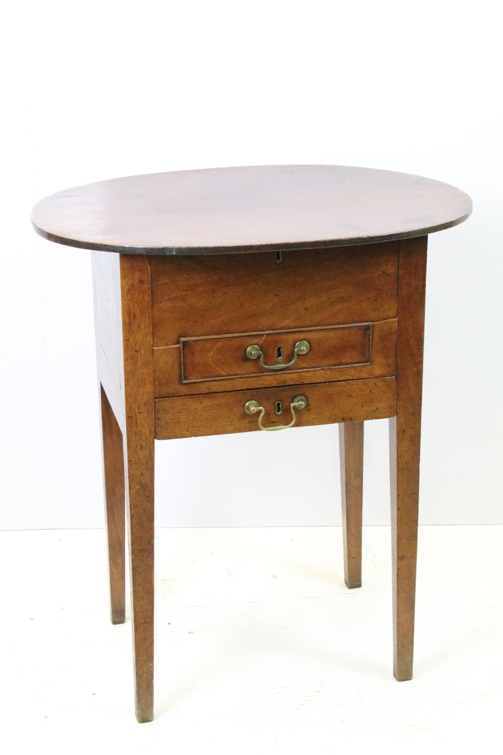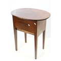 Victorian mahogany sewing box table, the oval lift up lid revealing storage inside, with one faux drawer and one further drawer below, on square tapering legs, 74.5cm high x 64cm wide x 47.5cm deep
