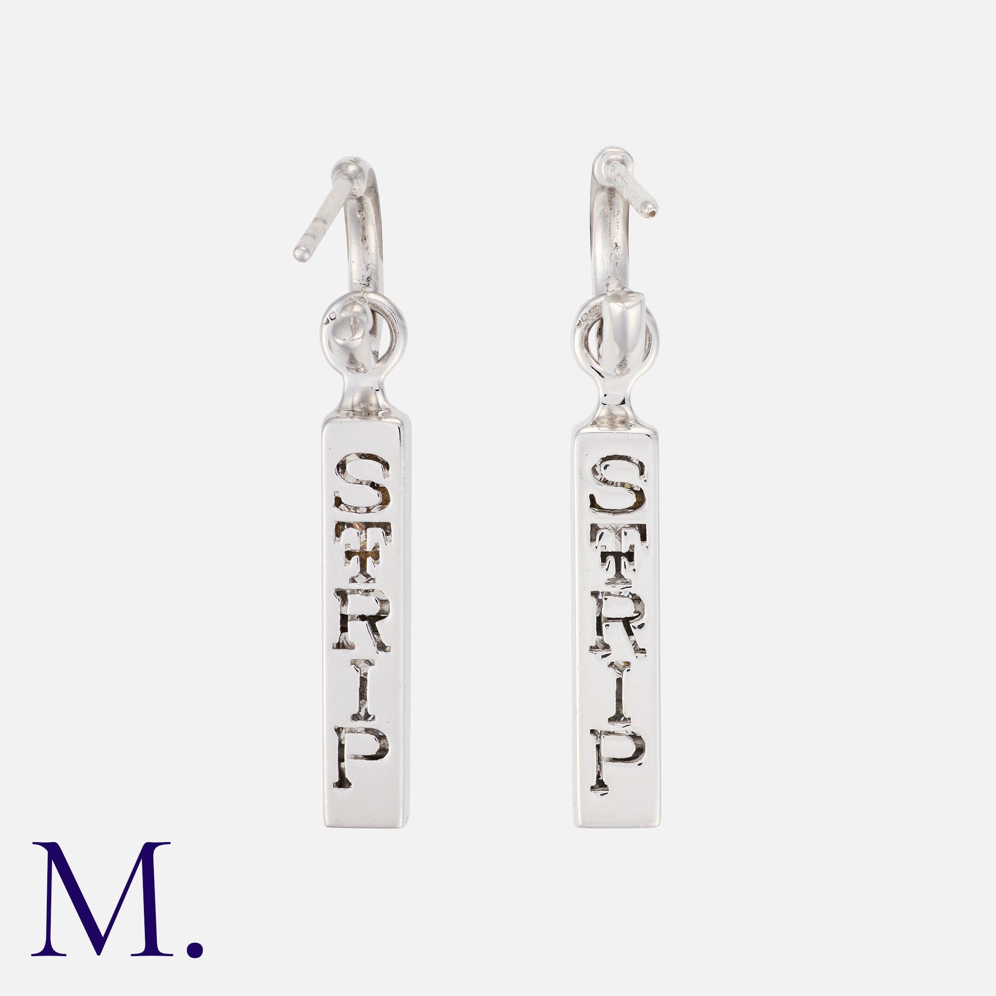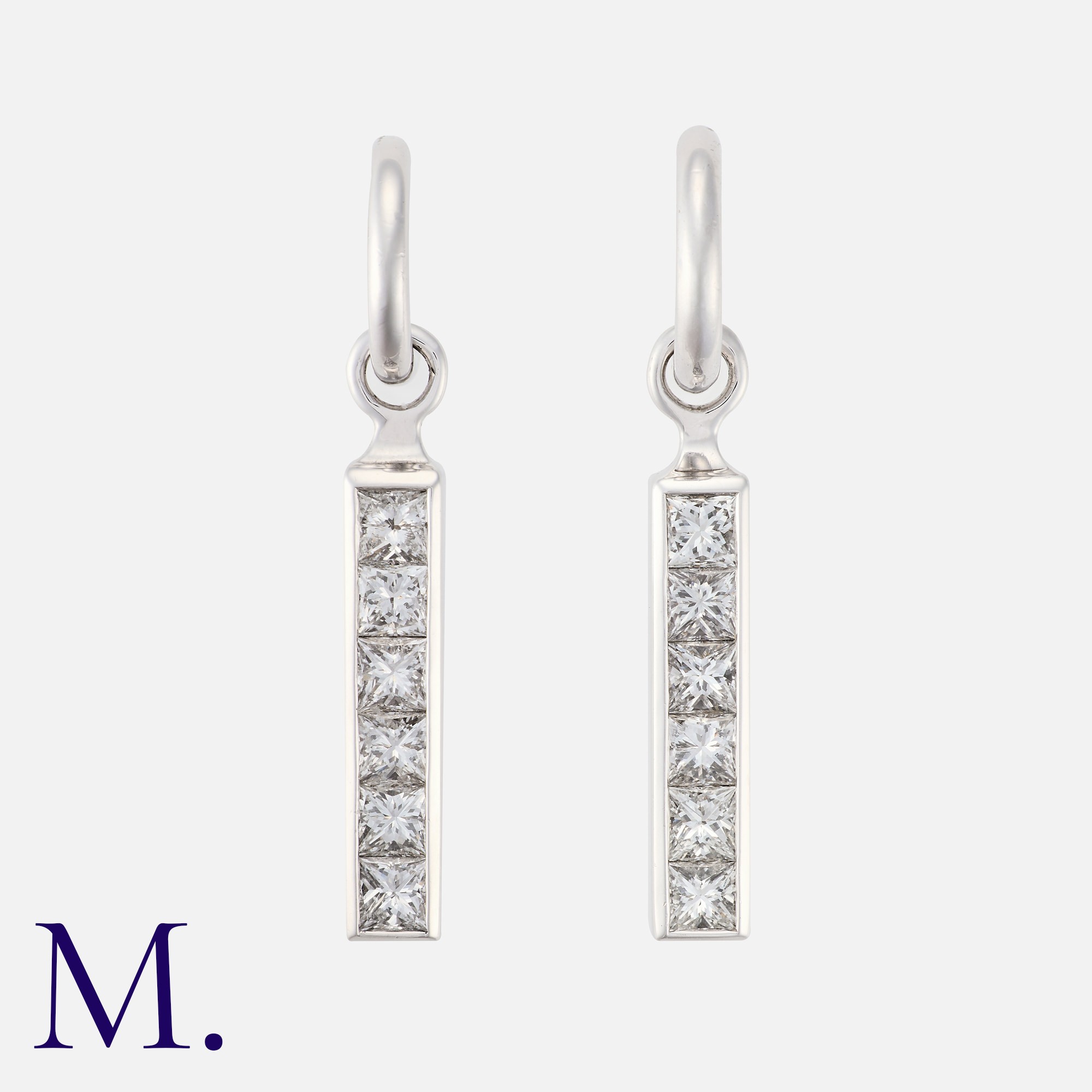 THEO FENNEL A Pair Of Diamond 'STRIP' Earrings in 18k white gold, each comprising a row of six princess cut diamonds totalling approximately 1.80cts. The reverse engraved 'strip'. THEO FENNEL makers mark, Hallmarked for 18 carat gold.