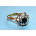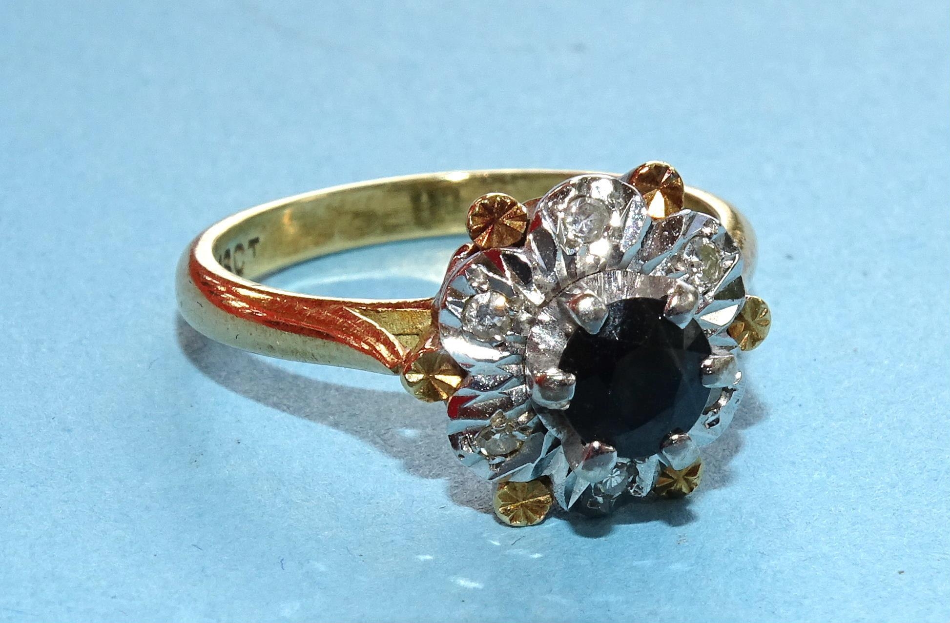 An 18ct gold ring set sapphire and 8/8-cut diamond cluster, size O, 6.4g.