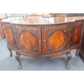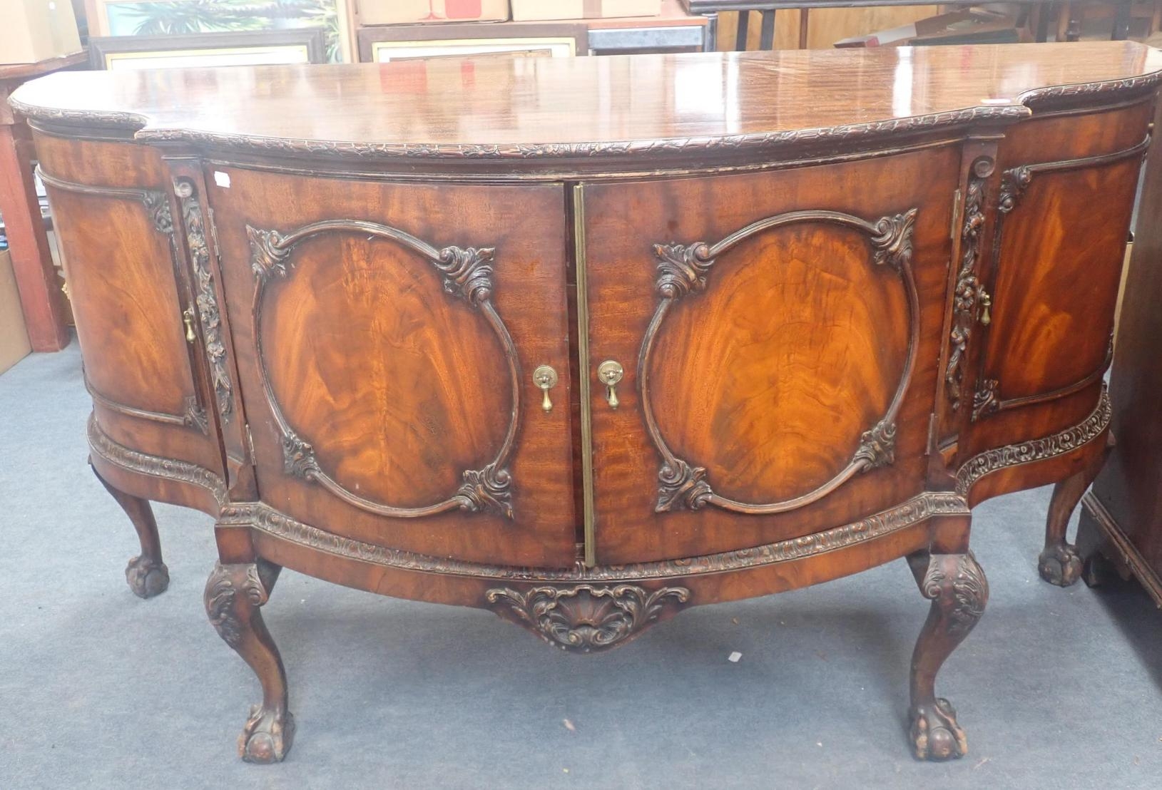 A GEORGE III STYLE MAHOGANY SIDEBOARD of serpentine form, the central doors enclosing drawers, on carved cabriole legs, by Gill and Reigate, London, early 20th century 152cm wide